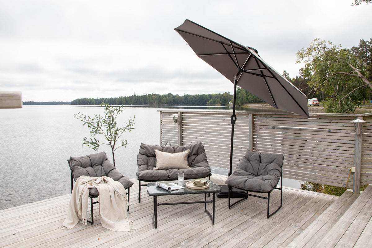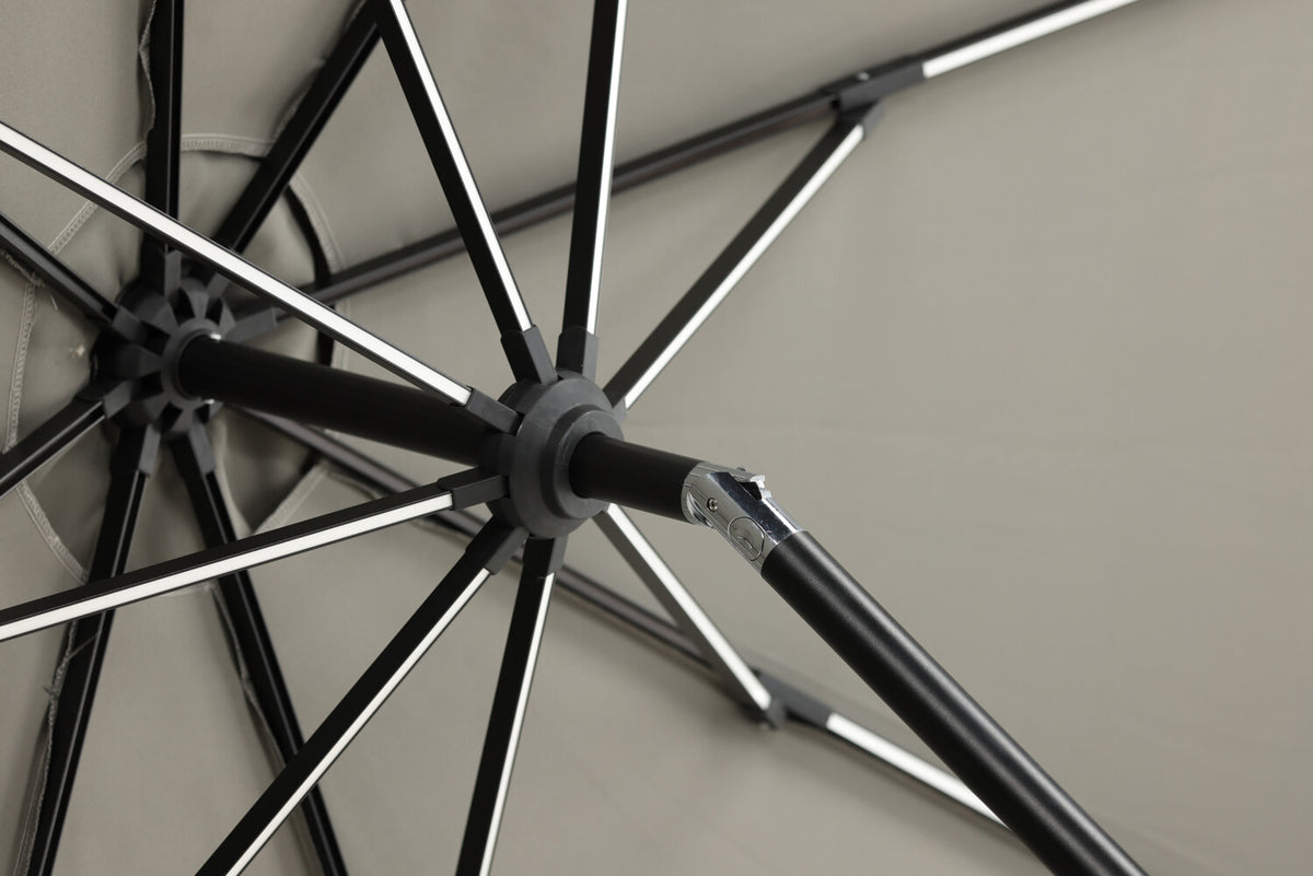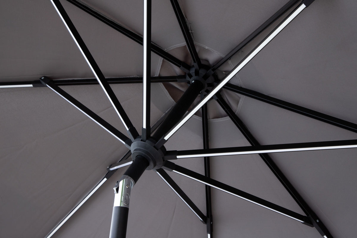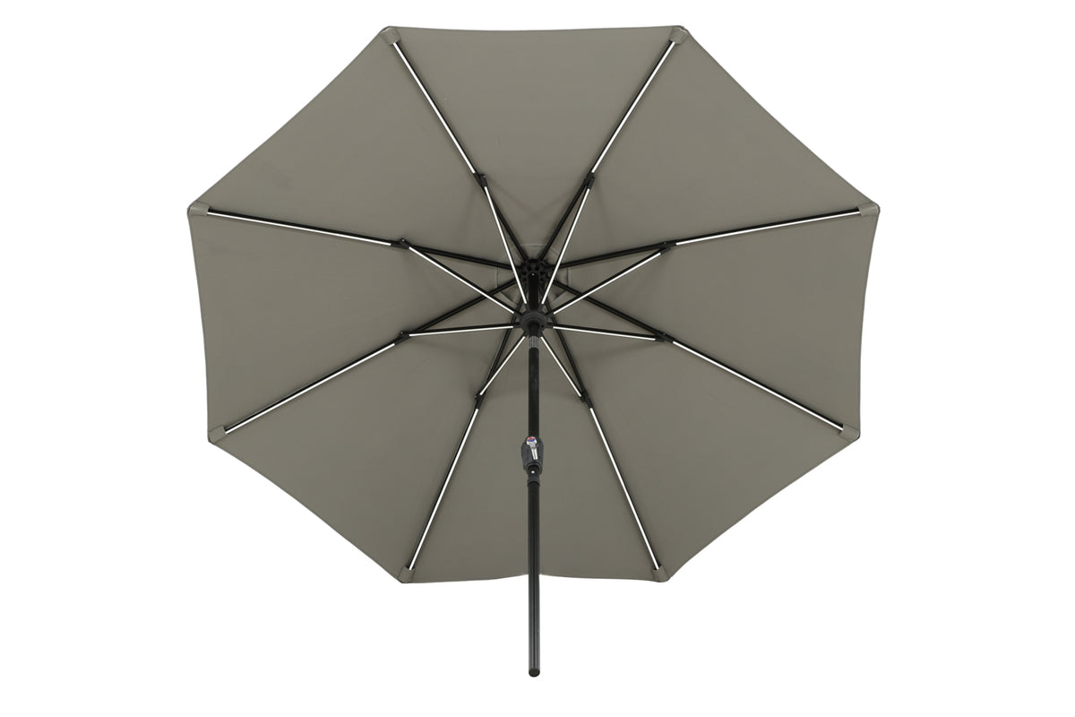 Ett fristående parasoll med grått tyg, perfekt för lata dagar i skuggan! Flytta runt det på din uteplats efter ditt behov. LED-belysningen ger ett mysigt sken på kvällarna. Mått: 270 cm Skötselråd: För våra parasoll rekommenderar vi att man använder sig av parasollskydd. Dra på överdraget när parasollet inte används, det mot sol och minskar därmed risken för solblekning. Överdraget används när parasollduken är torr, annars finns det risk för mögel. Lämna aldrig ett parasoll uppfält när det inte används. Hängparasoll är många gånger känsligare för vindar än vad traditionella parasoll (med pelaren mitt under duken) är.