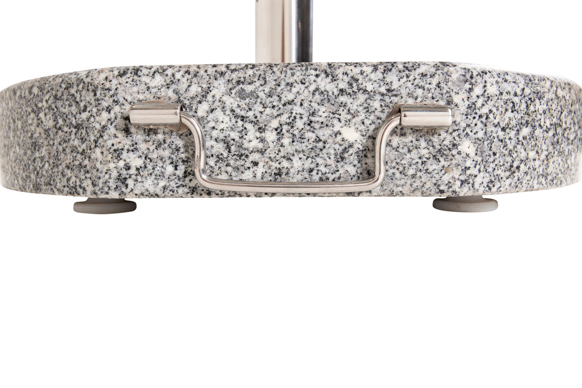 Rund parasollsten i marmorliknande färg. Stenen har hjul och handtag för att kunna förflyttas på ett smidigt sätt. Vikt 40kg. Se till att förvara din parasollstenen på rätt sätt. Vid risk för frost, förvara parasollstenen torrt och varmt för att minska risken för frostsprickor.
