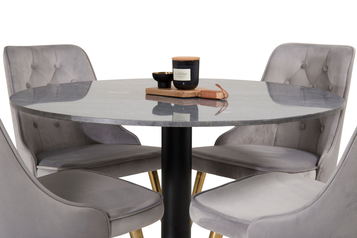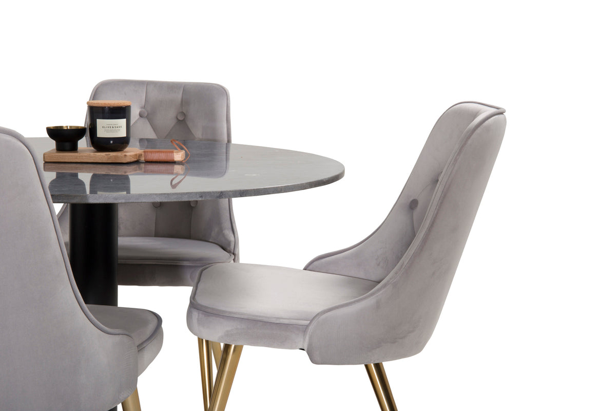 Matbord Estelle i en smäcker design, tillsammans med grå matstolar Velvet - den perfekta kombinationen för dig som vill ha en trendig matgrupp. Stolarnas höga sittkomfort bjuder in till långa och härliga stunder för umgänge!