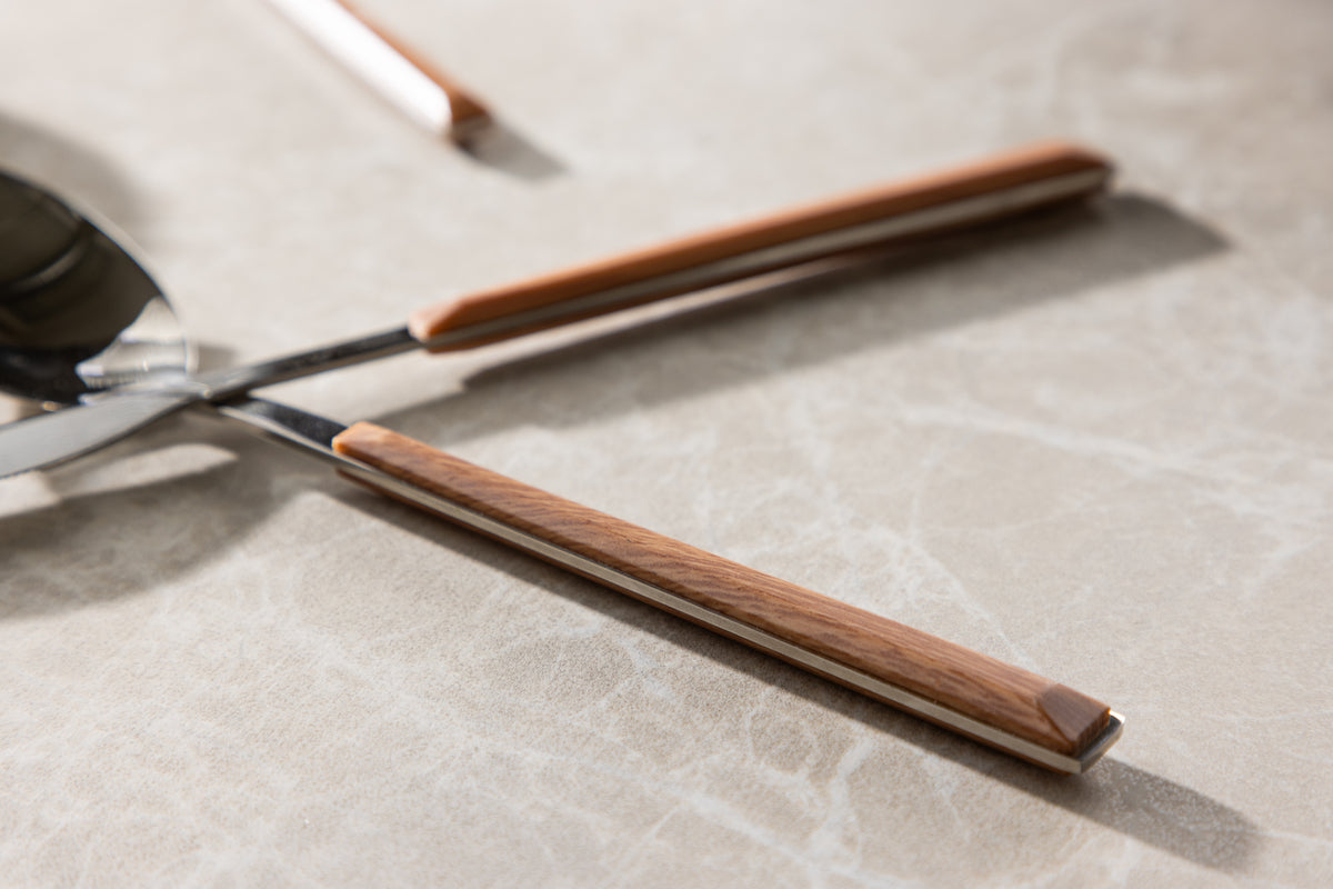Besticken från Jublie-serien är en harmonisk kombination av naturlig skönhet och modern elegans. I en vacker färgkombination av silver och brun skapar dessa bestick en lugnande atmosfär vid varje måltid. Skaften är tillverkade av ABS-material med träimitation, vilket ger en varm och organisk känsla till varje gaffel, kniv och sked. Den jordnära färgpaletten skapar en känsla av lugn och ro, och de rundade kanterna ger en mjukhet som förhöjer hela dukningen. Tillverkade med noggrannhet och hållbarhet i åtanke, är bladen tillverkade av stål och ger besticken pålitlig kvalitet och funktion. Jublie-besticken är inte bara köksredskap; de är konstnärliga detaljer som förhöjer din matupplevelse. Oavsett om det är för en enkel vardagsmåltid eller en festlig tillställning kommer Jublie-besticken att vara den perfekta följeslagaren. Skapa en lugn och inbjudande atmosfär vid ditt matbord med dessa bestick som kombinerar tidlös design med en touch av naturens skönhet. Rekommenderas att inte köra i diskmaskin.