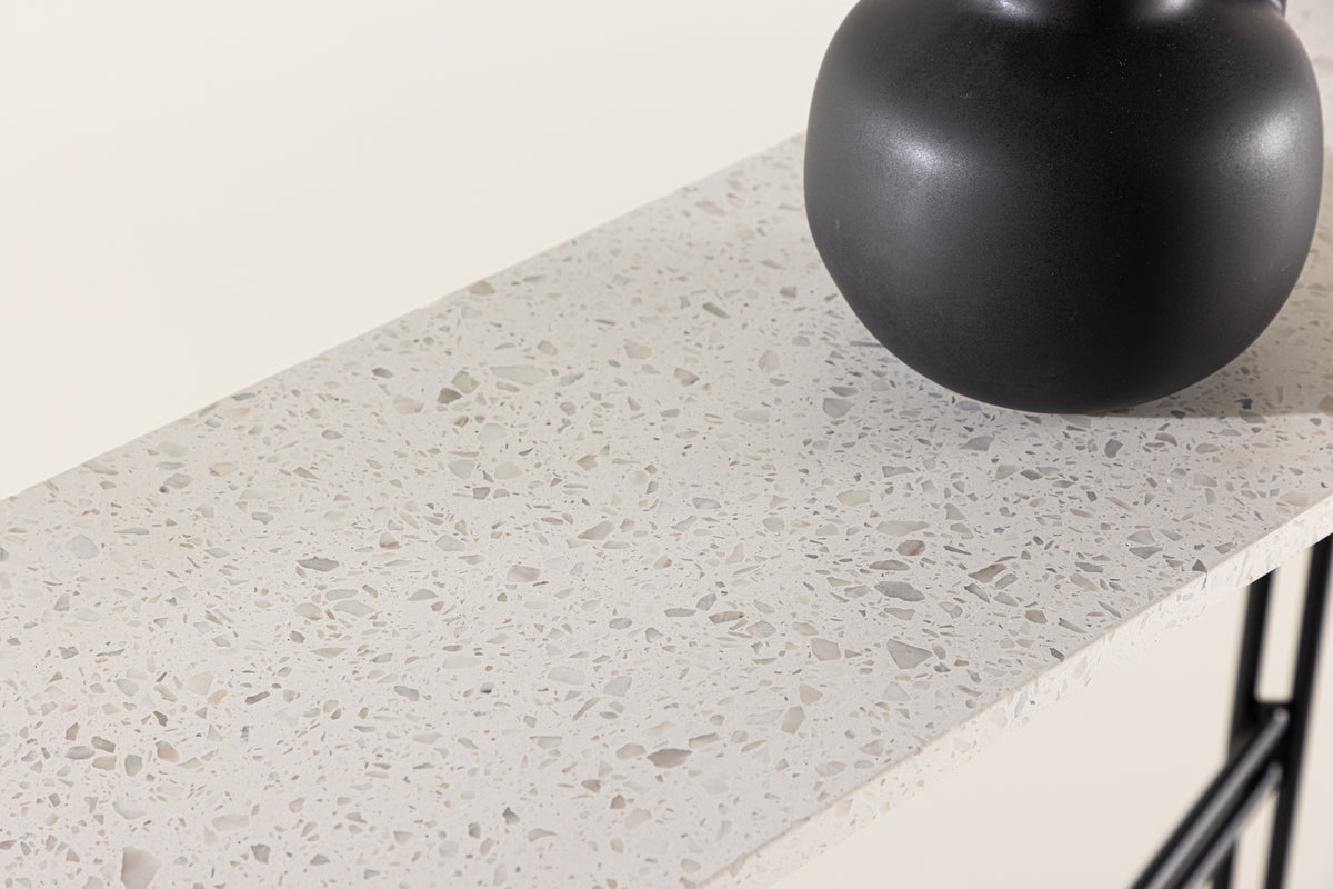 Det här sidobordet klättrar på trendlistorna! Razzia är ett modernt och praktiskt sidobord med en vit bordsskiva i spräcklig terazzo och underrede i svart metall. Ett avlastningsbord med industriellt uttryck och rak design. Med sina stilrena former tillför bordet en modern och luftig känsla till rummet och är otroligt användbar både som förvaringsyta och dekorativt sidobord. Perfekt för dig som söker ett schysst inredningsdetalj till hemmet!