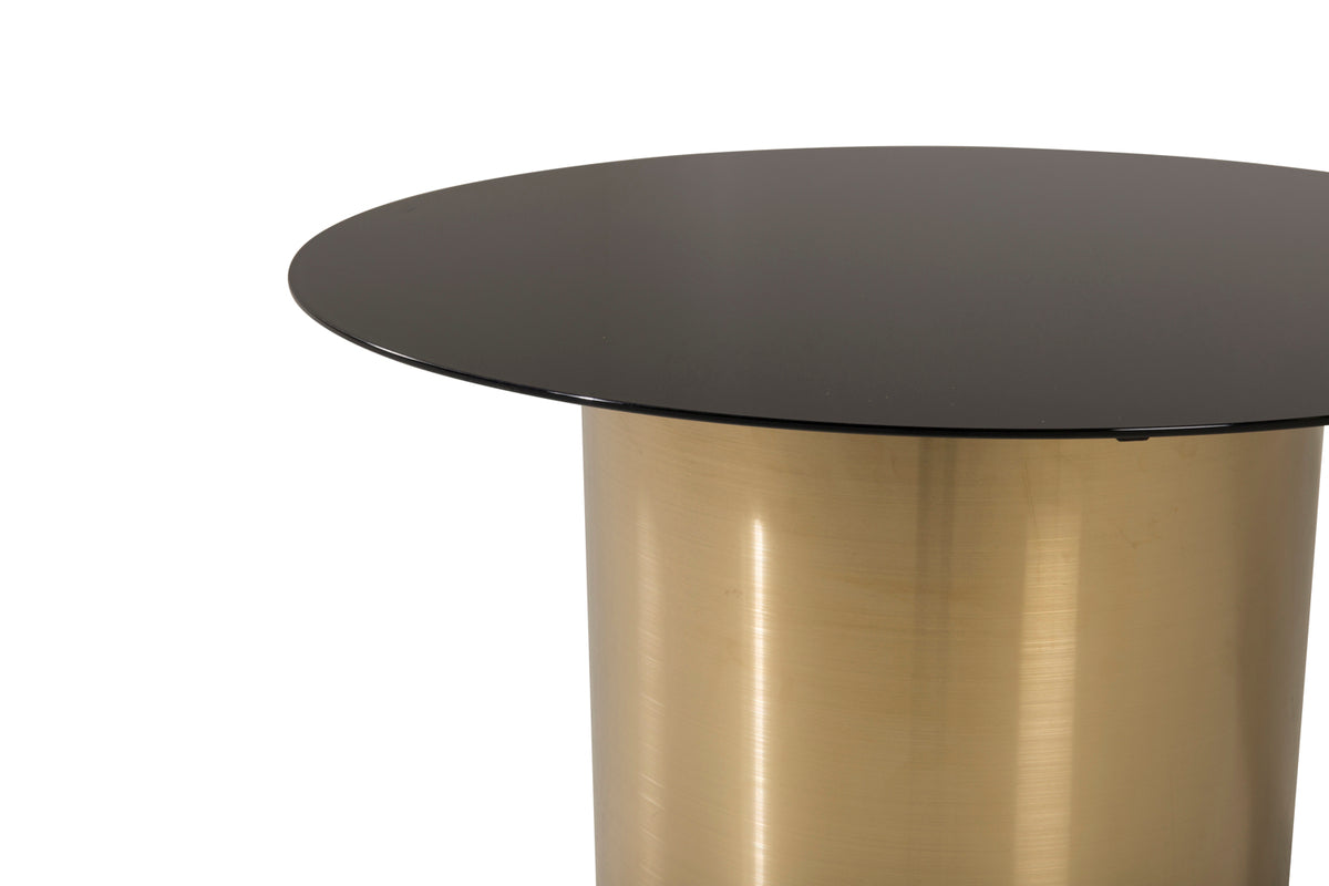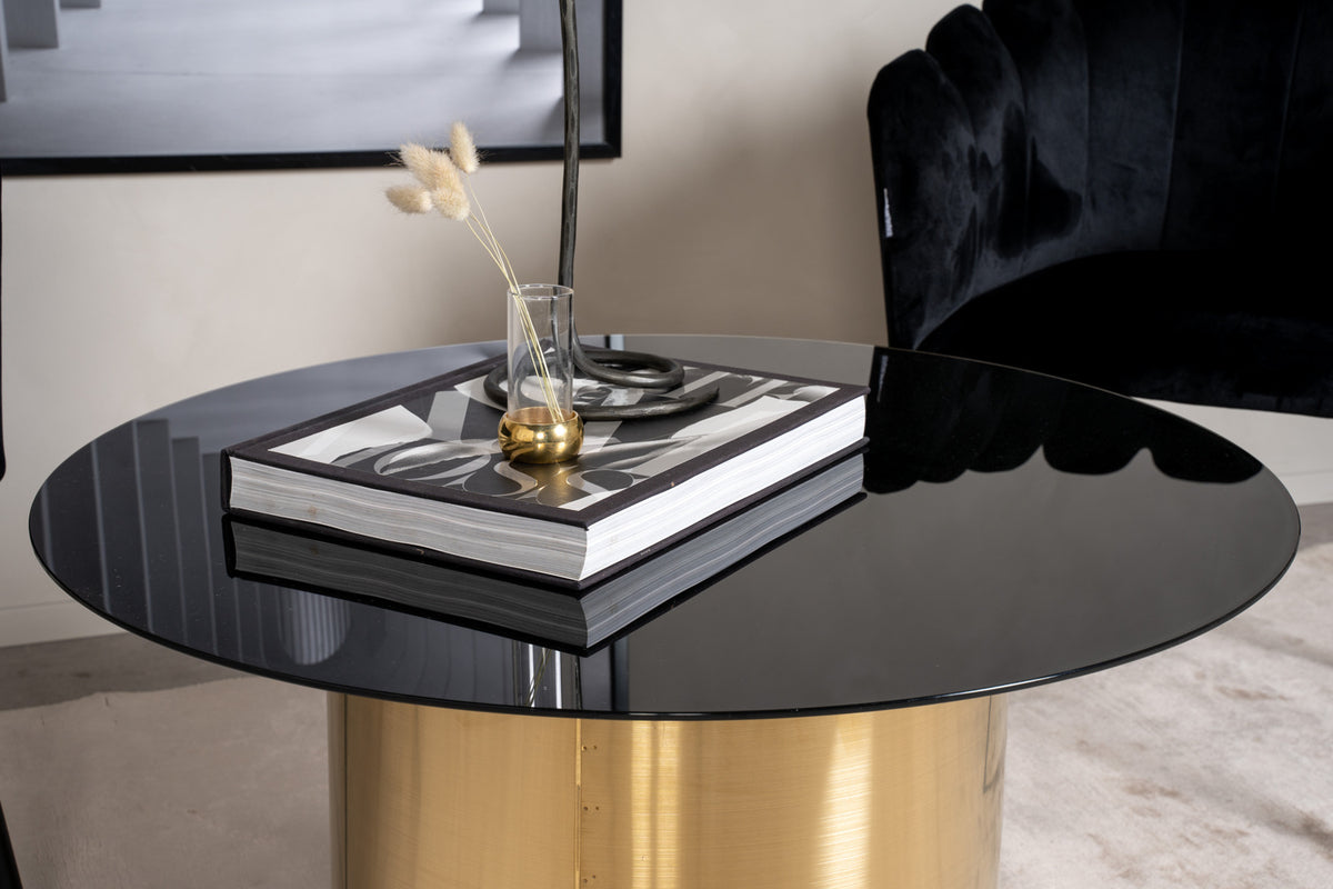 Soffbordet Ystad skapar ett trendigt blickfång i ditt vardagsrum! Det runda soffbordet med en bordsskiva i svart glas och ett vackert cylinderformat underrede i färgen guld tillför en modern och dekorativ känsla i ditt hem. Placera framför soffan eller använd som avlastningsbord och dekorera med matchande ljusstakar eller vaser för ett fullbordat intryck. Soffbordet tillhör Furniture Fashion.