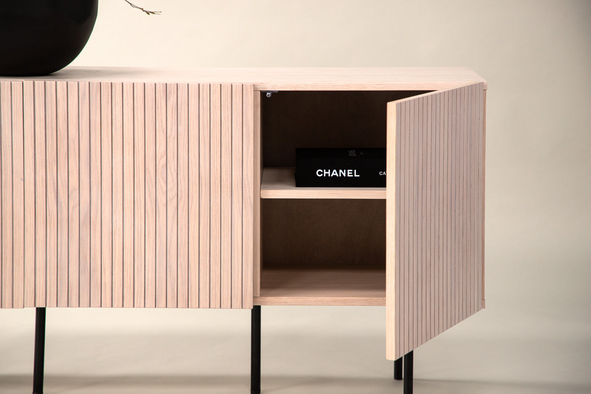 Avlastningsskåpet i Skandinavisk design som klättrar på trendlistorna med sin stilsäkra utformning! Skåpet tillhör serien Björkön och kommer i olika kulörer och storlekar. Det här avlastninsgskåpet har tre luckor i ribbad design med två hyllplan som möjliggör dold förvaring. Skåpet är tillverkat i vitputsade faner och lyfts upp av smal ben i svart stål. Använd som sidobord med vackra dekorationer och ljusstakar på eller som tv-bänk i vardagsrummet. Här får du en möbel som är lika snygg som smart!