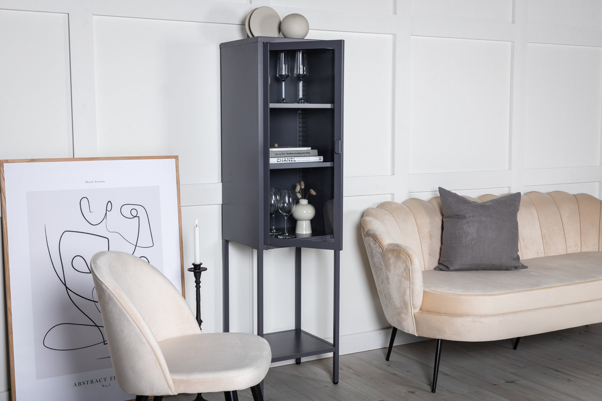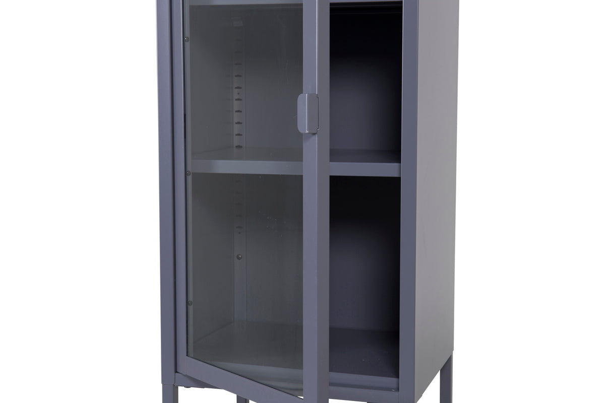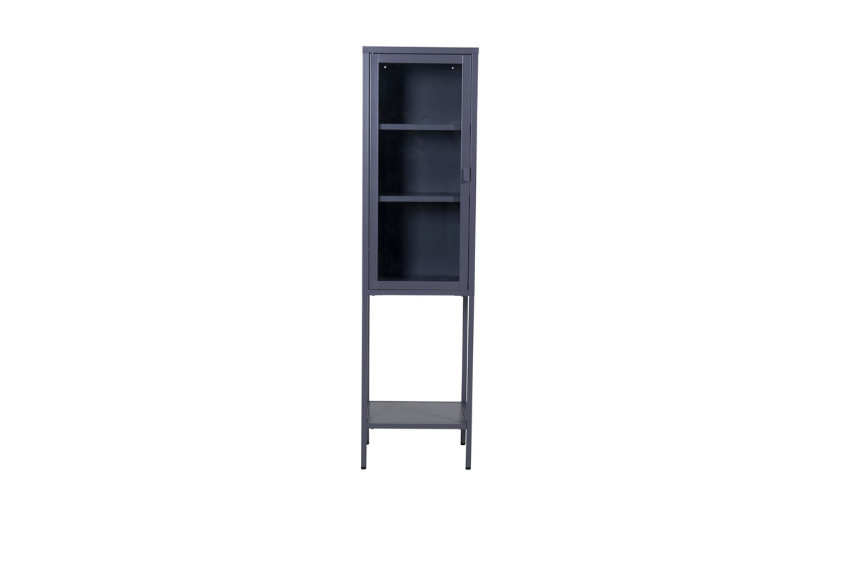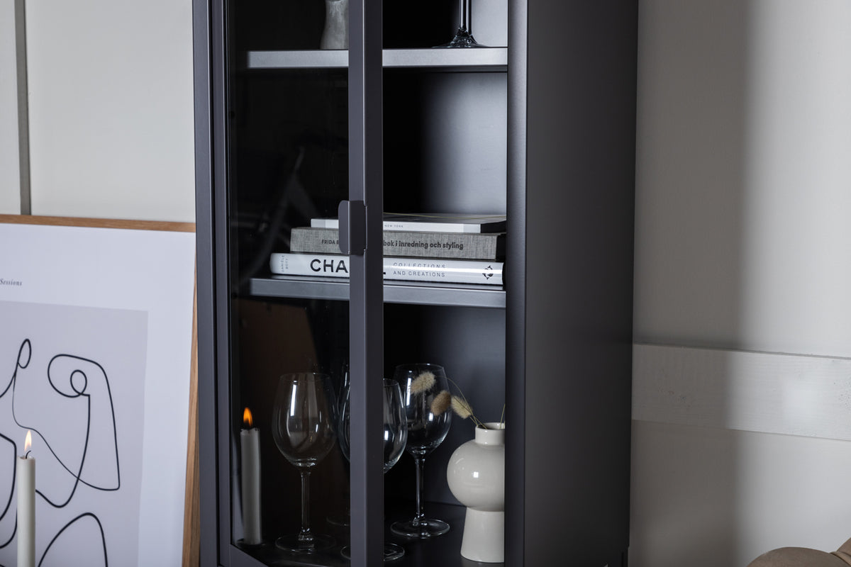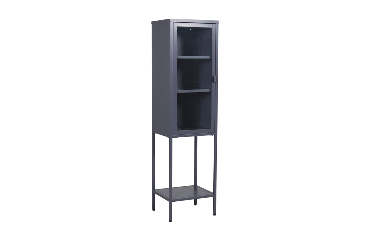 Plåtskåp är ett populärt och praktiskt tillskott till inredningen! Det här skåpet i serien Misha har en ståtlig höjd med en helhet i modern industriell design, tillverkat i pulverlackerad grått stål med en glasdörr. Glaset släpper in härligt ljus i skåpet och lyfter vackert fram allt du fyller det med. Det finns tre smarta avlastningsytor, använd för förvaring av porslin, böcker eller dekorera med vackra inredningsdetaljer. Mått: Längd: 40,5 cm, Bredd: 35 cm, Höjd: 150 cm. Lättare montering krävs. Skötselråd: Aluminium och krom är två material som är avvisande mot smuts och vätskor. Däremot behöver man vara uppmärksam på att vatten ska orsaka fläckar och rost. Se därför till att torka av ytan med en en mjuk fuktad trasa och såpvatten. Om fläckarna eller rosten sitter för hårt rekommenderas en mjuk trasa fuktad i ren alkohol.