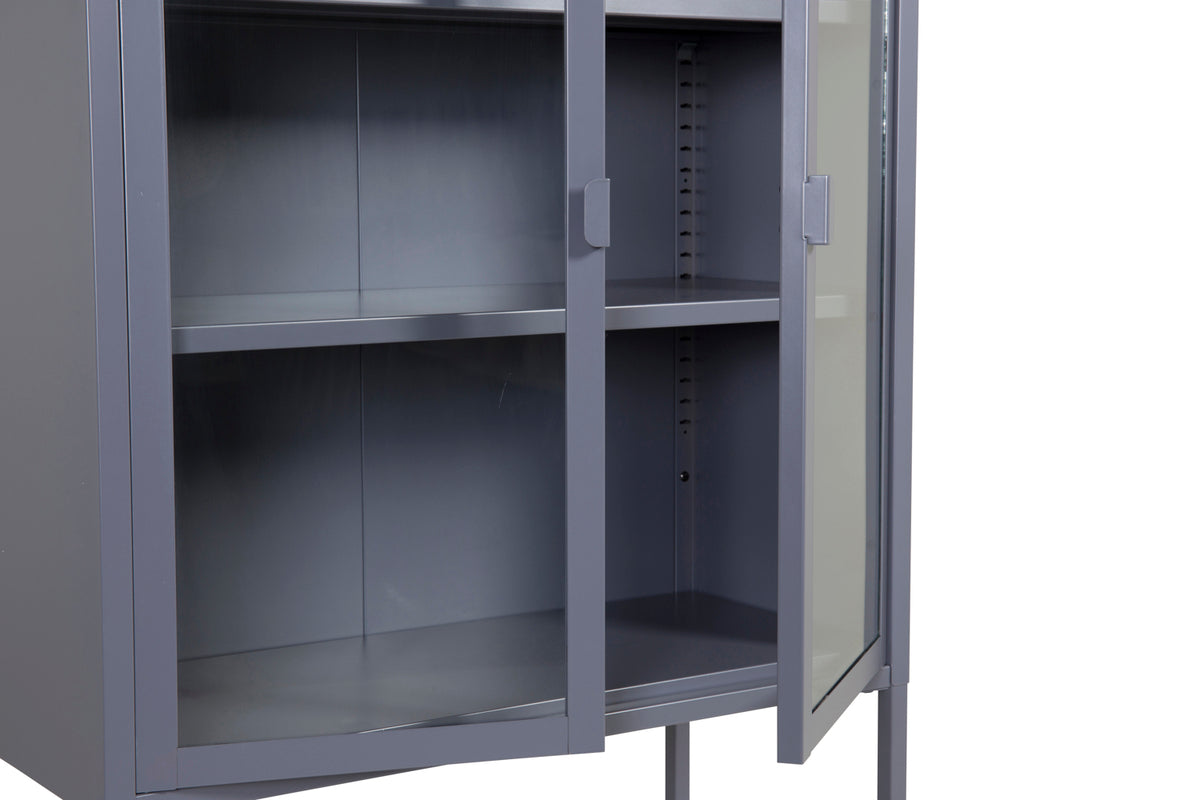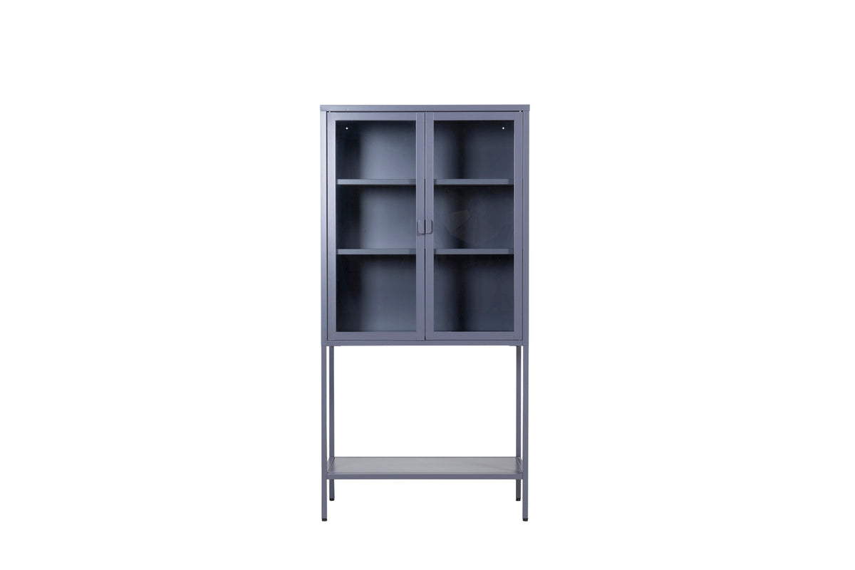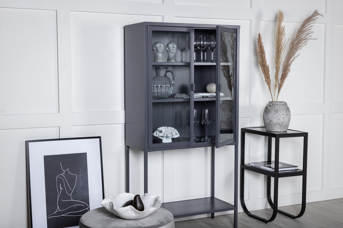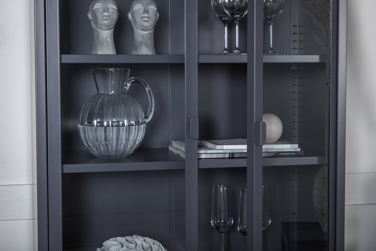 En elegant förvaringsmöbel med praktisk och stilren design! Misha, i modern nordisk design med raka strukturer är tillverkad i pulverlackerad grå stål med två glasdörrar för härligt ljusinsläpp. Skåpet har en ståtlig höjd som öppnar upp rummet och skapar en trendig atmosfär. Detta vitrinskåp är användbart för mycket. Det finns tre hyllplan för avlastning som du kan fylla efter egna behov och önskemål - vackert porslin, böcker eller stilrena inredningsdetaljer - valet är ditt! Se våra bilder för inspiration. Lättare montering krävs. Skötselråd: Aluminium och krom är två material som är avvisande mot smuts och vätskor. Däremot behöver man vara uppmärksam på att vatten ska orsaka fläckar och rost. Se därför till att torka av ytan med en en mjuk fuktad trasa och såpvatten. Om fläckarna eller rosten sitter för hårt rekommenderas en mjuk trasa fuktad i ren alkohol.