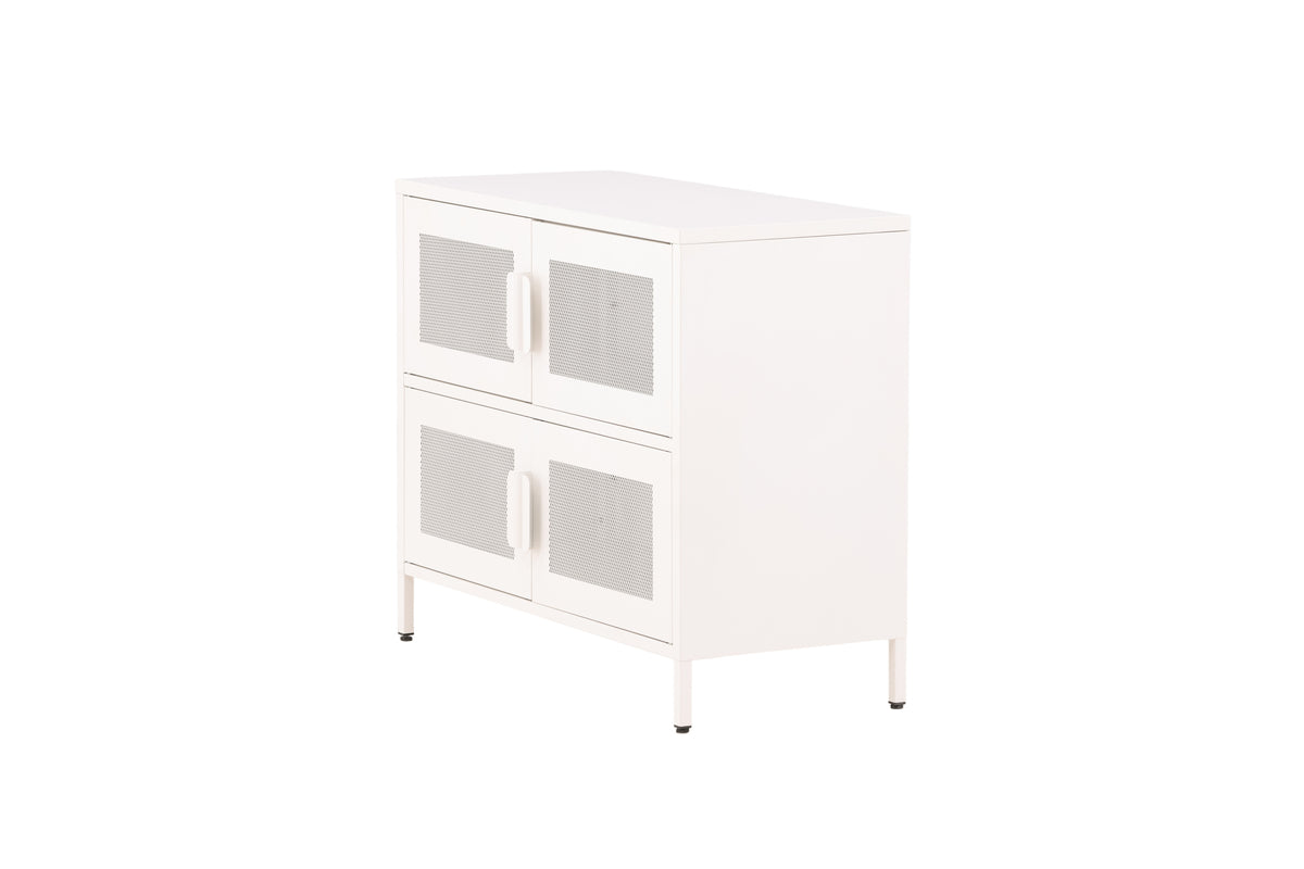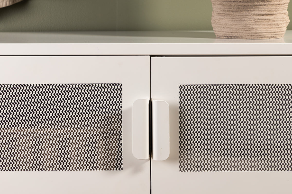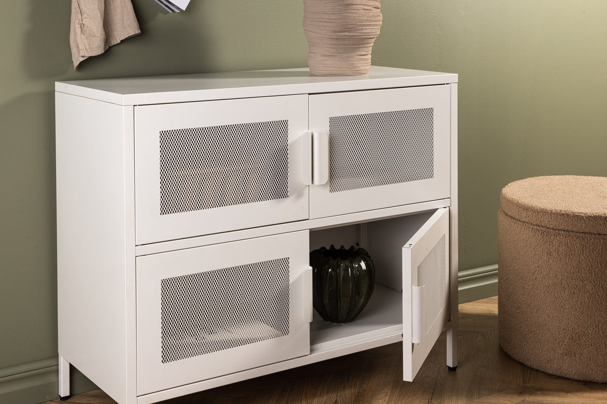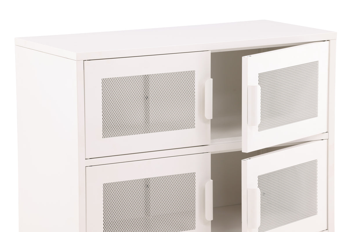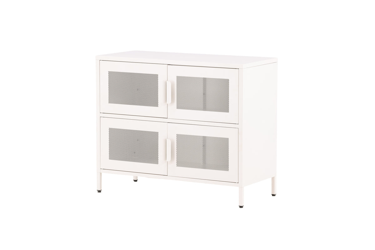 Möblera hemmet smart och snyggt med ett praktiskt förvaringsskåp från serien Nett i läcker industriell design! Det här skåpet är tillverkat i vitt stål med nätluckor som blir en smakfull detalj för ögat. Skåpet har två hyllplan med fyra luckor som skapar massvis med plats för semi-dold förvaring. Skåpets djup ger ett robust intryck och passar utmärkt för avlastning även på toppskivan - pryd med dekorationer och skapa ett blickfång som imponerar! De smala, höga benen som lyfter upp skåpet skapar en luftig känsla och underlättar även för dammsugaren. Njut av en smart möbel!