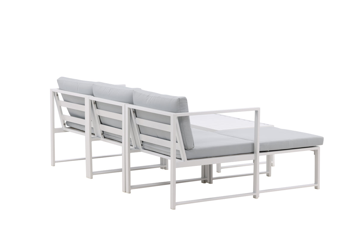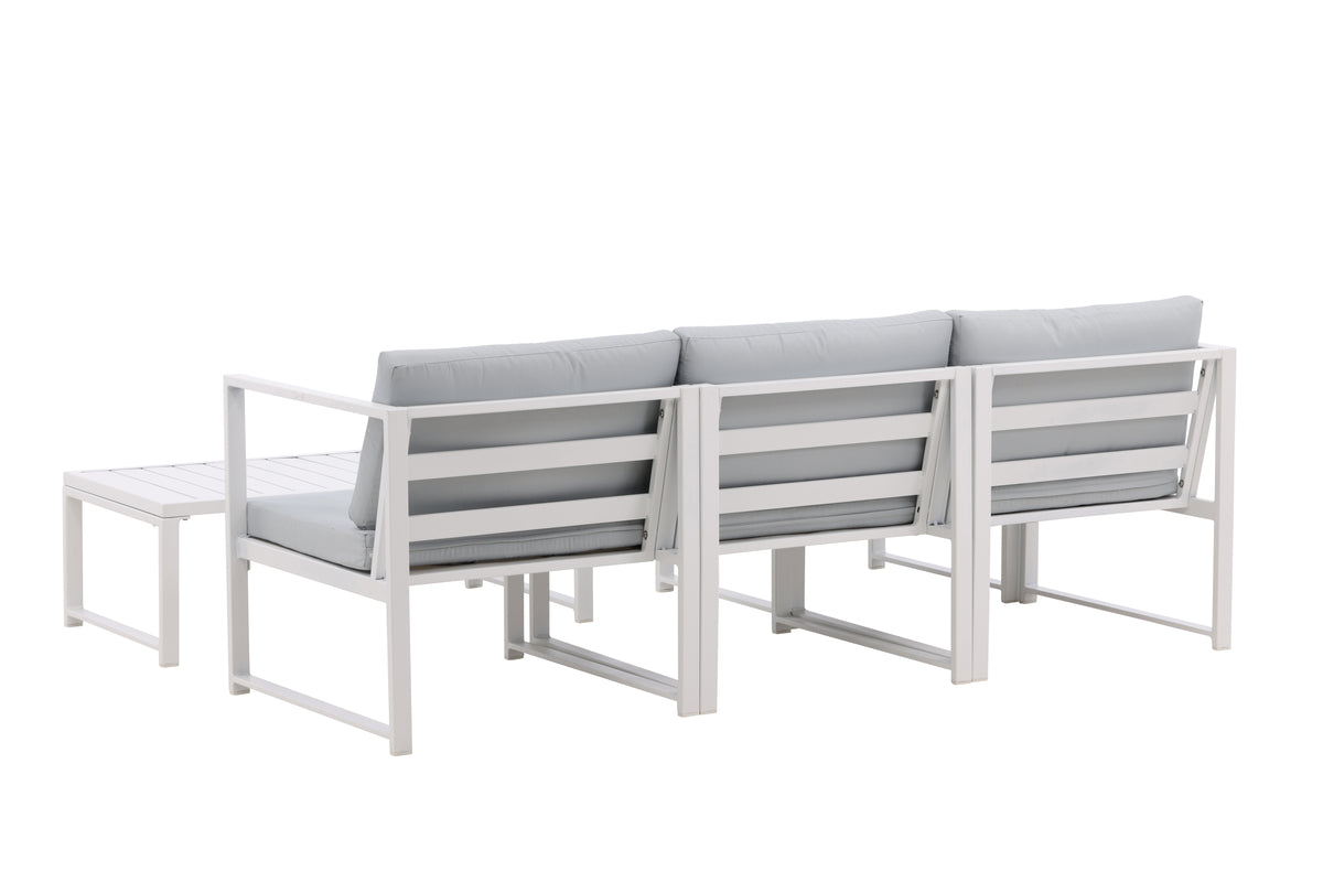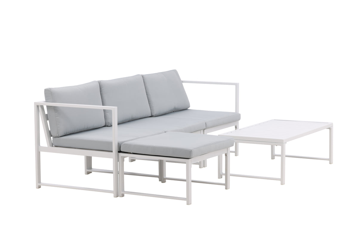 Salvador är en stilren soffgrupp i behaglig grå kulör som imponerar med sin genomtänkta helhetsdesign. Soffgruppen består av en tresits soffa med divandel samt ett soffbord. Tillverkad i vit pulverlackerad metall och aluminium - enkelt att sköta och tåligt för utomhusbruk! Mjuka ljusgrå dynor inkluderas till soffgruppen. Soffan är uppbyggd av moduler som gör att den kan anpassas precis som du vill ha den, perfekt för att skapa din egna charmiga oas på uteplatsen! Skötselråd: Utemöbler i aluminium och rostfritt stål bör rengöras regelbundet med vatten och mild tvål. Skölj alltid noggrant med rikligt med vatten, något som blir extra viktigt om möblerna är placerade på ett havsnära avstånd där salt kan transporteras via luften.