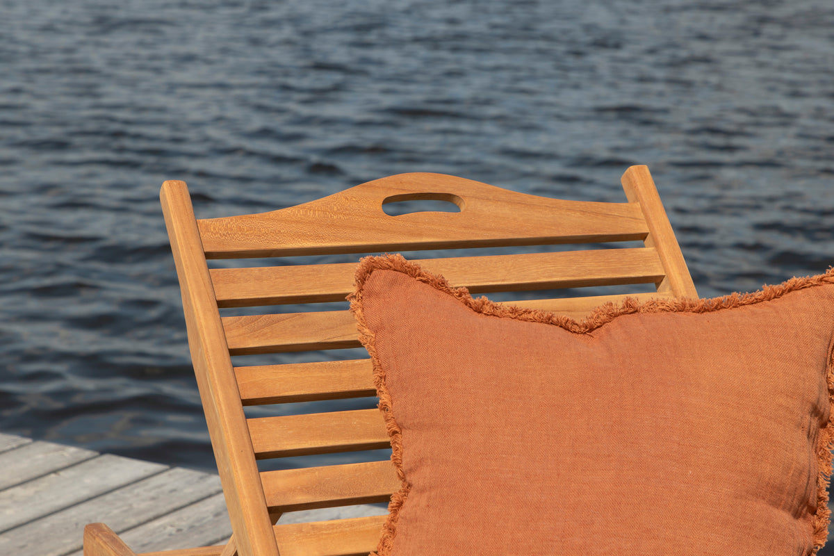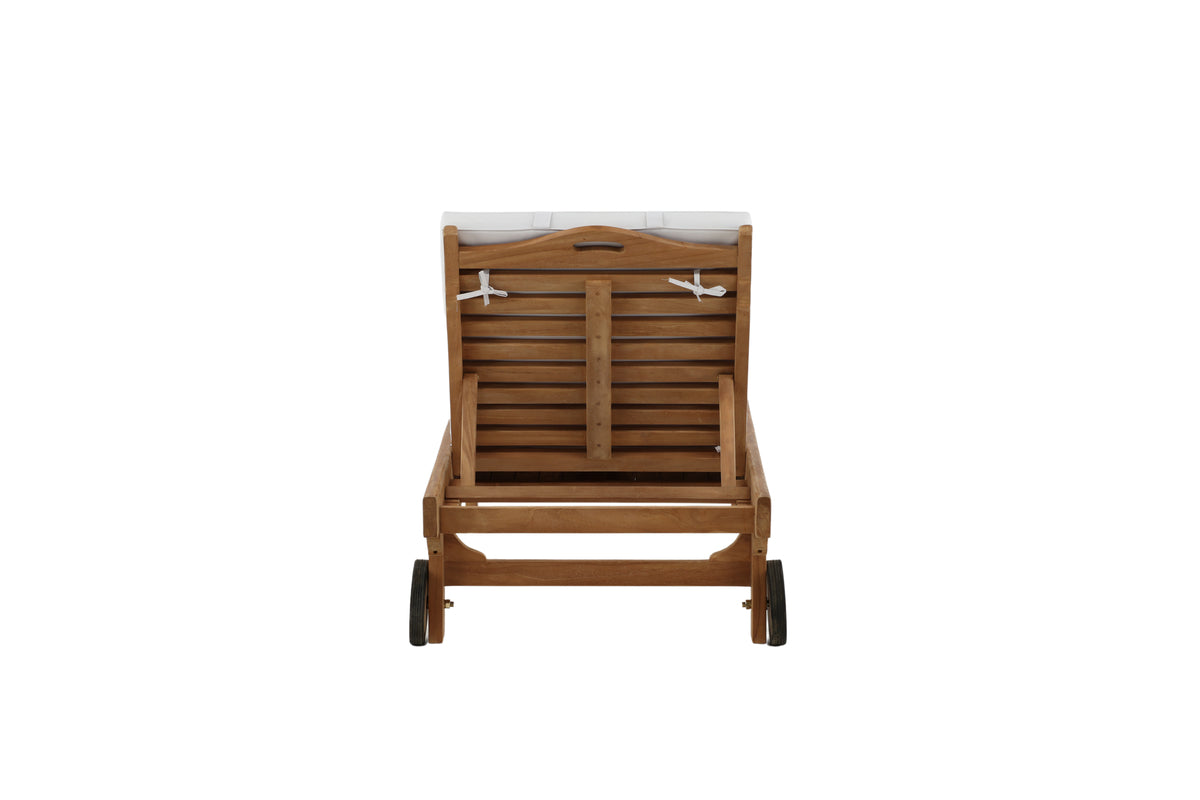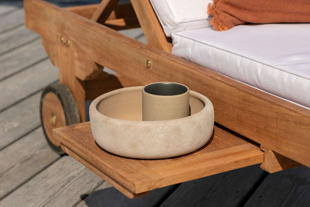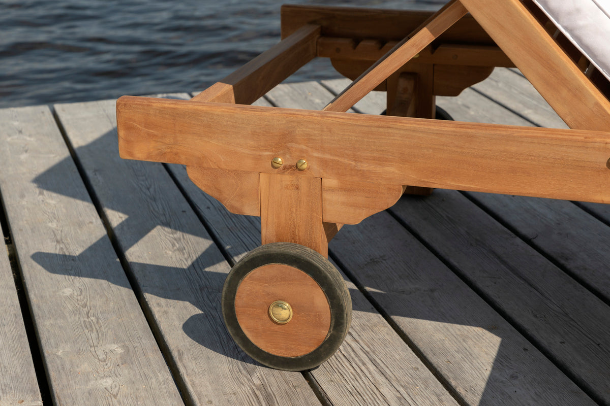 Slå dig ner i vår sköna solsäng i serien Ghana och njut av solen! Solsängen är tillverkad i teak och har en djup träfärgad nyans. Solsängen bjuder in till avslappning och bekvämlighet och med sin tillhörande bricka passar den perfekt in på uteplatsen eller på altanen när du vill kunna lägga ifrån dig boken och njuta av stunden! Dyna ingår inte.