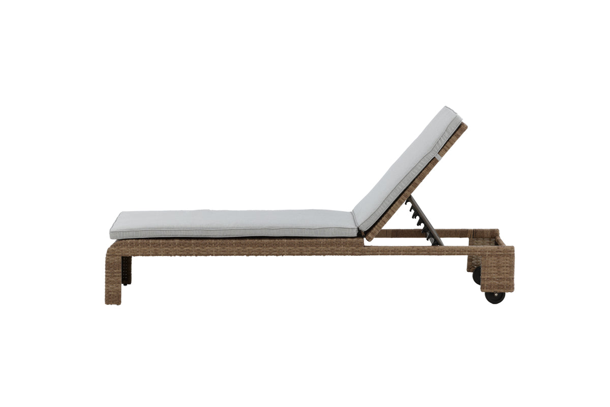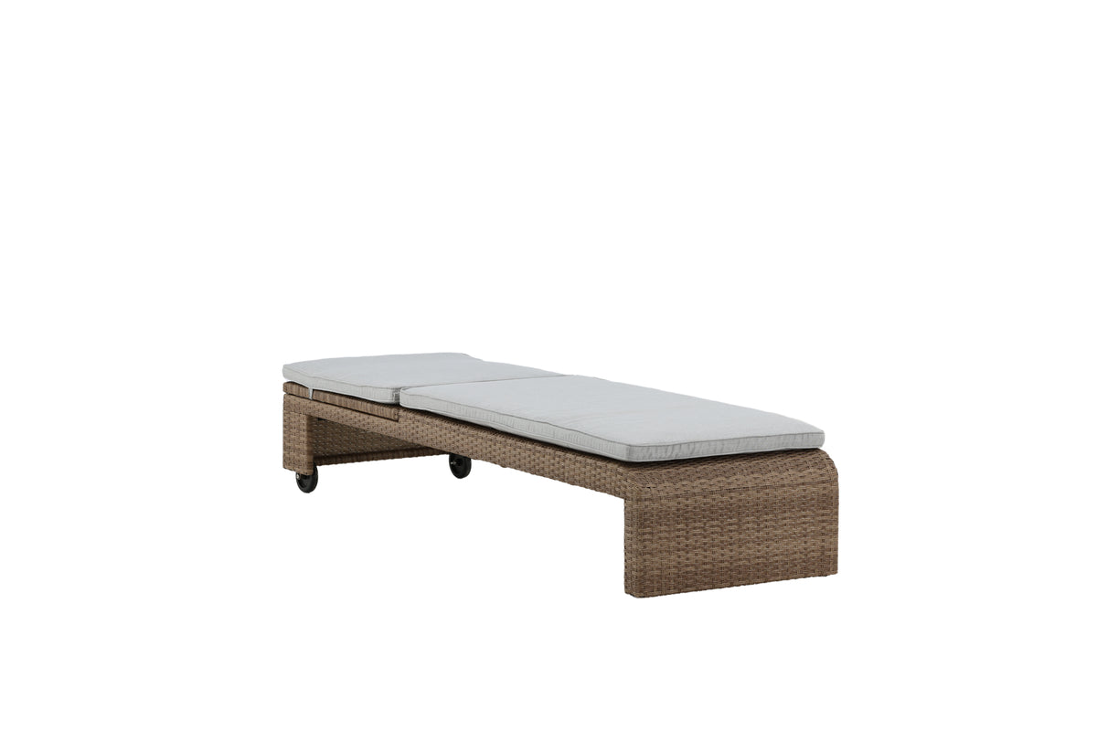Skapa en lyxig oas på din uteplats i sommar med den här solsängen från serien London! Designen är genomtänk med en stilren look och praktiska funktioner. Här får du naturfärgad solsäng i konstrotting med vit dyna, hjul och justerbart ryggstöd. Välj själv om du vill sitta upp och läsa en bok eller sträcka ut dig i viloposition och njuta av värmen från solen. Skötselråd: Konstrotting är ett plastmaterial som passar alldeles utmärkt för vårt skandinaviska klimat. Materialet är UV-beständigt och tåler väder och vind. Att det är UV-beständigt gör att möblerna inte bleknas, däremot rekommenderar vi alltid att förvara möblerna under ett möbelskydd eller på annat vis torrt och svalt – för att förlänga livslängden.