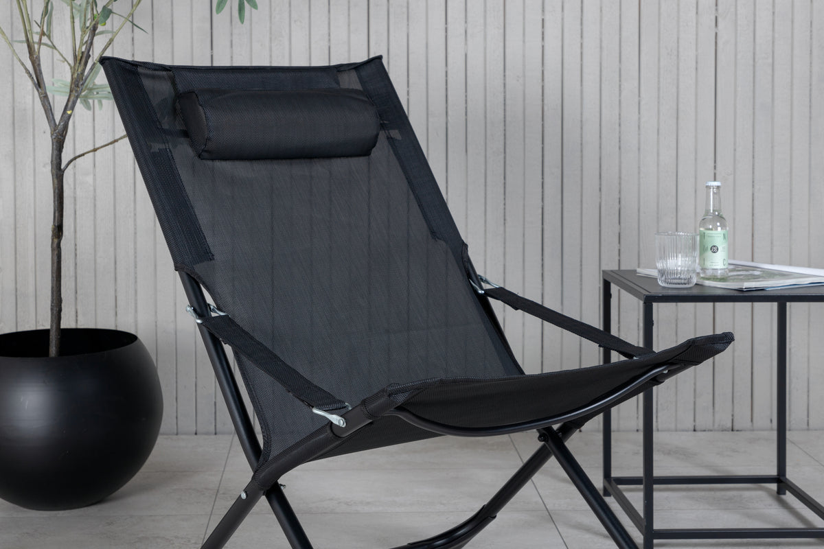 Med solstolen Seville behöver du inte välja mellan något bekvämt eller praktiskt - den har båda egenskaperna! Sitsen har ett svart tyg med en kudde som går att vända bort och den har en stomme i svart aluminium. Eftersom stolen enkelt kan fällas ihop är den perfekt att bära med sig ner till stranden eller ut i trädgården. Stolen passar också bra på dom mindre uteplatserna om man vill ställa undan möblerna enkelt efter användning.