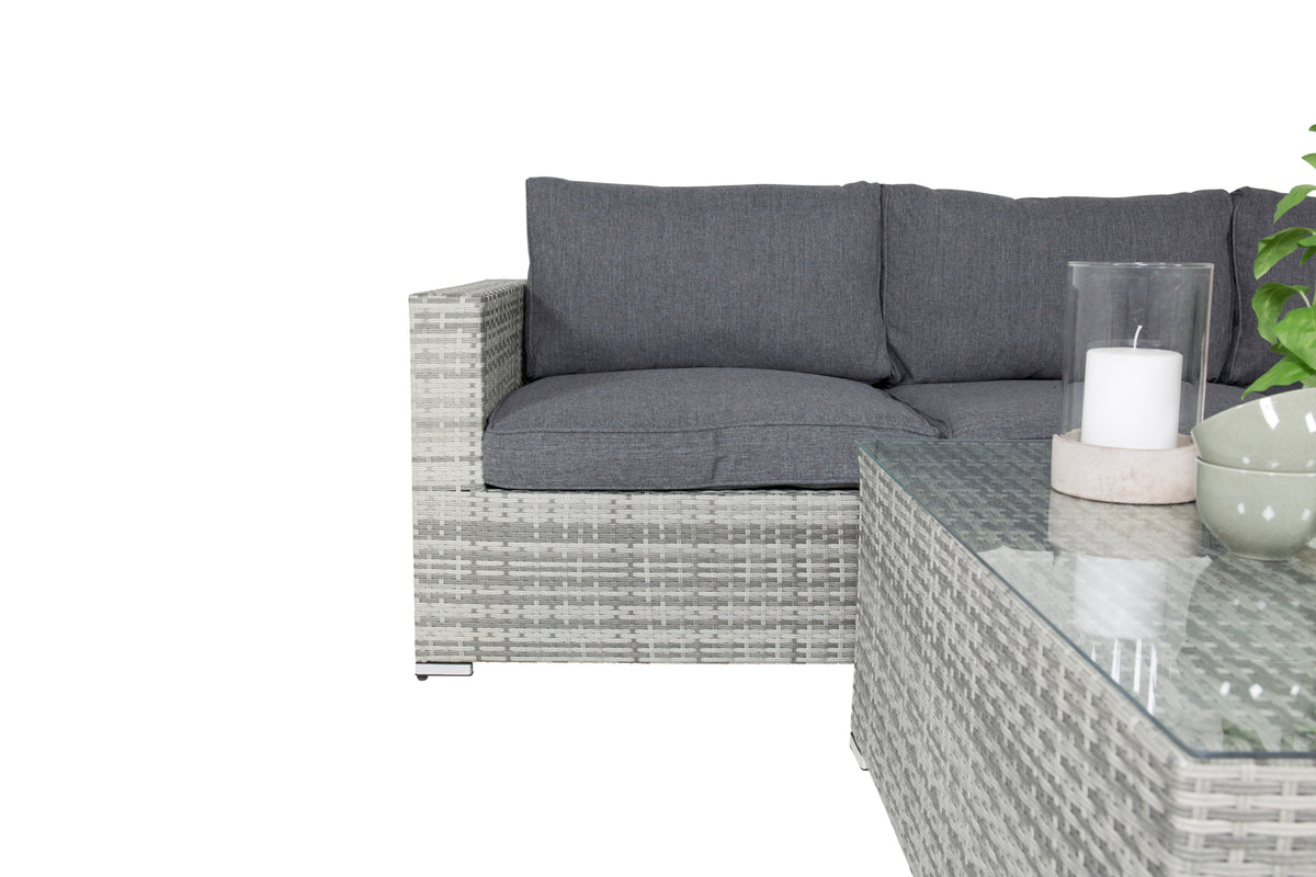 Soffgrupp i modern design med fokus på en god komfort till din uteplats eller altan. Soffgruppen består av en hörnsoffa i modulform med fyra sittplatser och en hörndel som går lätt att bygga ihop för att passa dina behov. Inklusive mörkgrå mjuka dynor samt ett lägre soffbord med en bordsskiva av glas. Tillverkat av en metallstomme och grå konstrotting.