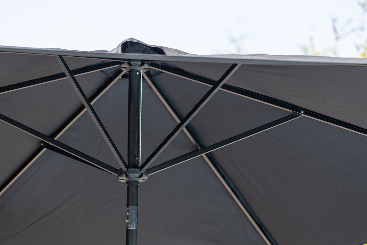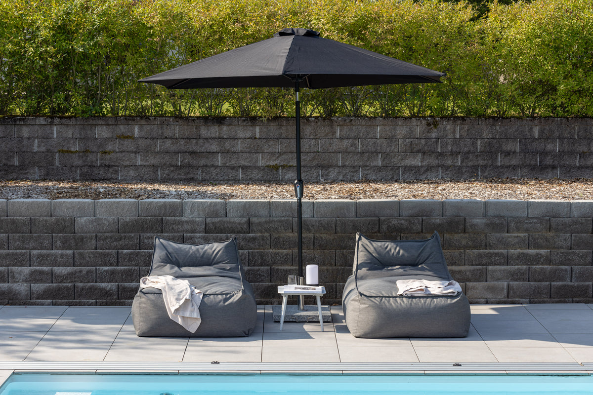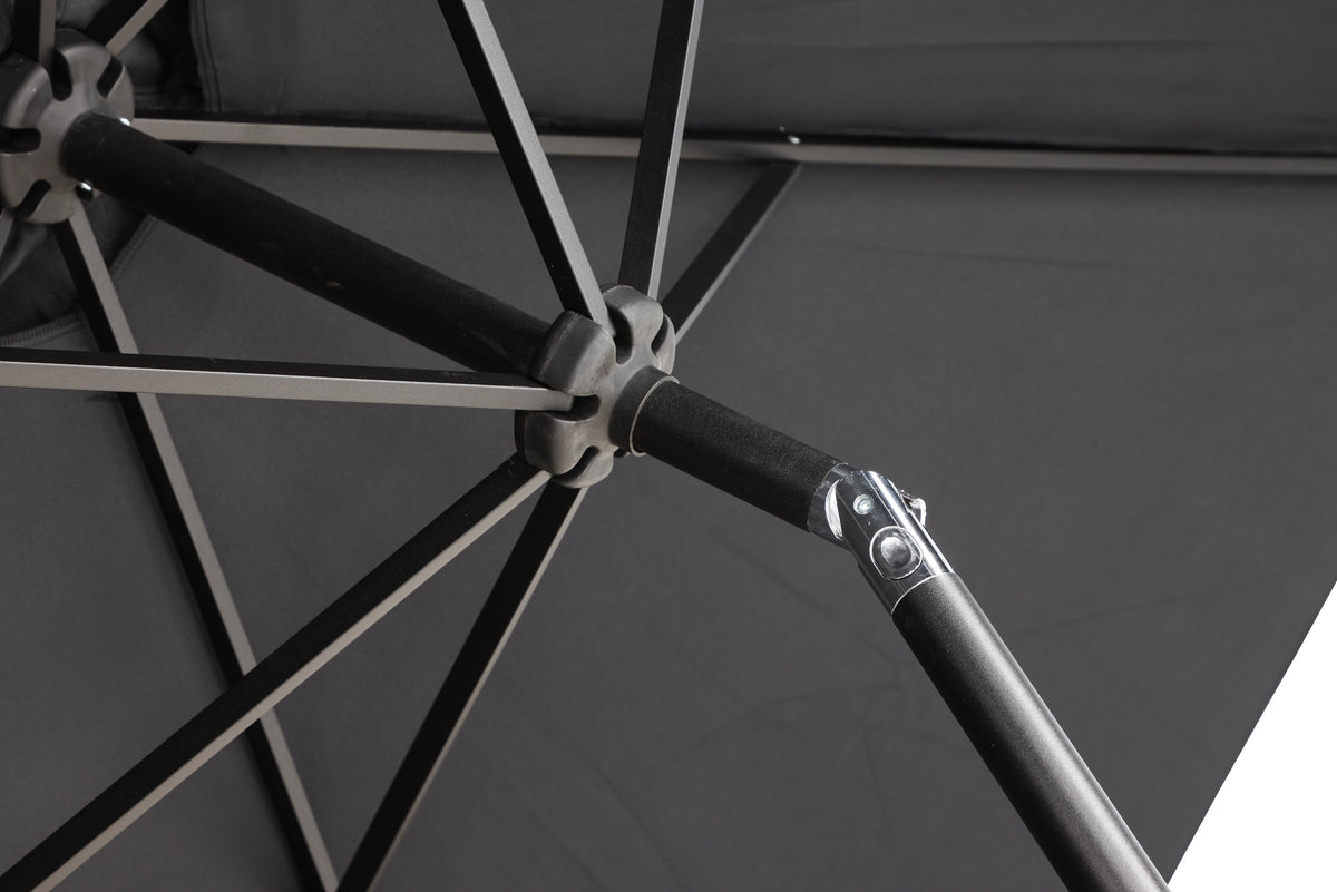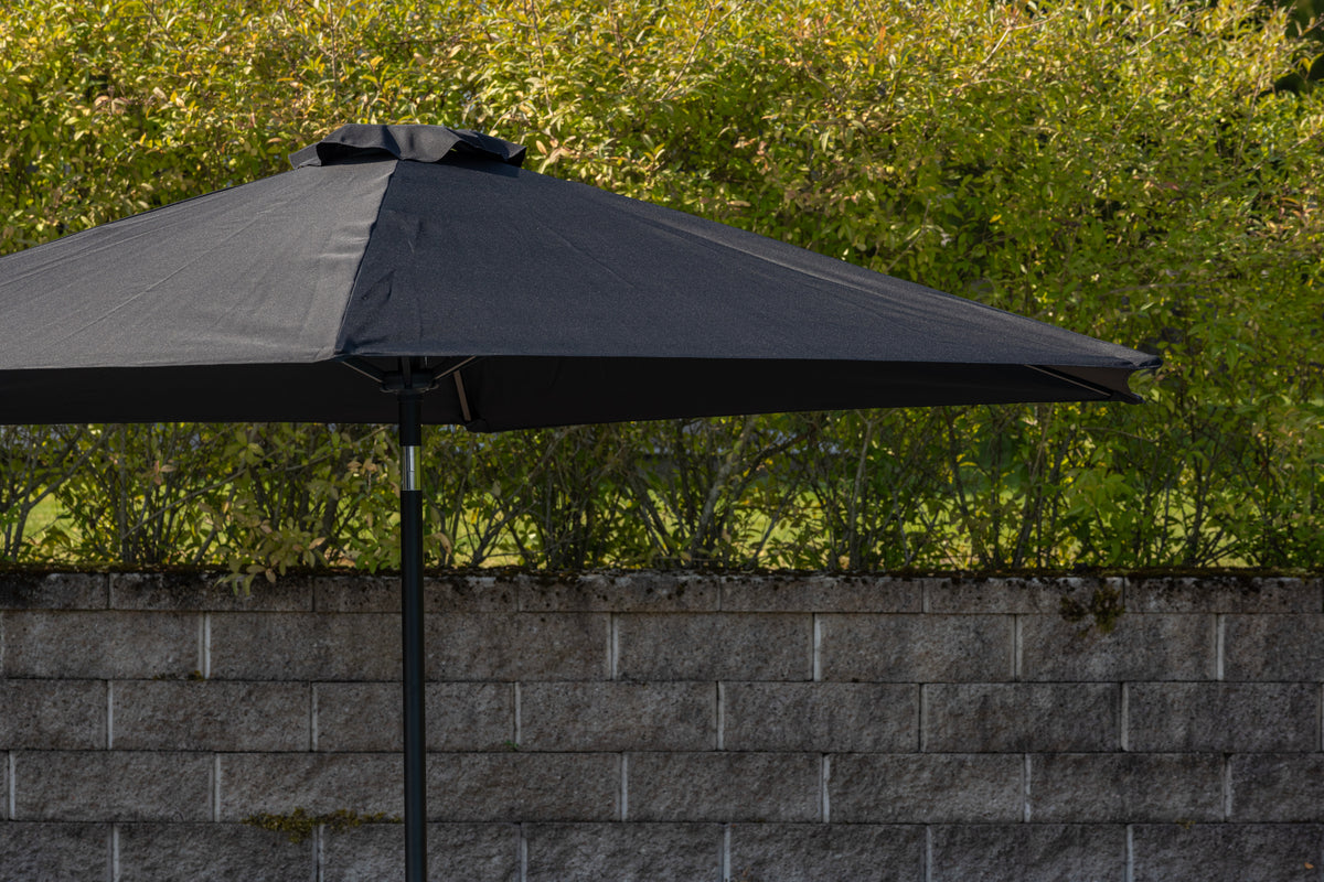 Leeds är ett stilrent och modernt parasoll som skyddar dig mot solens starka strålar! Parasollets tak är tillverkad i polyster och har en stomme i aluminium. Den svarta kulören skapar ett lyxigt och tidlöst uttryck och gör att parasollet kommer se ut som nytt en lång tid framöver. Parasollet fälls enkelt ut med hjälp av vevlyft. Parasollet finns också i grått och vitt.