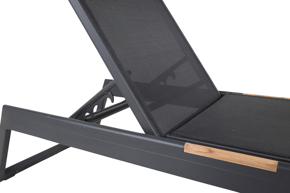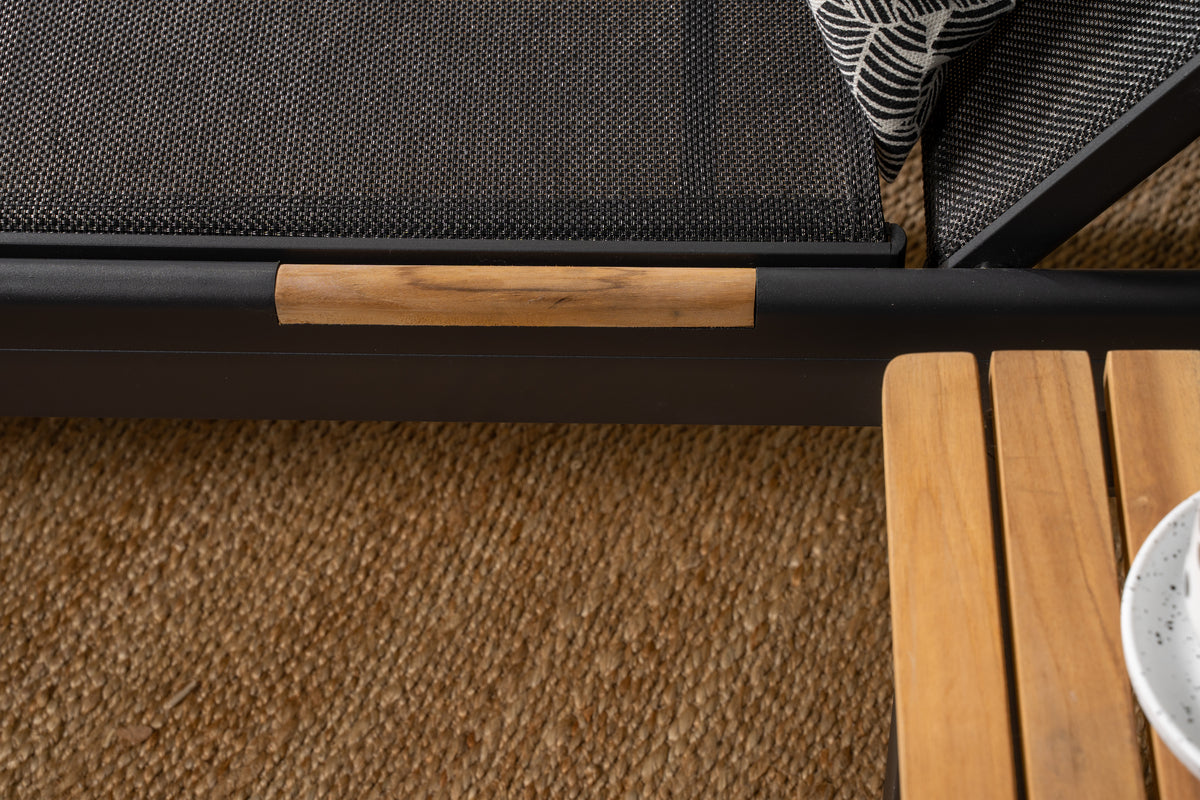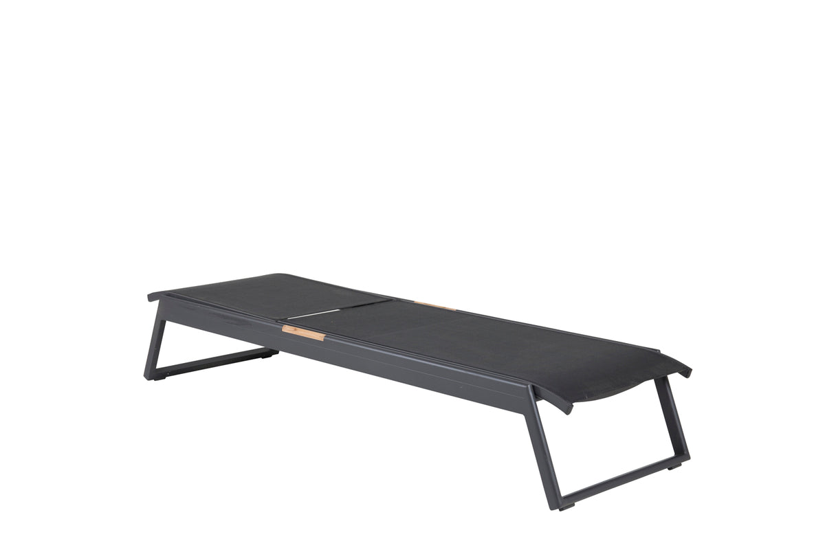 Mexico, en snygg svart solsäng med trendiga trädetaljer och klassiskt utförande. Solsängen har ett justerbart ryggstöd som gör att du enkelt kan välja om du önskar sitta upp eller ligga ner - justera för den optimala vilopositionen. Tillverkad av aluminium och teak lämpas den sig utmärkt för utomhusbruk, följ våra skötselråd så får du en solsäng som håller länge. Njut av soliga sommardagar i en bekväm och iögonfallande solsäng. Skötselråd: Utemöbler i aluminium och rostfritt stål bör rengöras regelbundet med vatten och mild tvål. Skölj alltid noggrant med rikligt med vatten, något som blir extra viktigt om möblerna är placerade på ett havsnära avstånd där salt kan transporteras via luften. Saltet kan leda till korrosion som kan orsaka flagning eller bubblor i lacken. Tvätta inte möblerna med högtryckstvätt, ytan kan skadas av det höga trycket.