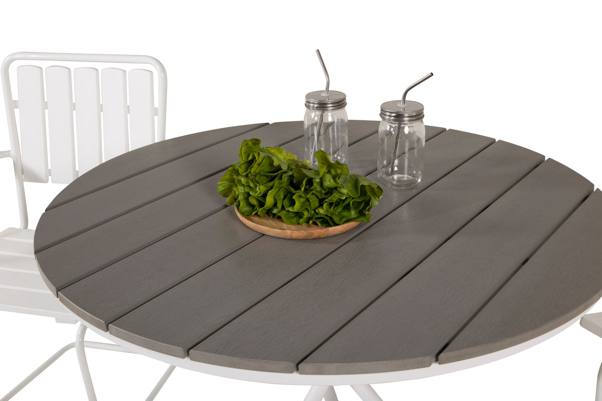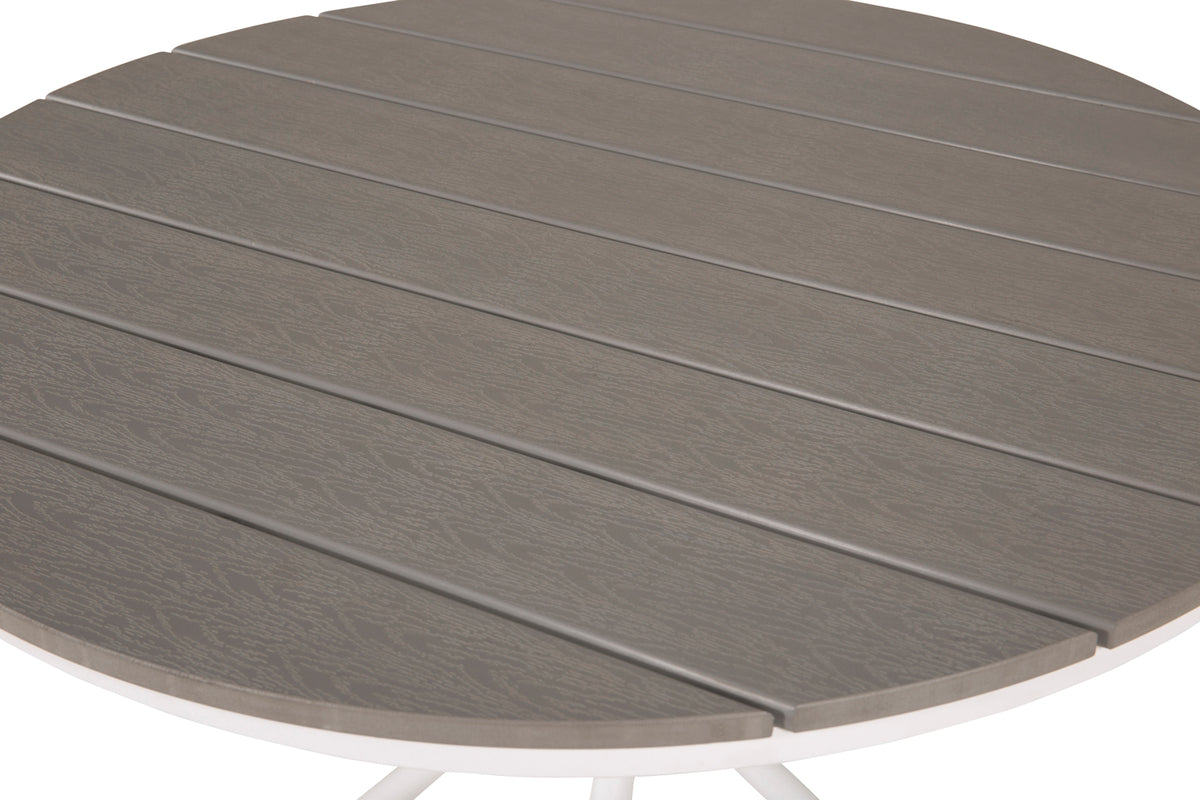 Parma - ett stilrent cafébord i tidlös grå och vit kulör som har en nätt design. Bordsskivan är i grå aintwood och stommen i vit aluminium, vilket gör bordet lika praktiskt som tåligt. Den lätta vikten gör att bordet är enkelt att flytta och passar lika bra ute i trädgården som på den lilla balkongen. Njut av sommarens härliga stunder! Mått: ø90 cm.