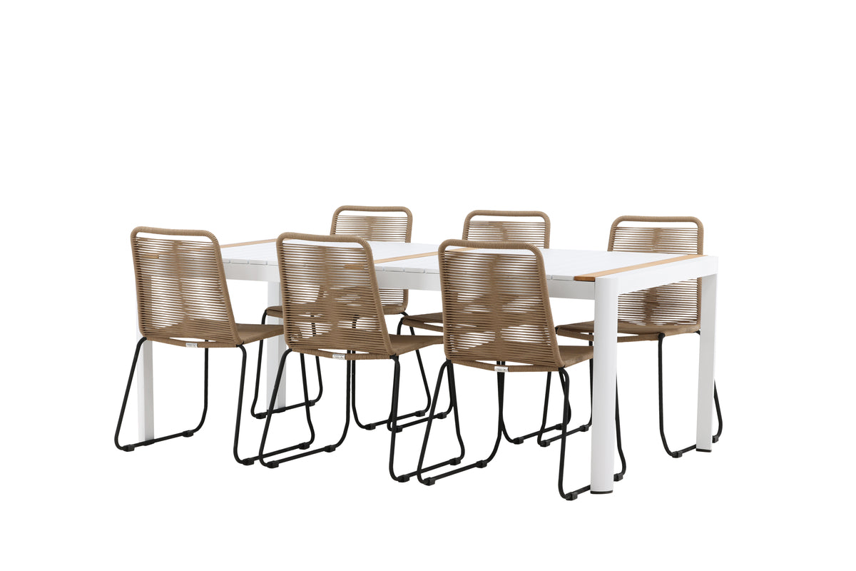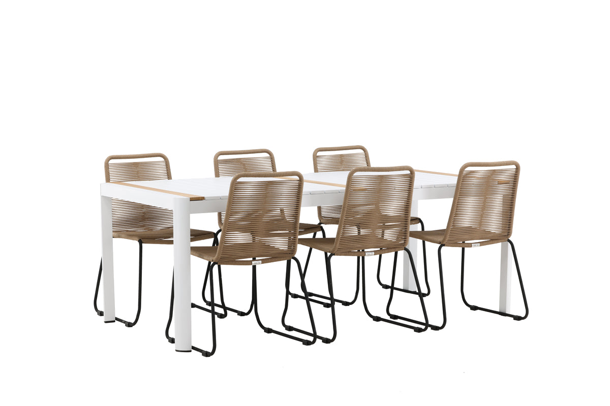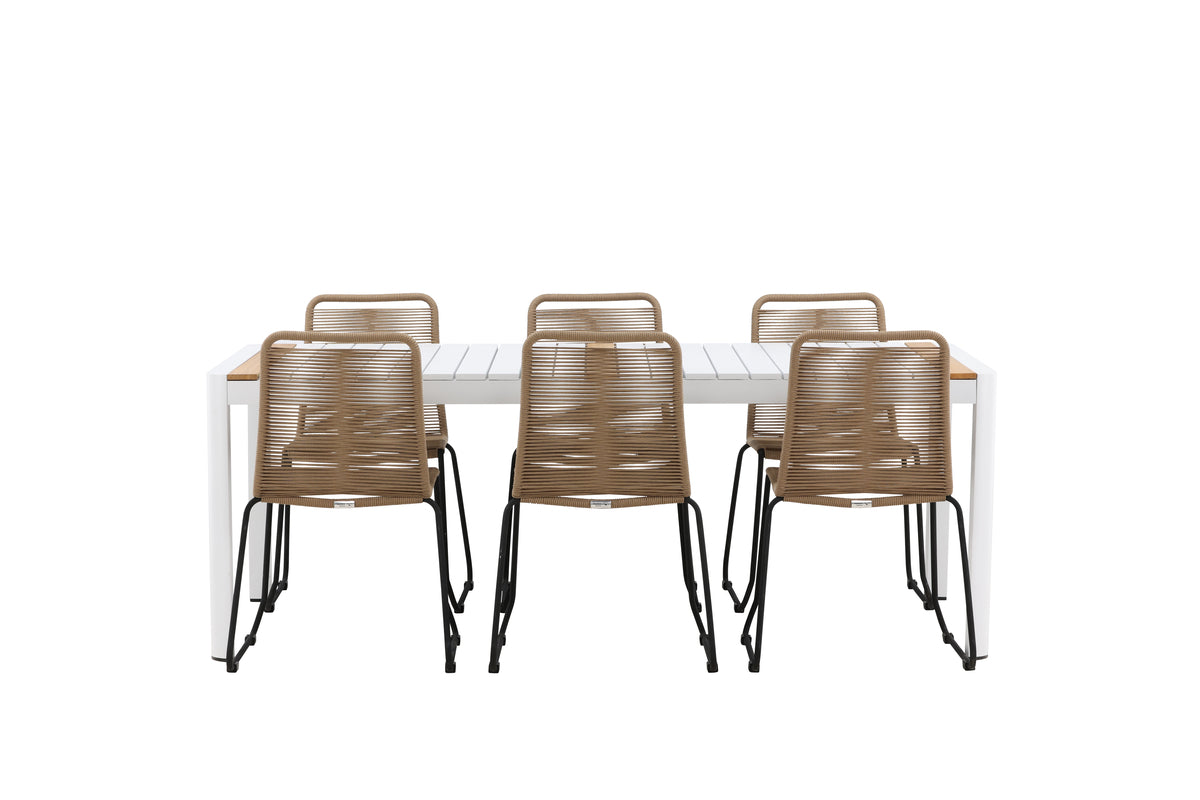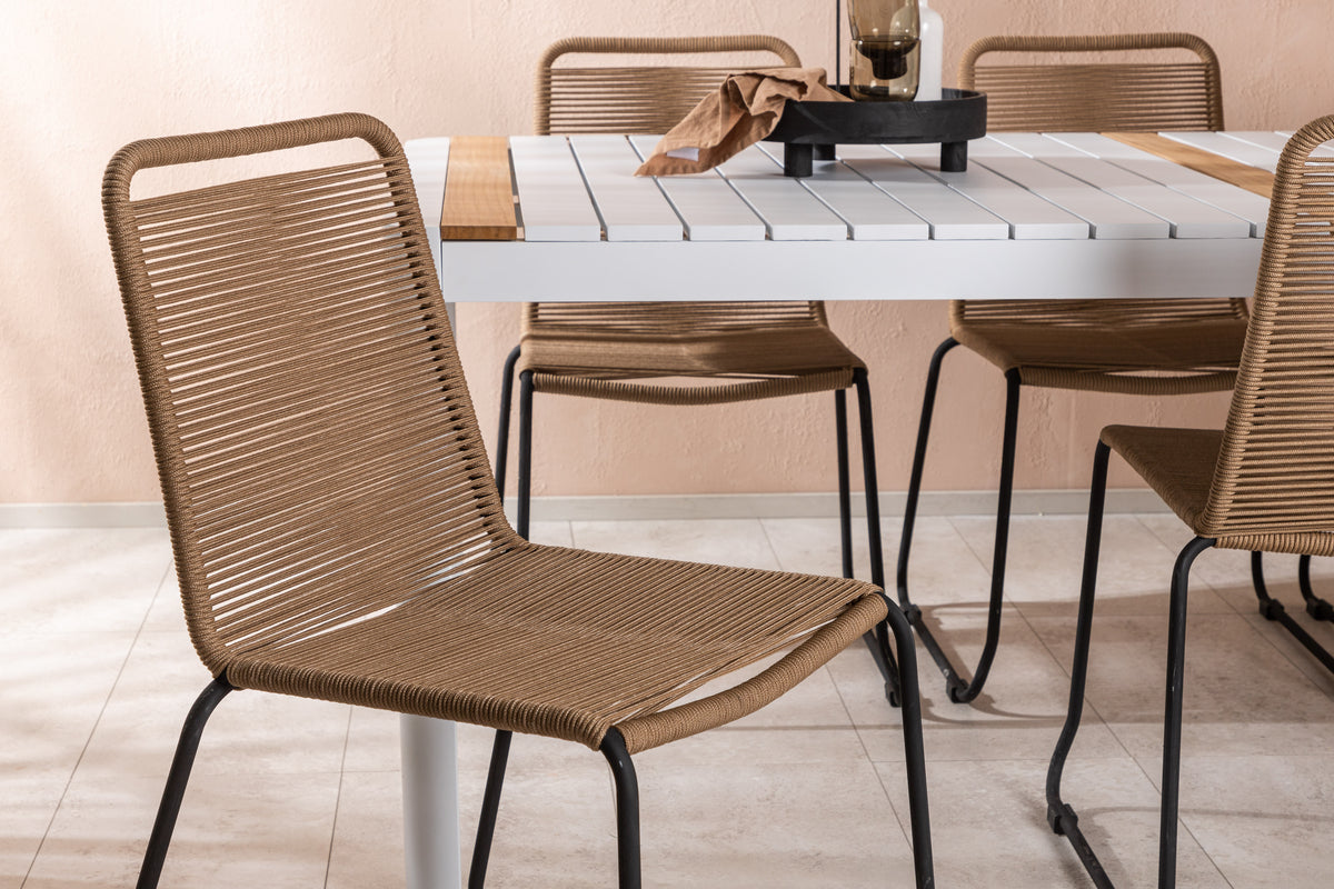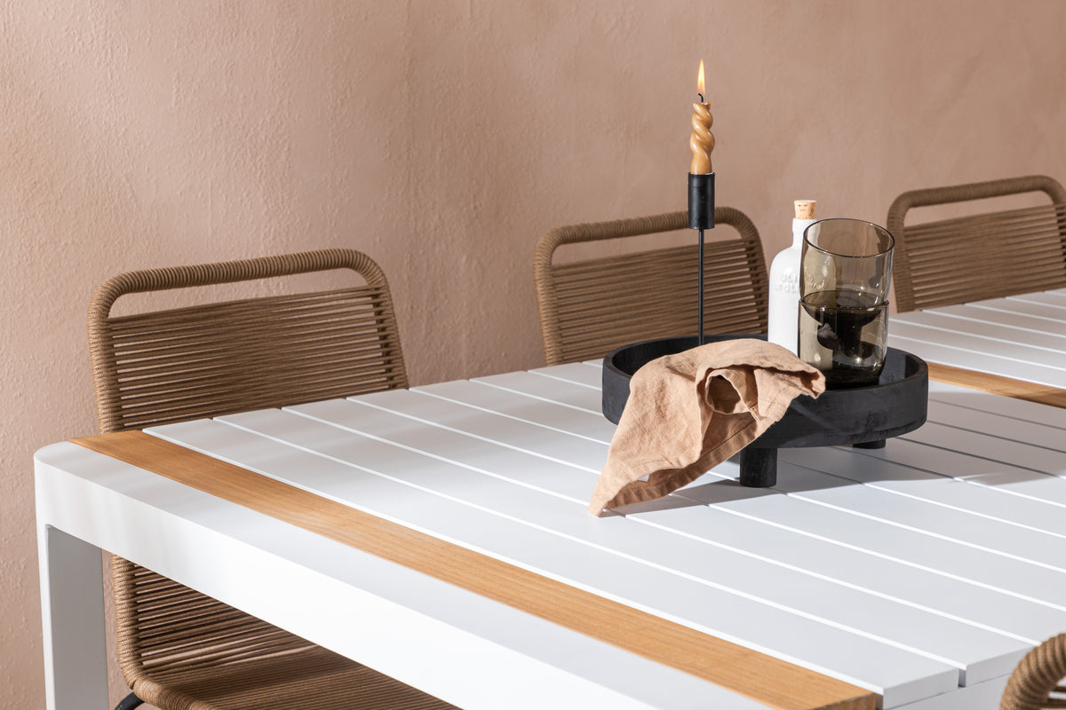 Skapa ett trendsäkert blickfång som imponerar - den här matgruppen är lika iögonfallande som slitstark! Matbord Togo har ett smakfullt utförande med en rektangulär bordsskiva i vit och träfärgad teak och ett underrede i vit aluminium. Mått: 200x100. Här i modern kombination med lattefärgade matstolar från serien Lindos. Stolarna är stapelbara, har stilrent smala ben i svart aluminium och en sits i slitstarkt beige rep. Den jordnära kulören ger ett varmt intryck till möblemanget. Bjud in till många trivsamma måltider framöver!