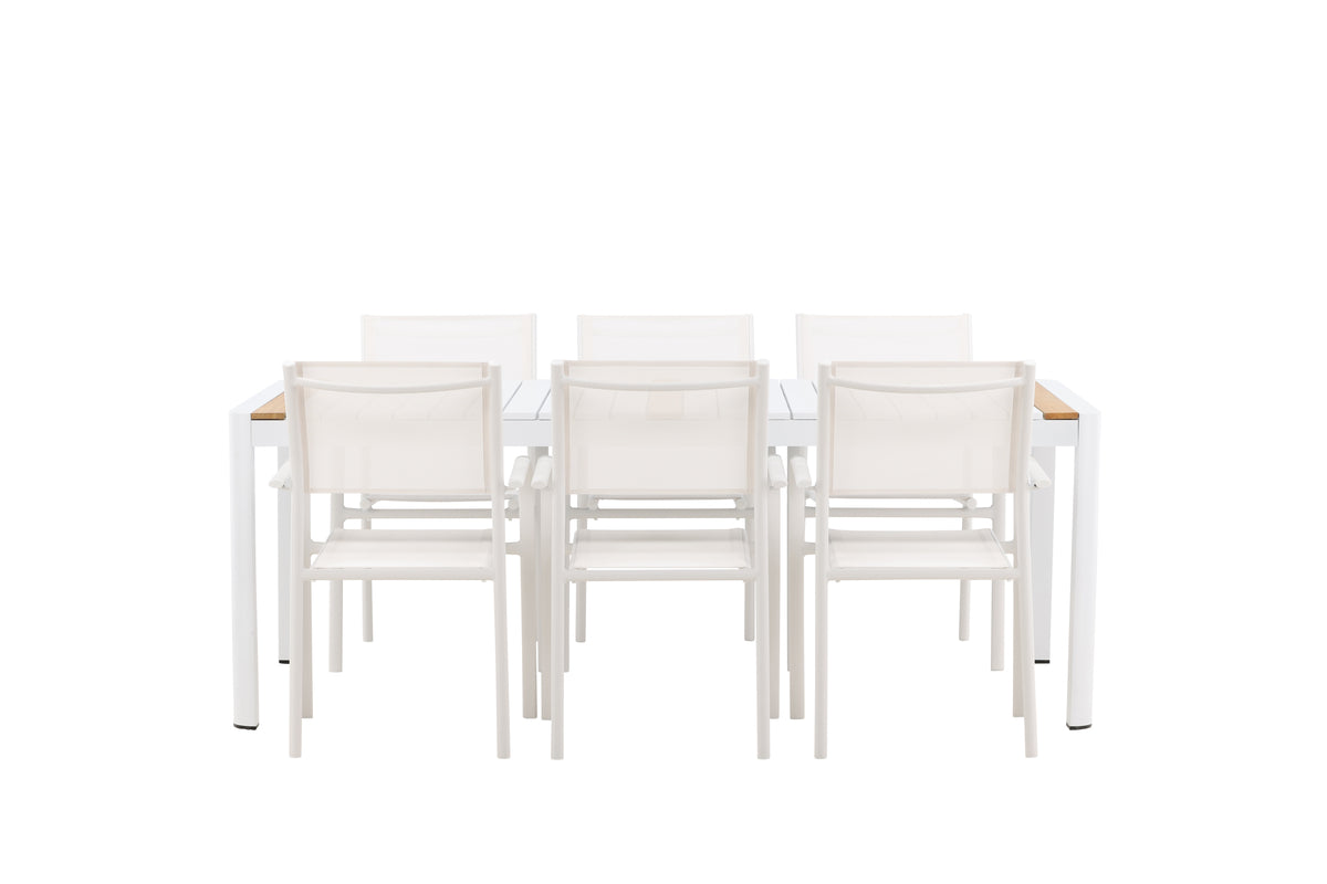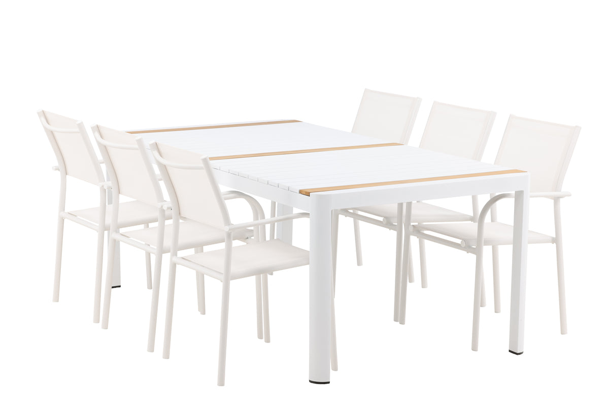 Möblera uteplatsen inbjudande och charmigt med en matgrupp som skriker lyx! Matbord Togo har ett smakfullt utförande med en rektangulär bordsskiva i vit och träfärgad teak och ett underrede i vit aluminium. Mått: 200x100. Här i smäcker kombination med nätta matstolar från serien Santorini. Stolarna har raka nordiska former med integrerade armstöd i aluminium och en sits i vit textilene. De är även stapelbara för praktisk förvaring. Njut av måltider utomhus i sommar!