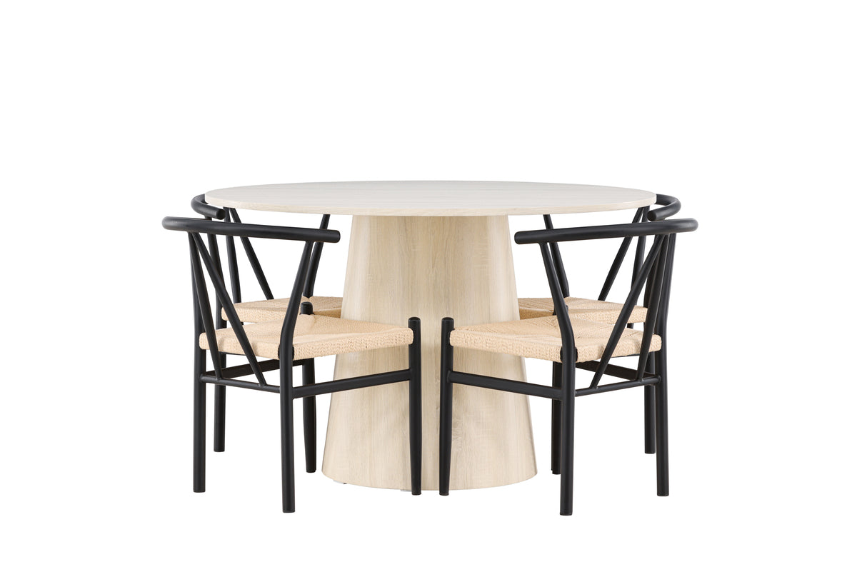 Skapa en inbjudande och stilren matplats med vår eleganta matgrupp som kombinerar det vackra bordet Lanzo med de charmiga Alfons-stolarna. Perfekt för både vardagsmiddagar och festliga tillfällen, ger denna matgrupp ditt matrum en modern och harmonisk känsla. Matbordet Lanzo, tillverkat av vitvättad MDF, har en ljus och fräsch färg som tillför en ren och inbjudande atmosfär till ditt matrum. Med en generös diameter på 120 cm erbjuder bordet gott om plats för mat och samtal, samtidigt som dess runda form skapar en balanserad och social miljö. Bordets robusta konstruktion säkerställer långvarig användning och stabilitet. De fyra Alfons-stolarna kompletterar bordet perfekt med sina eleganta sitsar klädda i beige rotting och stilrena svarta ben. Dessa stolar erbjuder både komfort och stil, vilket gör dem idealiska för långa, njutbara middagar med familj och vänner. Deras moderna design med naturliga material och svart kontrast ger ditt matrum en sofistikerad och samtida touch. Denna matgrupp är en perfekt kombination av estetik och funktionalitet, vilket gör den till ett utmärkt val för dig som söker en elegant och bekväm matplats. Uppgradera ditt matrum med kombinationen av Lanzo-bordet och Alfons-stolarna, och skapa en plats där minnen och glädje delas.