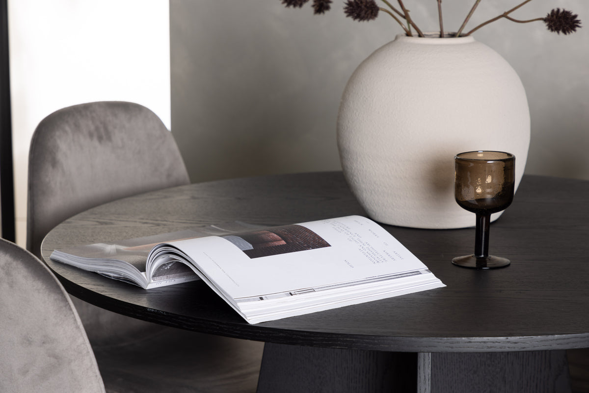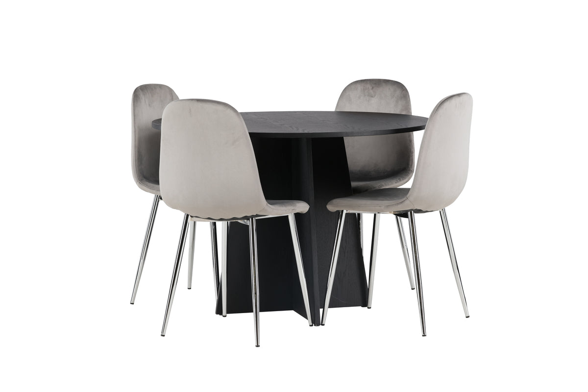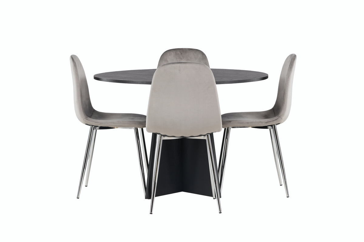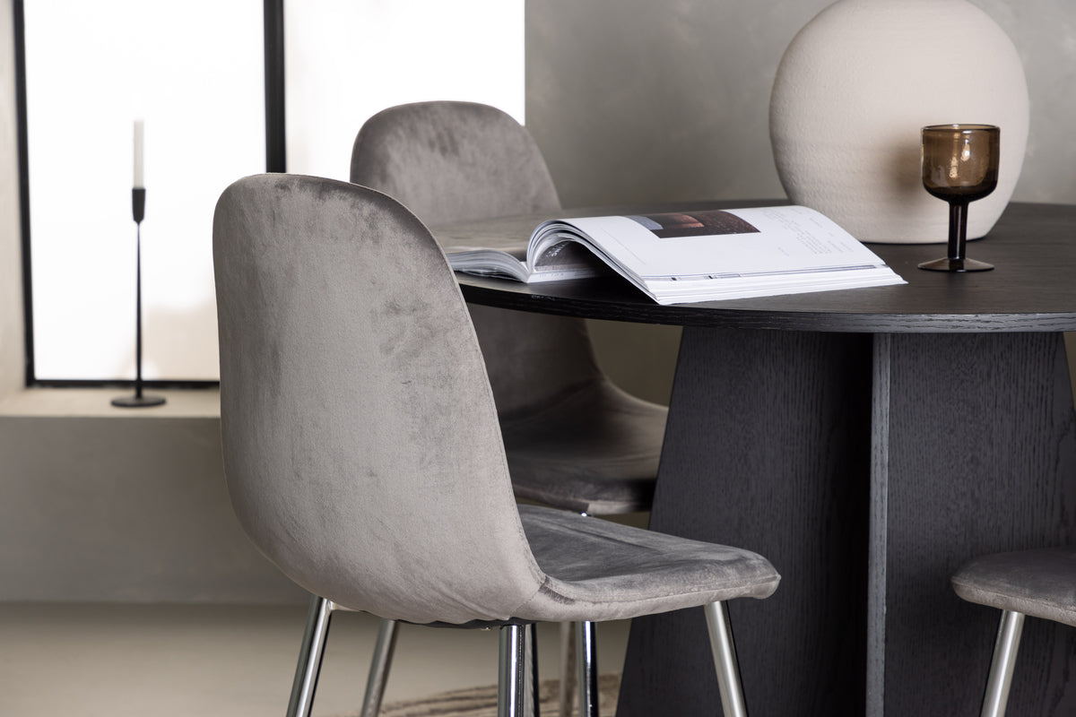 Välkommen till en matgrupp som förenar stil och funktionalitet på ett sätt som kommer att ta din inredning till nya höjder. Vårt runda matbord Bootcut blir snabbt den nya perfekta mittpunkten för dina middagsbjudningar framöver. Med sin tidlösa svarta färg och rundade form skapar det en omedelbar känsla av elegans och tillhörighet – här hamnar ingen på kanten. Bordet är i svart MDF med faner och den robusta stommen ger bra stabilitet till bordet samt bidrar till ett designrikt blickfång. Bordets mått: 110cm. Men en matgrupp är inte komplett utan bekväma stolar att sitta på, och det är här stolarna från serien Eva kommer in i bilden. Deras ljusgrå sammetstyg smälter harmoniskt ihop med Bootcut-bordets eleganta svarta färg, och skapar en trendsäker kontrast som lockar fram en känsla av lyx och modemedvetenhet. Stolsbenen är i kromat silver och ger en modern touch till helheten. Men de är såklart inte bara snygga utan även otroligt sköna att sitta på. Med den här matgruppen får du det bästa av två världar. Så varför vänta? Skapa enastående middagar och minnesvärda stunder med denna fantastiska, runda matgrupp. Här slipper du kompromissa mellan stil och komfort!