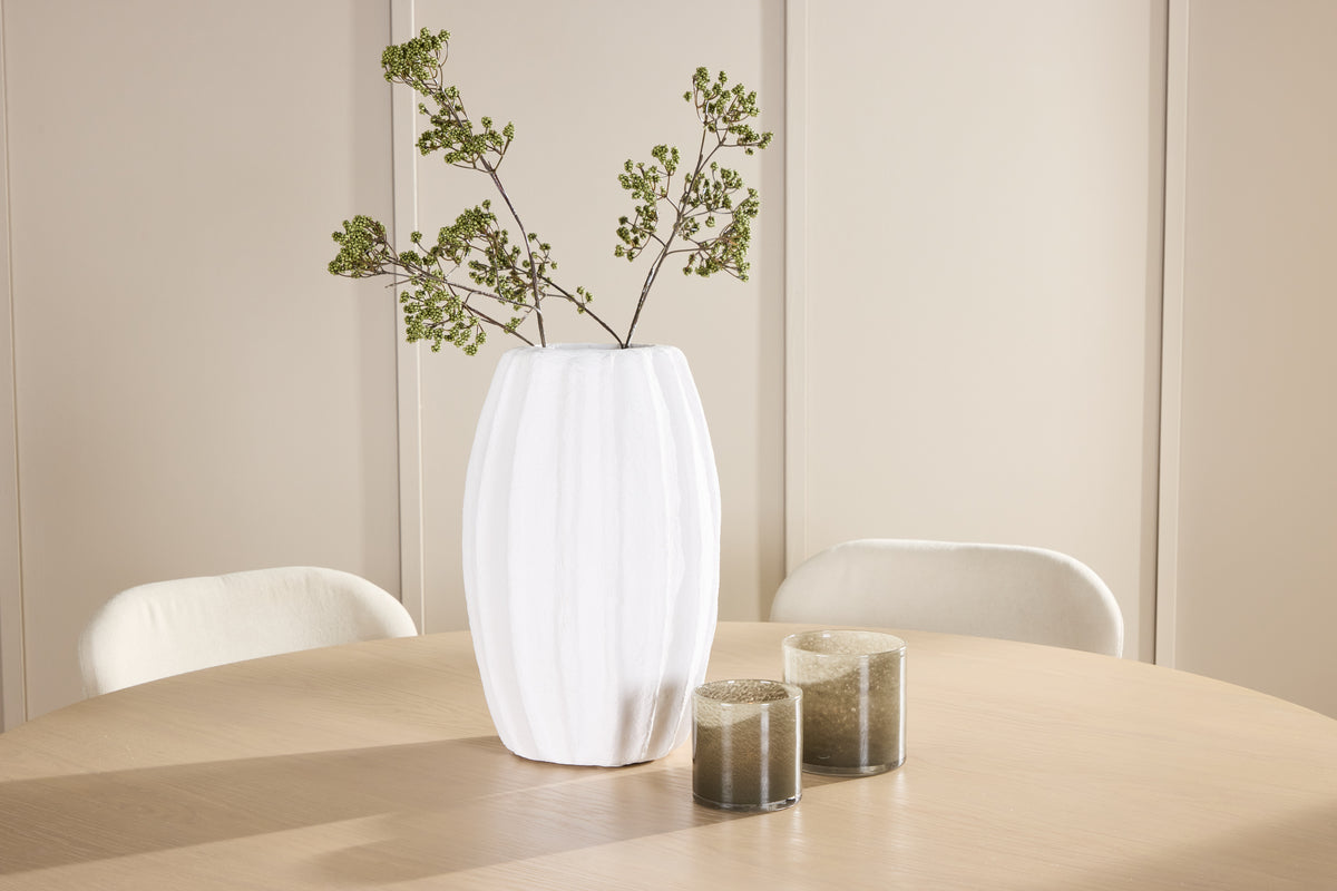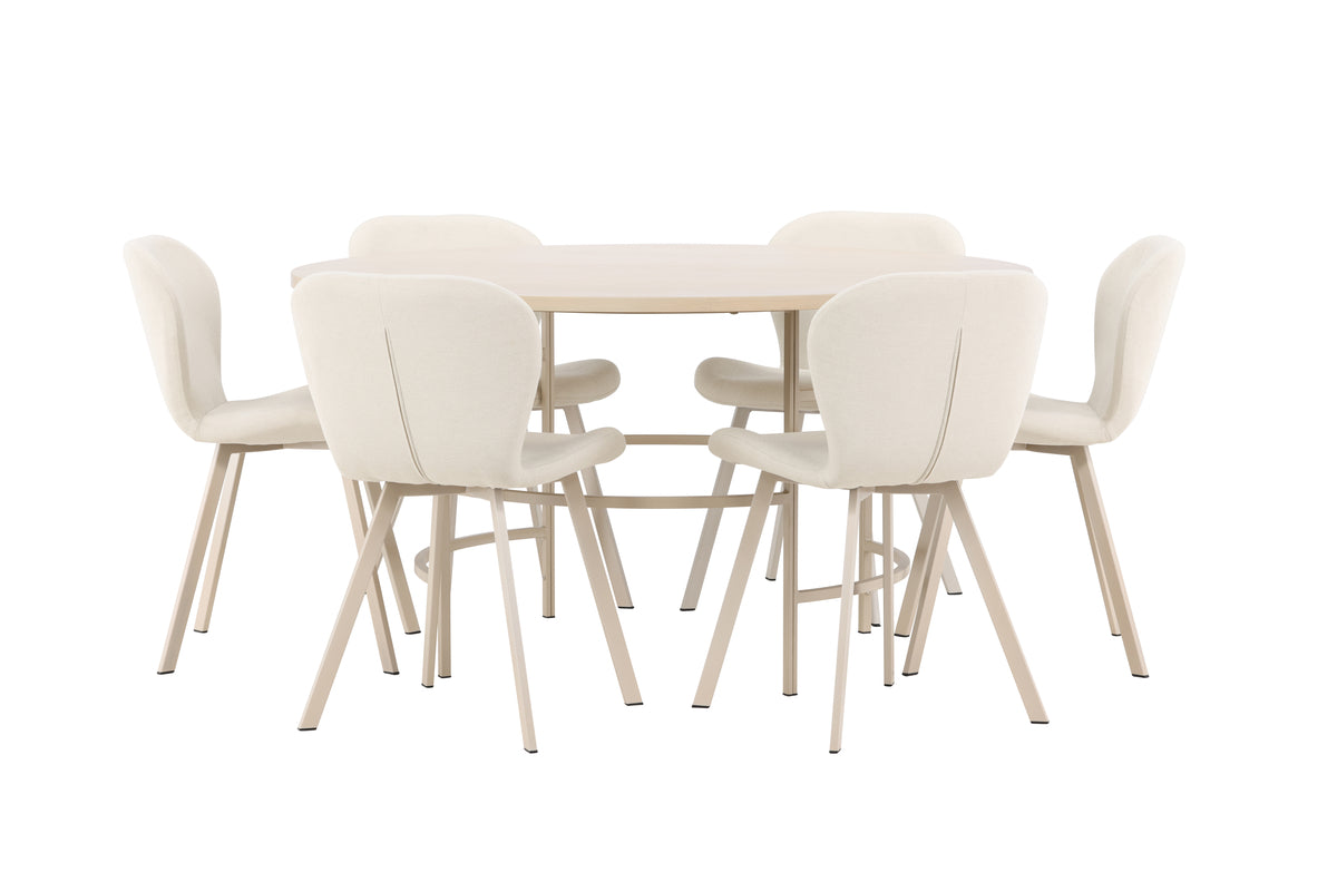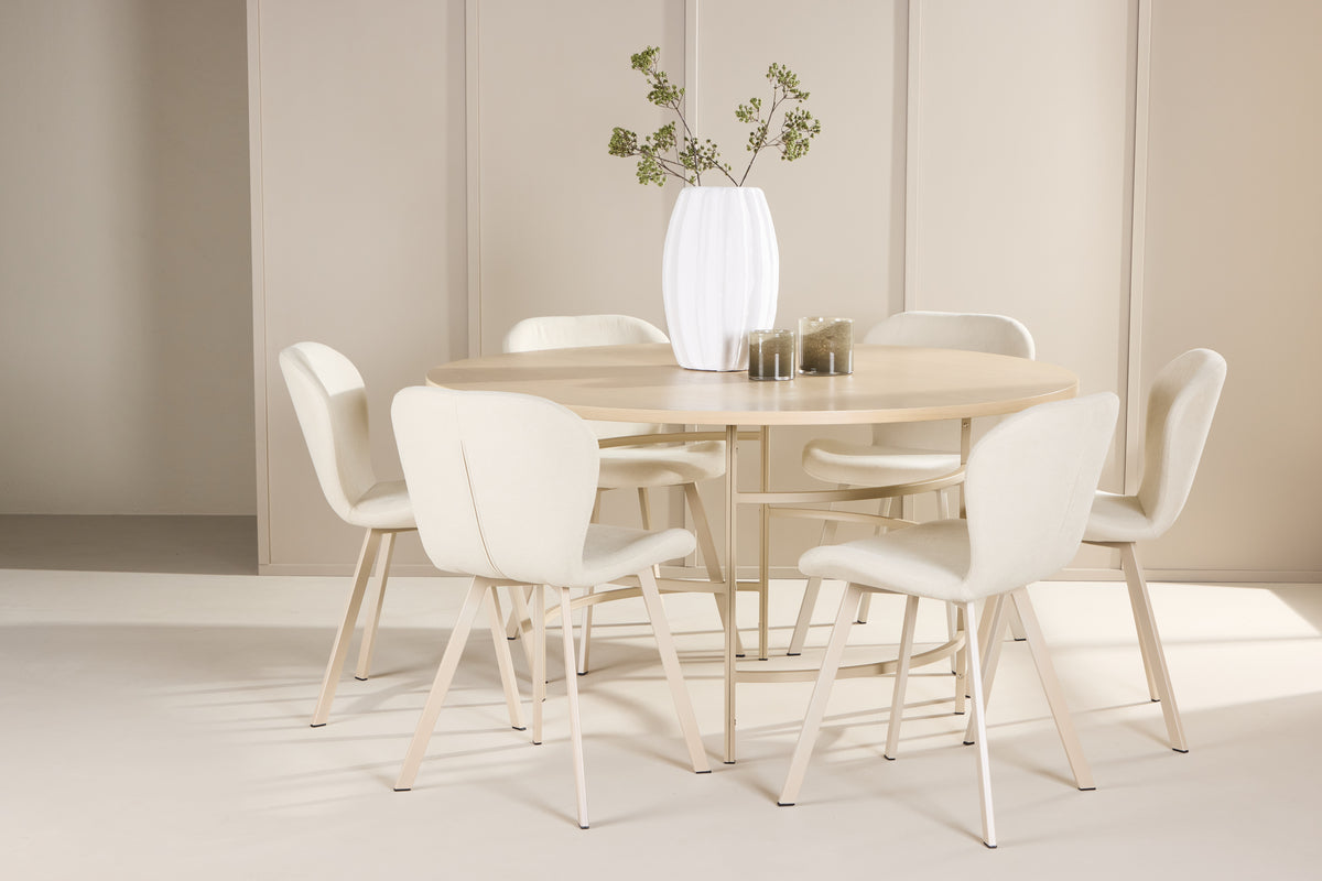 Skapa en harmonisk och elegant matplats med matstolen Lilja och matbordet Copenhagen. Uppgradera din matplats med en stilren kombination av komfort, funktion och tidlös design. Matstolen Lilja och matbordet Copenhagen erbjuder en perfekt balans mellan skandinavisk minimalism och praktisk funktionalitet, vilket skapar en inbjudande och sofistikerad atmosfär i ditt hem. Matstolen Lilja är designad för både komfort och estetik. Med sin sofistikerade beige klädsel och ergonomiskt utformade ryggstöd kombinerar den praktisk funktion med stilren elegans. Den mjuka, neutrala färgen gör det enkelt att matcha Lilja med olika inredningsdetaljer och färgpaletter, oavsett om ditt hem präglas av en modern eller klassisk stil. Komplettera stolarna med matbordet Copenhagen, en tidlös möbel som förenar skandinavisk minimalism med praktisk design. Bordet har en rund form och en generös diameter på 140 cm, vilket erbjuder gott om plats för både vardagliga måltider och festliga tillställningar. Bordsskivan i vittvättad färg framhäver träets naturliga struktur och ger en ljus, luftig känsla som smälter in i alla inredningsstilar. Den runda formen på matbordet Copenhagen bjuder in till gemenskap och naturlig interaktion vid varje måltid, medan matstolen Liljas bekväma och eleganta design säkerställer att varje sittning blir njutbar. Låt matstolen Lilja och matbordet Copenhagen tillsammans förvandla ditt matrum till en plats där stil, funktion och komfort möts. Skapa en elegant och inbjudande miljö där varje måltid blir en njutbar upplevelse.