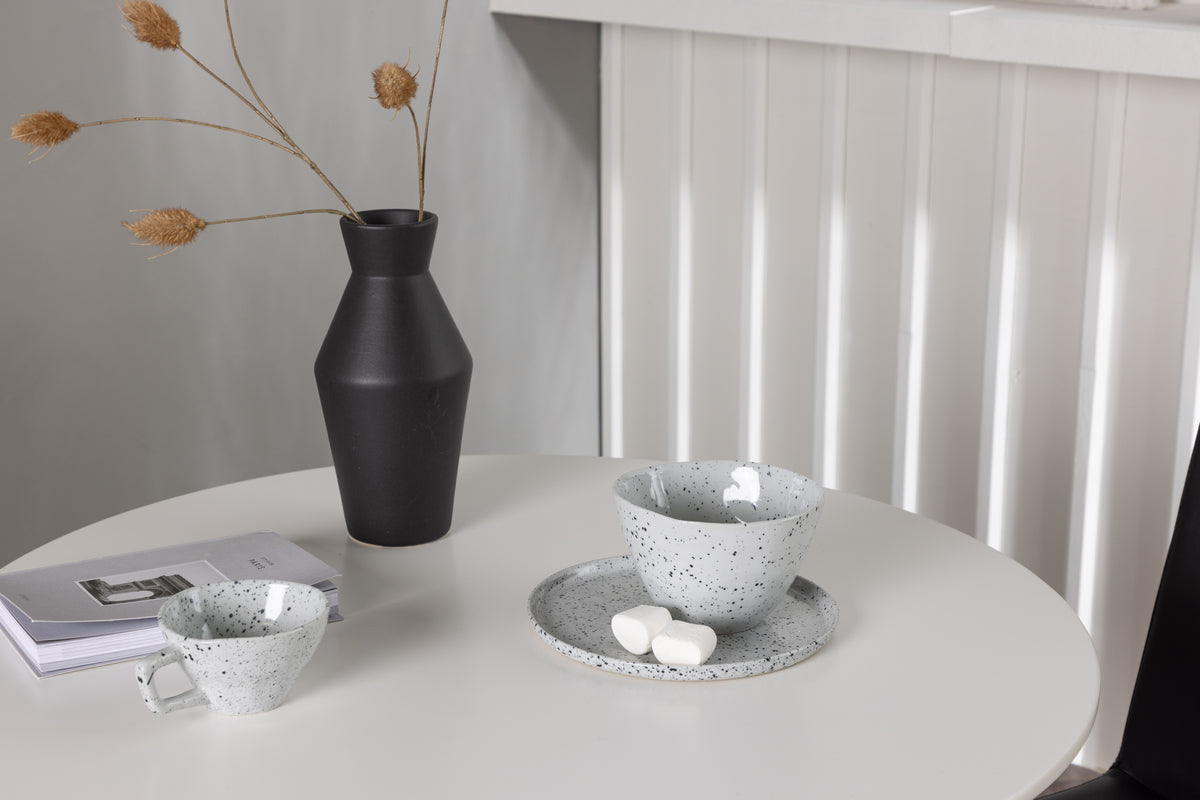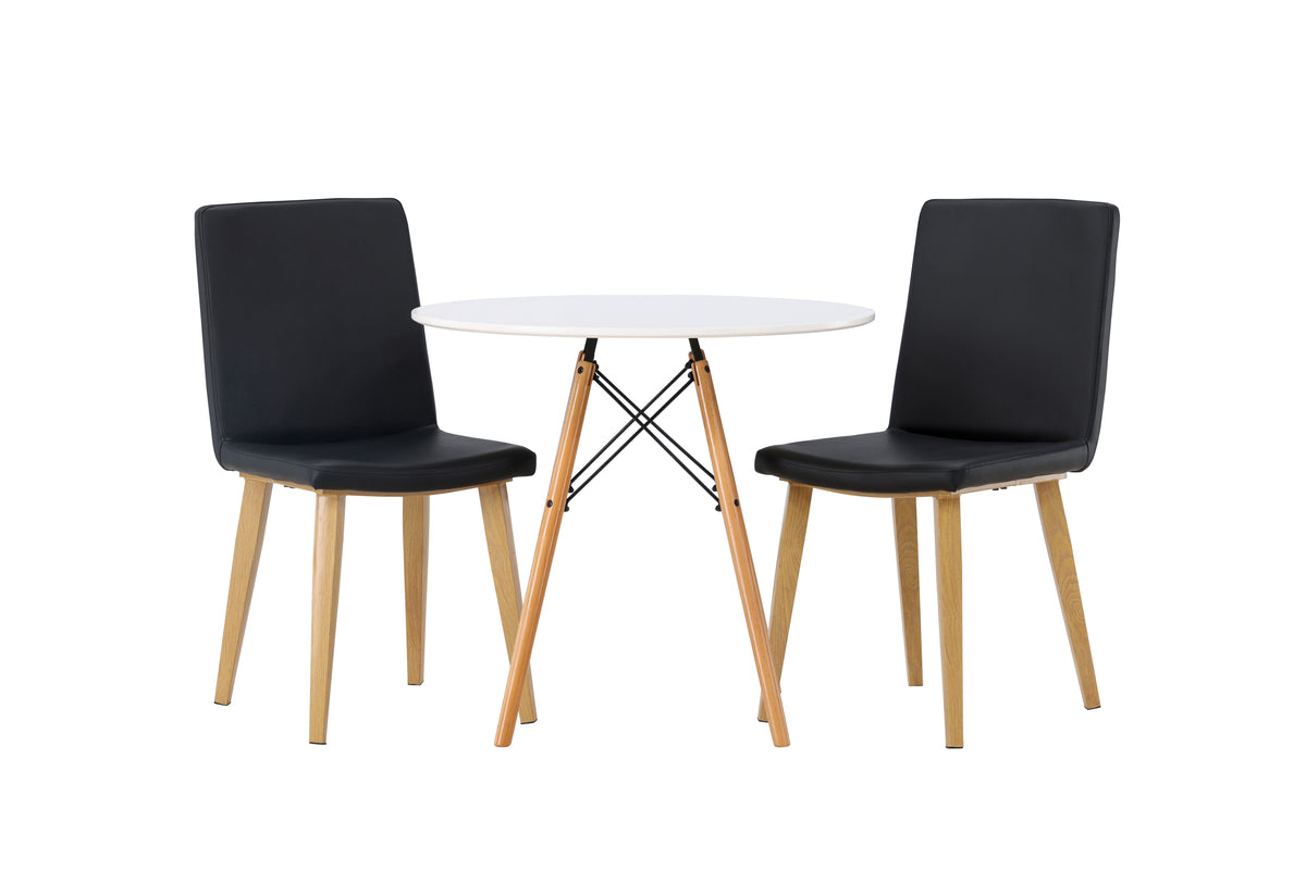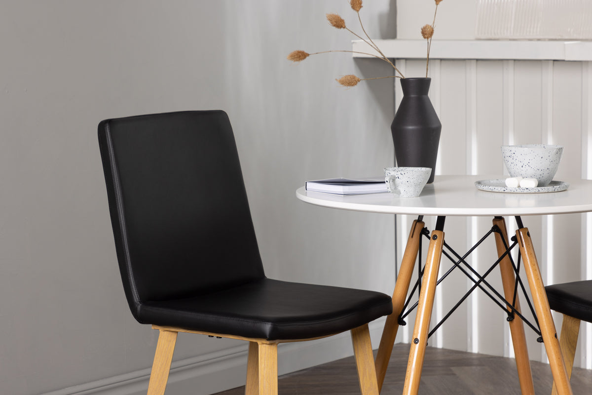 En perfekt match av svarta kulörer och trämaterial! Det runda matbordet Danburi har en klassisk design med en rund bordsskiva i vit MDF och lätt utsvängda ben i bokträ med dekorativa detaljer i svart stål. Här tillsammans med snygga, svarta matstolar från serien Today. Stolen har raka nordiska former och en kaxig helklädd sits i svart konstläder. Benen är lätt utsvängda i naturträ och ger ett stadigt intryck. Här sitter du trivsamt länge! Bordets diameter: 60cm.