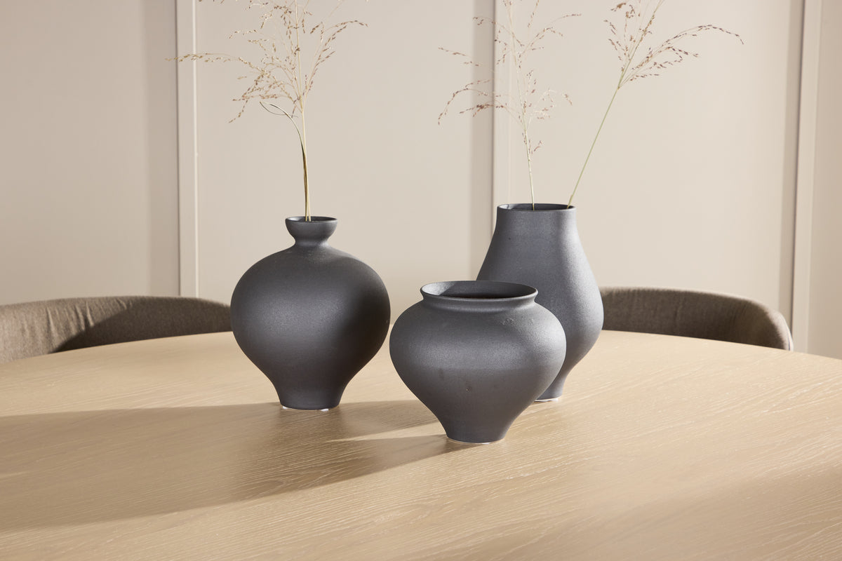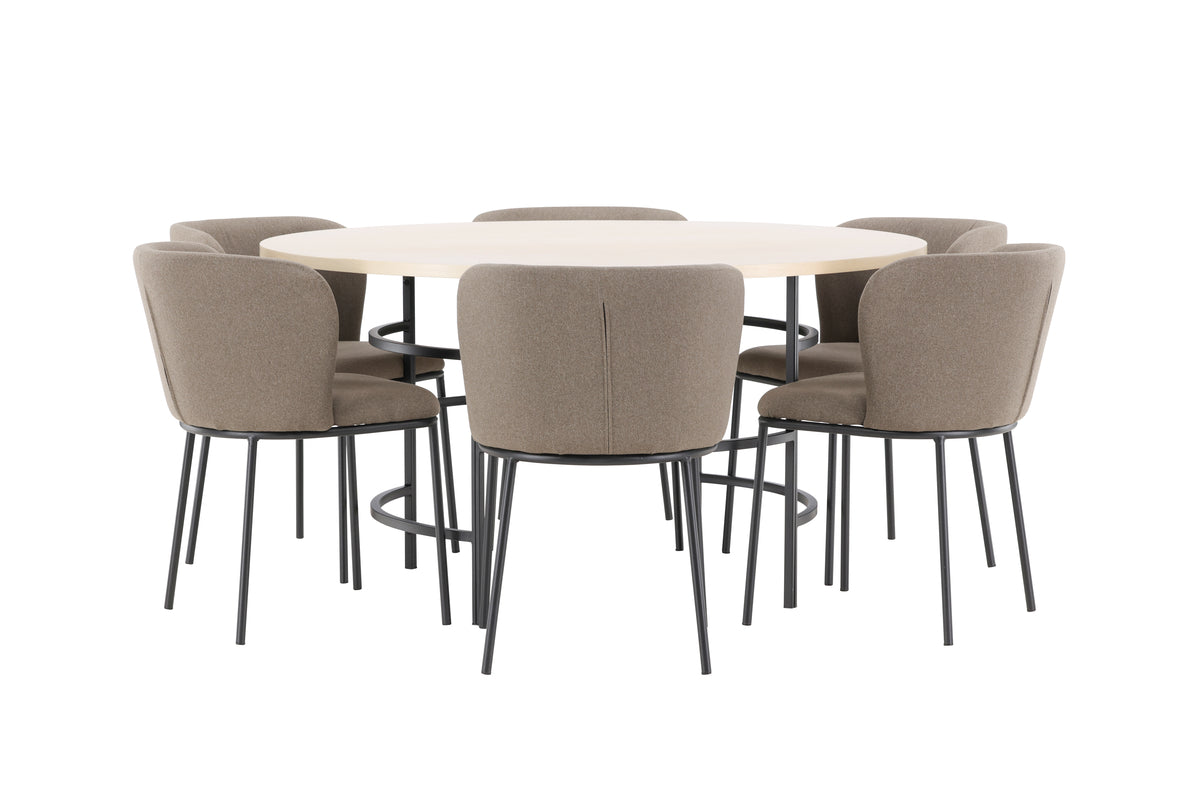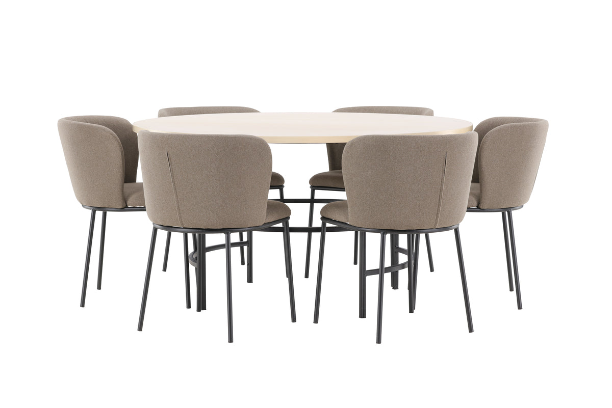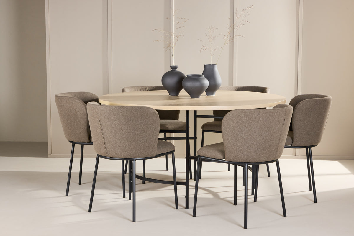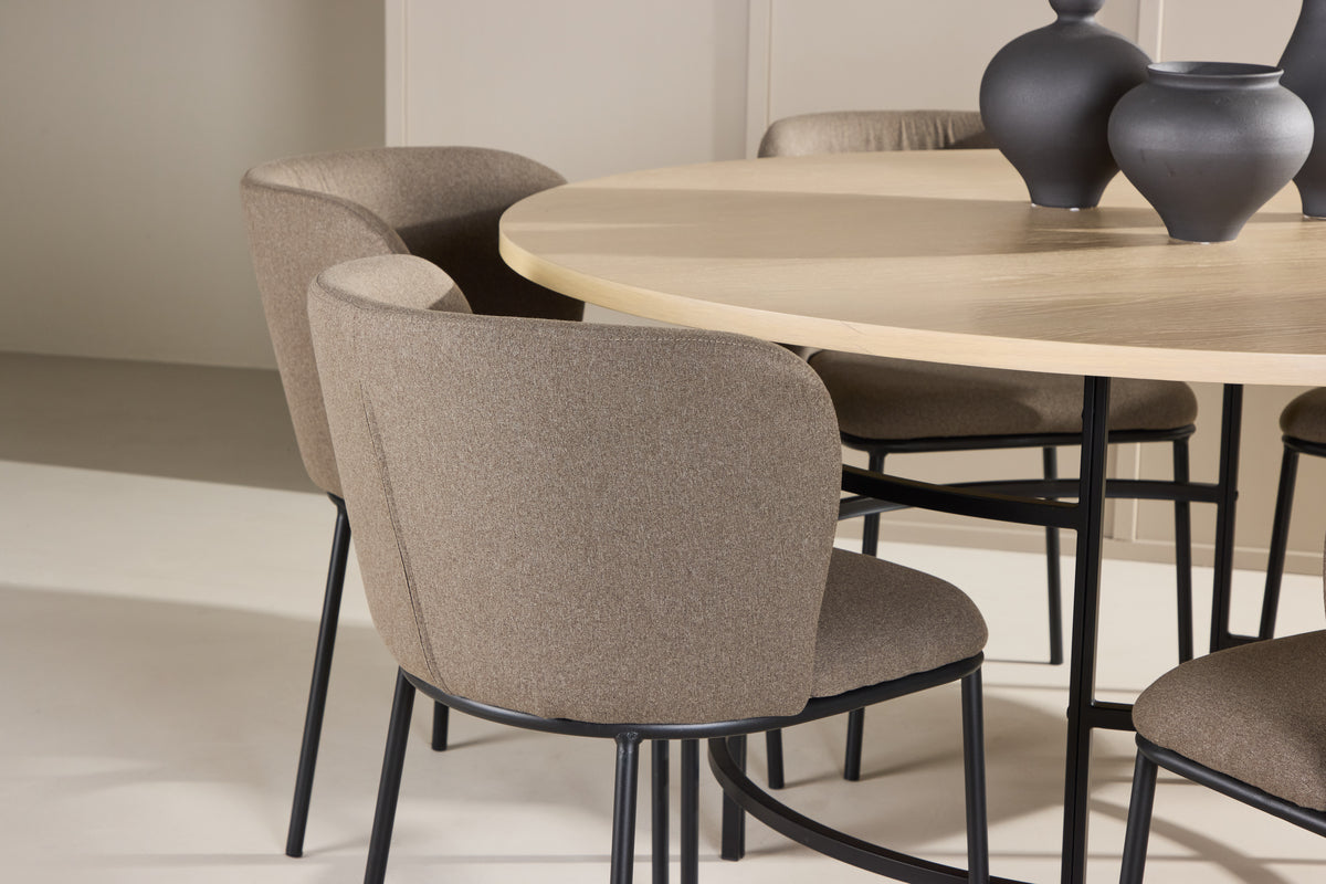 Förvandla din matplats med den eleganta matgruppen bestående av matbordet Copenhagen och matstolen Edina – en perfekt kombination av stil, funktion och komfort. Matbordet Copenhagen erbjuder en tidlös design som förenar skandinavisk minimalism med praktisk funktion. Den runda bordsskivan, med en generös diameter på 140 cm, ger gott om plats för både vardagliga måltider och festliga tillställningar. Den vittvättade ytan ger bordet en ljus, luftig känsla och framhäver träets naturliga struktur, vilket ger en subtil men elegant finish. Den neutrala nyansen gör bordet lätt att kombinera med olika färger och inredningsdetaljer, vilket gör det till ett mångsidigt val för alla hem. Tillsammans med bordet får du matstolen Edina, som med sin sits klädd i vackert brunt linnetyg tillför en varm och rustik känsla. Den naturliga linnefibern ger en mjuk och bekväm yta att sitta på, samtidigt som den varma bruna tonen tillför jordnära elegans. Stolen har en ergonomisk design som ger bra stöd under långa måltider, vilket gör den idealisk för både vardagliga middagar och festligare tillfällen. Med matbordet Copenhagen och matstolarna Edina får du en inbjudande och stilfull matplats där både design och funktion smälter samman. Låt denna grupp bli en central del av ditt hem och skapa en harmonisk miljö för varje måltid.