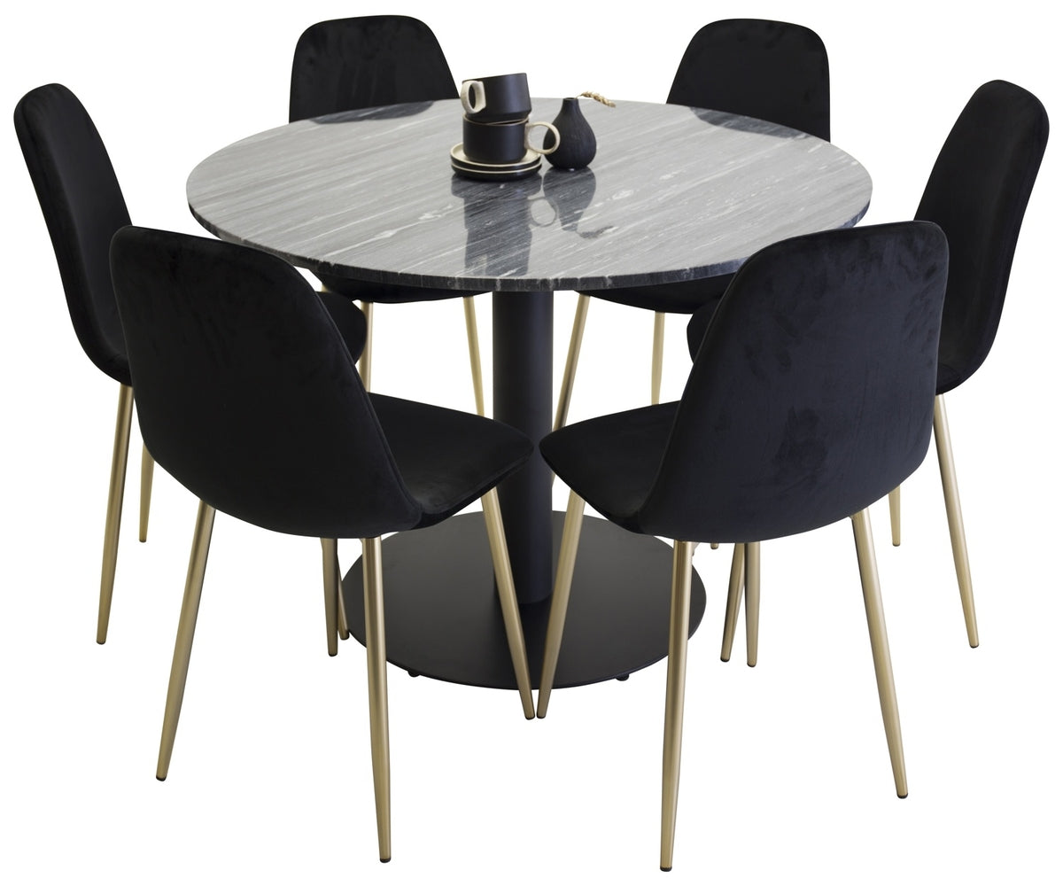 Runda matgrupper har en tendens att skapa en härlig stämning runt bordet! Här kombineras vårt moderna matbord Estelle i vacker marmor med våra lyxiga stolar i Polar.