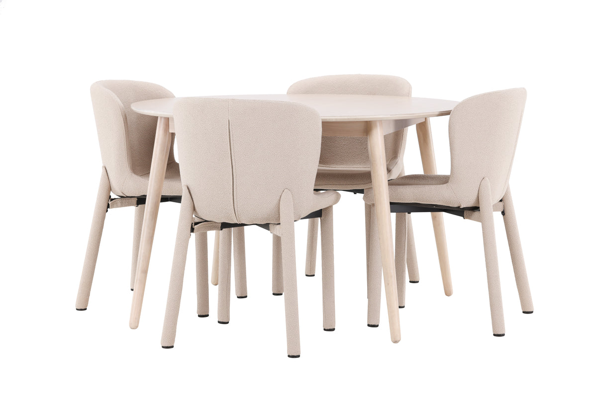 Skapa en sofistikerad och inbjudande matplats med matstolen Astoria och matbordet Flora. Förvandla din matplats till en elegant och harmonisk samlingspunkt där stil möter funktion. Matstolen Astoria och matbordet Flora kompletterar varandra perfekt för att skapa en atmosfär av lyx och komfort, perfekt för både vardagsmiddagar och festliga tillfällen. Matstolen Astoria är klädd i elegant beige bouclé som tillför en sofistikerad och exklusiv känsla till ditt hem. Bouclétygets mjuka struktur och naturliga nyans smälter vackert in i olika inredningsstilar – från modern minimalism till klassisk elegans. Astorias ergonomiska ryggstöd och generösa stoppning i sitsen gör stolen både bekväm och stödjande, vilket gör den idealisk för långa och njutbara måltider med familj och vänner. Matbordet Flora är tillverkat i vackert vittvättat fanerträ med en diameter på 120 cm, vilket ger gott om plats för att samla familj och vänner. Den runda formen uppmuntrar till samtal och skapar en känsla av närhet runt bordet. Den ljusa fanerytan framhäver träets naturliga struktur och skapar en subtil elegans som passar lika bra i moderna som klassiska miljöer. Tillsammans skapar Astoria och Flora en perfekt balans mellan sofistikerad design och funktionalitet. Den mjuka beige bouclén hos Astoria kompletterar Floras ljusa och inbjudande finish, vilket resulterar i en harmonisk och stilfull matplats.