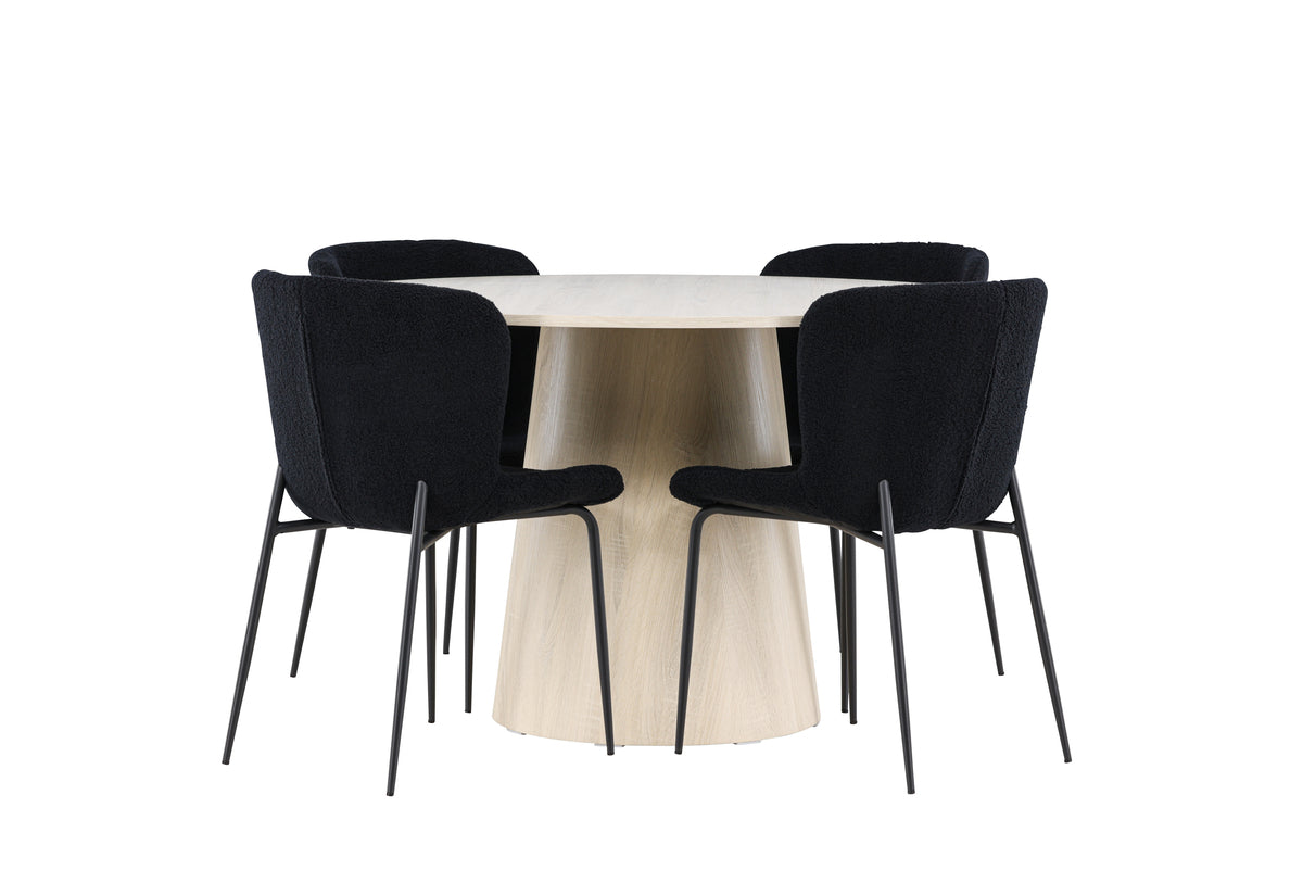 Skapa en modern och inbjudande matplats med vår eleganta matgrupp som kombinerar det stilrena bordet Lanzo med de bekväma Modesto-stolarna. Perfekt för både vardagsmiddagar och festliga tillfällen, ger denna matgrupp ditt matrum en sofistikerad och harmonisk känsla. Matbordet Lanzo, tillverkat av vitvättad MDF, har en ljus och fräsch färg som tillför en ren och inbjudande atmosfär till ditt matrum. Med en generös diameter på 120 cm erbjuder bordet gott om plats för mat och samtal, samtidigt som dess runda form skapar en balanserad och social miljö. Bordets robusta konstruktion säkerställer långvarig användning och stabilitet. De fyra Modesto-stolarna kompletterar bordet perfekt med sina eleganta sitsar klädda i svart polyester teddy. Dessa stolar erbjuder både komfort och stil, vilket gör dem idealiska för långa, njutbara middagar med familj och vänner. Deras moderna design med hög ryggstöd och mjuka sitsar ger ditt matrum en sofistikerad och samtida touch. Denna matgrupp är en perfekt kombination av estetik och funktionalitet, vilket gör den till ett utmärkt val för dig som söker en elegant och bekväm matplats. Uppgradera ditt matrum med kombinationen av Lanzo-bordet och Modesto-stolarna, och skapa en plats där minnen och glädje delas.