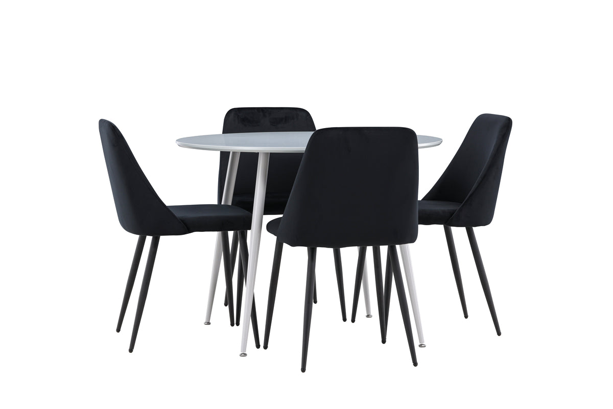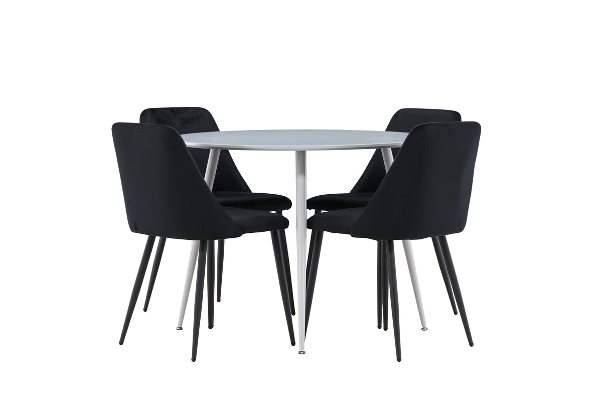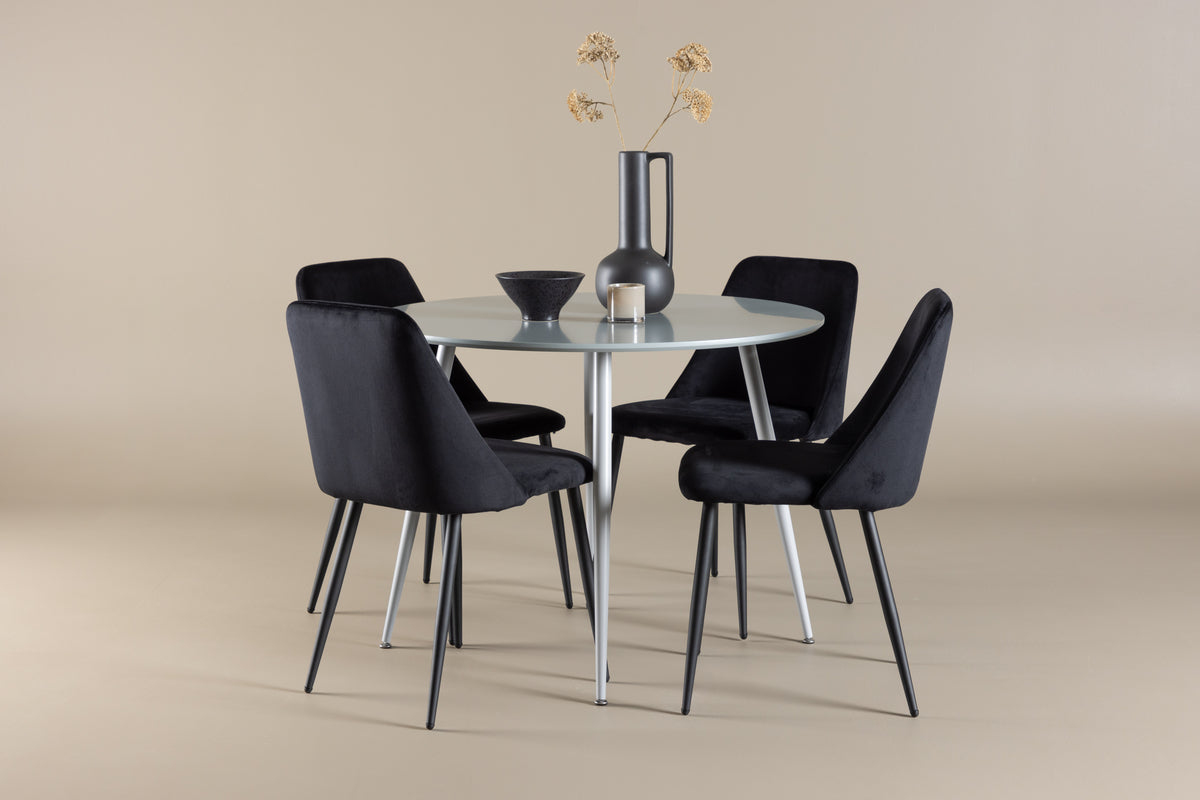 Ge ditt matrum en touch av modern elegans med matgruppen som består av bordet Plaza och stolarna Night. Denna matgrupp erbjuder en perfekt balans mellan stil och komfort och är ett idealiskt tillskott till ditt hem. Matbordet Plaza är en sofistikerad mittpunkt med sin grå färg och konstruktion i MDF. Med en diameter på 100 cm ger bordet generöst med utrymme för måltider och sociala sammankomster, samtidigt som dess kompakta storlek passar utmärkt i både små och stora rum. Den grå nyansen tillför en modern och elegant touch till ditt matrum, och den hållbara ytan är enkel att rengöra och underhålla, vilket garanterar långvarig skönhet och funktionalitet. De fyra medföljande Night-stolarna kompletterar bordet perfekt med sin eleganta design och höga komfort. Stolarna är klädda i svart sammet, vilket ger en mjuk och inbjudande sittupplevelse. Sammetstyget är känt för sin elegans och bekvämlighet, vilket gör att du och dina gäster kan sitta bekvämt under långa måltider och trevliga samtal. De svarta stolarna skapar en stilfull kontrast mot det grå bordet, vilket ger ditt matrum en modern och sofistikerad atmosfär. Matgruppen Plaza med Night-stolar är det perfekta valet för dig som vill skapa en elegant och funktionell matsalsmiljö. Kombinationen av modern design och hög komfort gör varje måltid till en njutbar upplevelse. Välkommen till en ny nivå av stil och bekvämlighet i ditt hem med Plaza och Night!