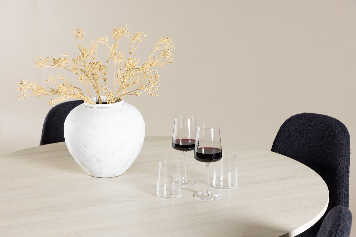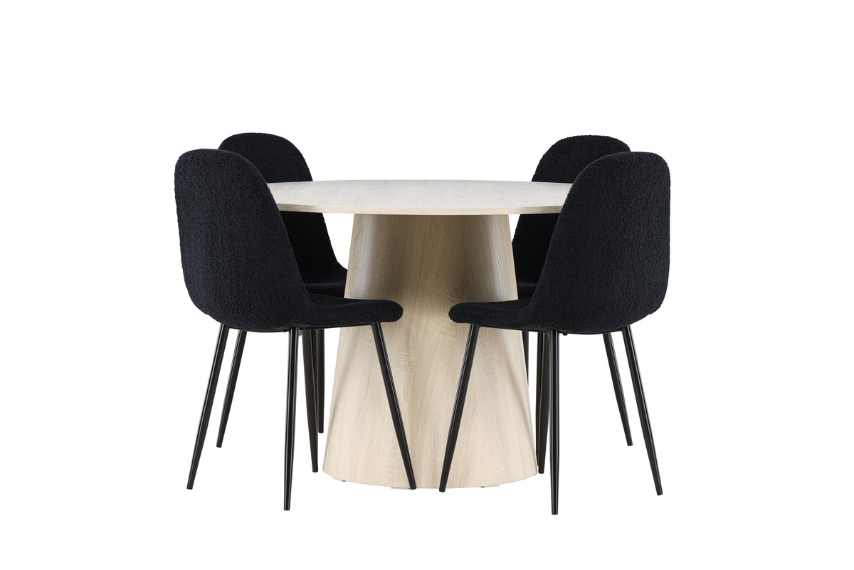 Skapa en stilren och inbjudande matplats med vår eleganta matgrupp som kombinerar det vackra bordet Lanzo med de bekväma Polar-stolarna. Perfekt för både vardagsmiddagar och festliga tillfällen, ger denna matgrupp ditt matrum en modern och sofistikerad känsla. Matbordet Lanzo, tillverkat av vittvättad MDF, har en ljus och fräsch färg som tillför en ren och harmonisk atmosfär till ditt matrum. Med en generös diameter på 120 cm erbjuder bordet gott om plats för mat och samtal, samtidigt som dess runda form skapar en balanserad och inbjudande miljö. Bordets robusta konstruktion säkerställer långvarig användning och stabilitet. De fyra Polar-stolarna kompletterar bordet perfekt med sina eleganta sitsar klädda i svart polyester teddy. Dessa stolar erbjuder både komfort och stil, vilket gör dem idealiska för långa, njutbara middagar med familj och vänner. Deras moderna design med hög ryggstöd och mjuka sitsar ger ditt matrum en sofistikerad och samtida touch. Denna matgrupp är en perfekt kombination av estetik och funktionalitet, vilket gör den till ett utmärkt val för dig som söker en elegant och bekväm matplats. Uppgradera ditt matrum med kombinationen av Lanzo-bordet och Polar-stolarna, och skapa en plats där minnen och glädje delas.