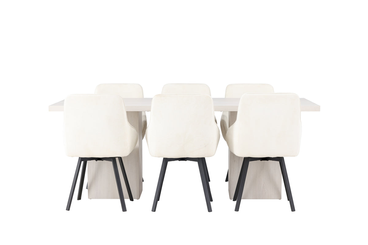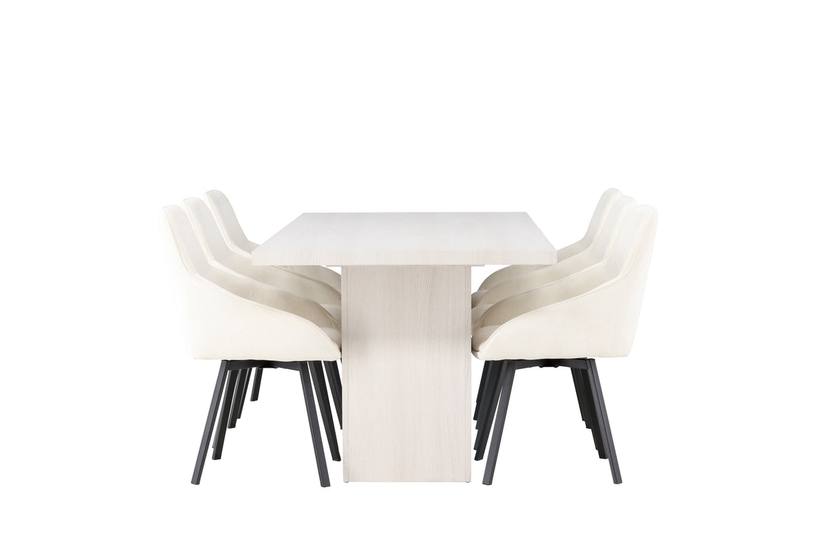 En ljus och fräsch matgrupp som utstrålar modemedvetenhet och stabilitet med sin robusta utformning och stilrena material! Vårt rektangulära matbord Olga med sin vita putsade finish och stilfulla design kommer att sätta tonen för minnesvärda middagar. Bordsskivan är i vitputsad MDF, som ger en känsla av fräschör och ljus. Med två robusta, blockformade bordsben i samma material skapar det en balanserad och stadig bas som stöder dina mest fantastiska middagar. Bordets mått: 200x75cm. För att matcha det vitputsade matbordet kommer våra beige matstolar från serien Rosie. Dessa stolar erbjuder en harmonisk kombination av komfort och stil i en äkta skandinavisk anda. Njut av den bekvämt helklädda sitsen, omfamnad av mjukt beige tyg och integrerade armstöd som ger en extra touch av lyx. De lätt utsvängda stolsbenen i svart metall tillför både en modern och elegant känsla till ditt vardagsrum. Med matbordet Olga och stolarna Rosie får du inte bara en fantastisk kombination av funktion och design, utan även en generös mittpunkt i ditt hem som rymmer plats för både nära och kära. Skapa minnesvärda stunder med familj och vänner i en hemtrevlig atmosfär som du själv kan sätta din prägel på!