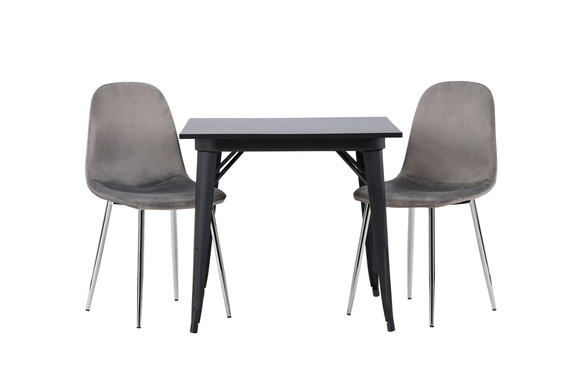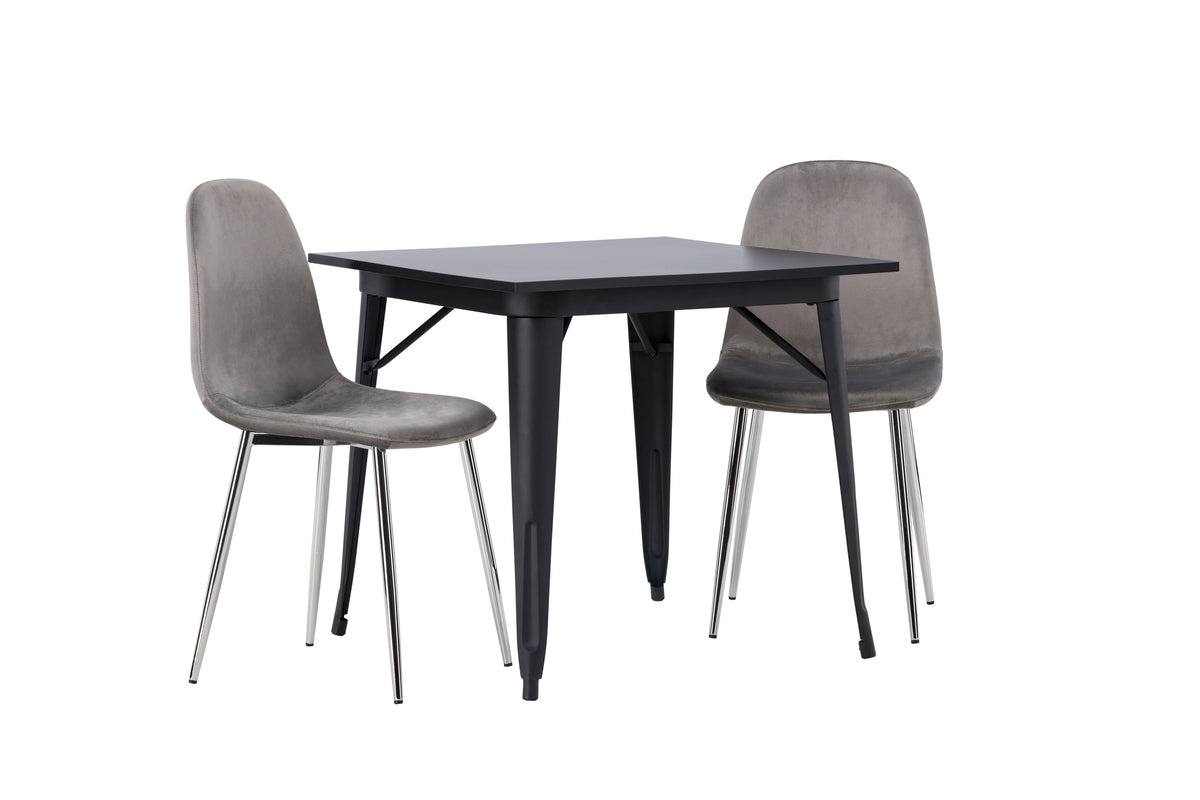 Möblera i behagliga kulörer! Vår kvadratiska matbord Tempe har en nätt storlek och trendig, Skandinavisk utformning. Tillverkad med en bordsskiva i svart MDF och bordsben i svart metall. Här i modern kombination med gråa matstolar från serien Eva. Stolen har en helklädd design med ben i kromad metall, en lätt rundad rygg och sits i smäckert grått sammetstyg med mjuk stoppning för extra komfort. Här får du ett sammetslent blickfång! Bordets mått: 80x80cm.