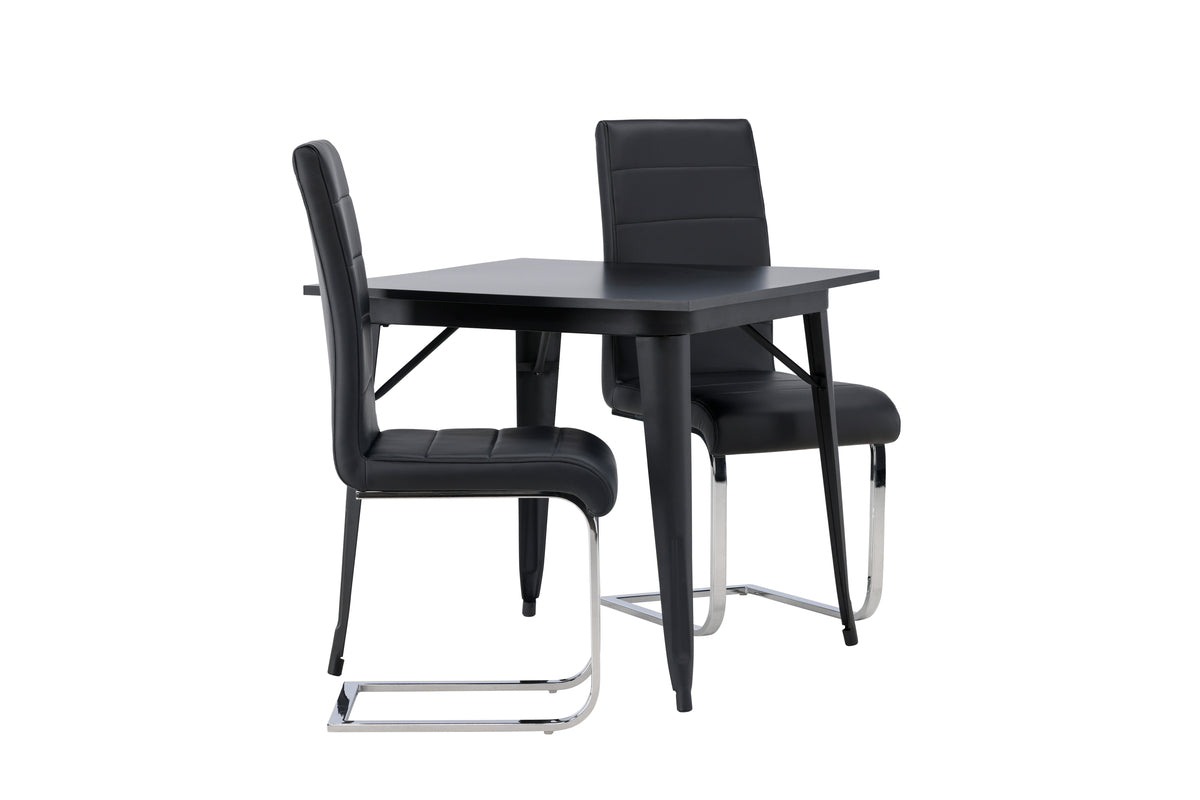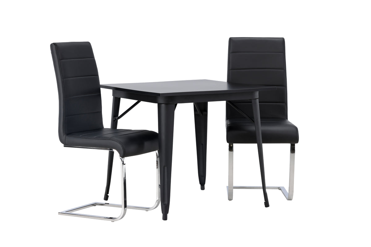 Skapa den där bekväma kontorstilen i köket! Vår kvadratiska matbord Tempe har en nätt storlek och trendig, Skandinavisk utformning. Tillverkad med en bordsskiva i svart MDF och bordsben i svart metall. Här tillsammans med våra pampiga, svarta matstolar från serien Tempo. Stolen har en rak rygg i svart PU med dekorsömmar och benen är dekorativa i kromad metall. Den här gruppen kombinerar industriell design med raka nordiska former! Bordets mått: 80x80cm.