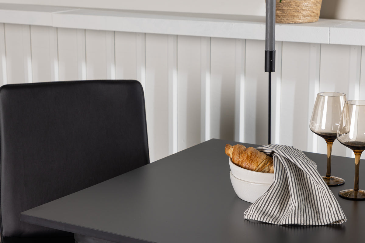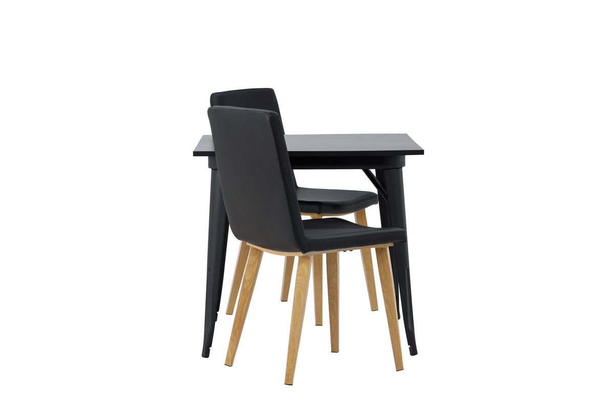Det går aldrig fel med en helsvart matgrupp! Vår kvadratiska matbord Tempe har en nätt storlek och trendig, Skandinavisk utformning. Tillverkad med en bordsskiva i svart MDF och bordsben i svart metall. Här tillsammans med klassiska matstolar från serien Today. Stolen har raka nordiska former och en kaxig helklädd sits i svart konstläder. Stolsbenen är lätt utsvängda i naturträ och ger ett stadigt intryck. Lika smart som stilren! Bordets mått: 80x80cm.