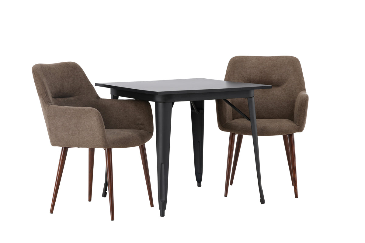 Sjunk ner i vår bekväma matgrupp! Vår kvadratiska matbord Tempe har en nätt storlek och trendig, Skandinavisk utformning. Tillverkad med en bordsskiva i svart MDF och bordsben i svart metall. Här tillsammans med underbara, bruna stolar från serien Tomorrow. Den helklädda sitsen med integrerade armstöd är i brunt polyestertyg och stolsbenen är lätt utsvängda i en modern valnötsbrun kulör. En fantastisk match helt enkelt! Bordets mått: 80x80cm.