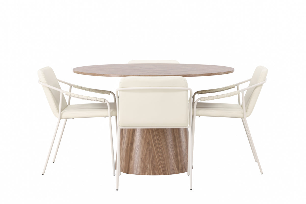 Skapa en charmig mittpunkt i hemmets hjärta med en modern matgrupp i ljusa färger! Det runda matbordet Lanzo är tillverkat av högkvalitativt MDF-material och har en tunn, rund toppskiva som ger en modern och stilren känsla. Dess mest framstående egenskap är den vridna cylinderformade stommen som pryder bordets mitt, vilket ger det en unik och iögonfallande touch. Den jordnära kulören avslöjar även materialets naturliga mönster och ger en varm och inbjudande atmosfär till ditt matrum. Bordets mått i diameter: 120cm. Här har vi kompletterat det träfärgade matbordet med matstolarna från serien Tvist. Stolen har en bekväm sits och ryggstöd klätt i mjukt beige polyuretanskinn och polyester. Deras stilfulla stolsben i vitt järn ger en stabil och pålitlig grund. Med den här matgruppen skapar du en atmosfär som är tidlös och elegant samtidigt som den erbjuder en praktisk lösning till alla trivsamma måltider framöver!