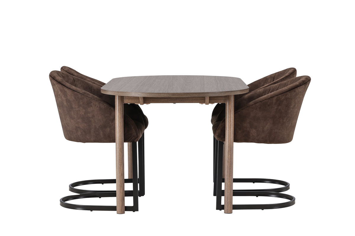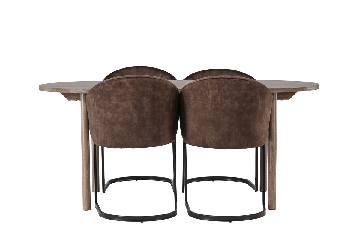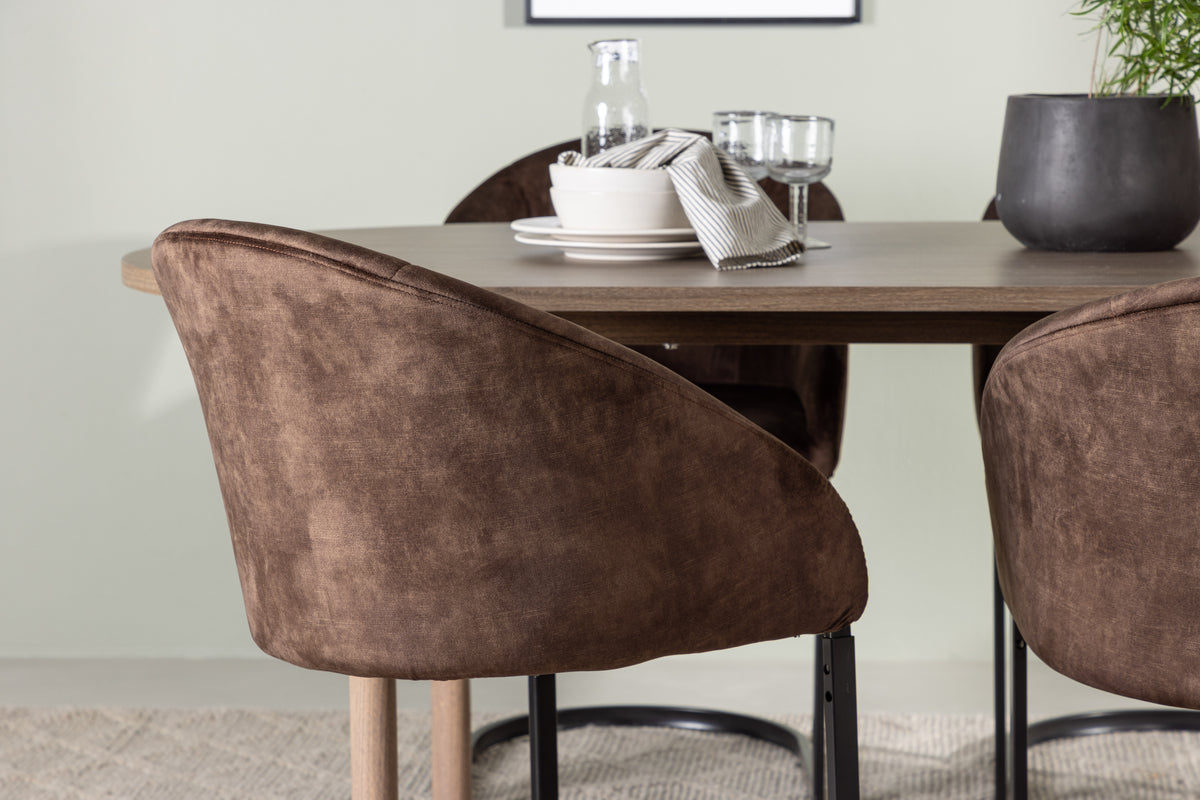 Välkommen hem till en vacker inredningsstil som kombinerar minimalism och charm på ett tidlöst sätt! Med vårt ovala matbord Andy får du den perfekta kombinationen av stil och funktionalitet. Bordet har en tunn bordsskiva i MDF och fyra cylinderformade ben som bidrar till bra hållbarhet. Den naturliga träfärgen på bordet smälter enkelt in i vilken inredning som helst och ger ditt hem en känsla av harmoni. Bordets mått: 180x75cm. Tillsammans med våra bekväma matstolar Evening blir matgruppen komplett. Med sitt nostalgiska uttryck och stilrena design blir de en lyxig blickfångare runt ditt matbord. Stolarna har helklädda säten och mjuka, rundade ryggstöd i brunt tyg som ger extra komfort. Den minimalistiska benstommen i matt brunt stål ger en touch av modernitet och hållbarhet. Skapa en inbjudande atmosfär med den här stilrena matgruppen. Oavsett om du bjuder in till en mysig middag för två eller en festlig samling med vänner kommer matgruppen Andy och Evening att imponera på alla med sin stil och komfort!