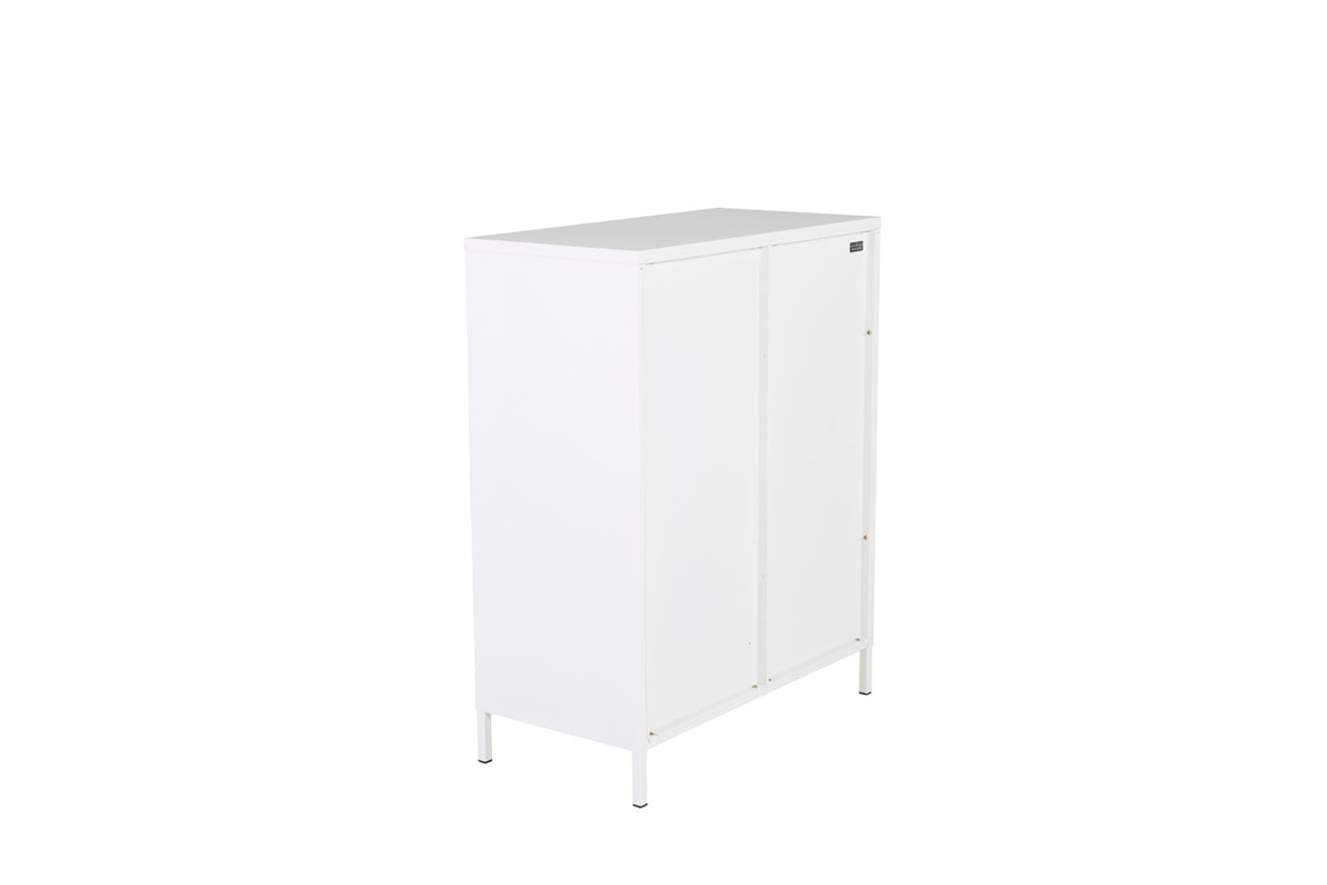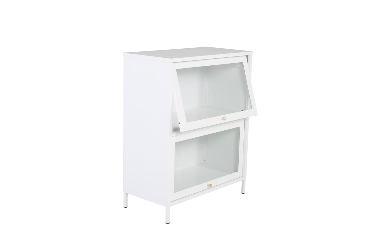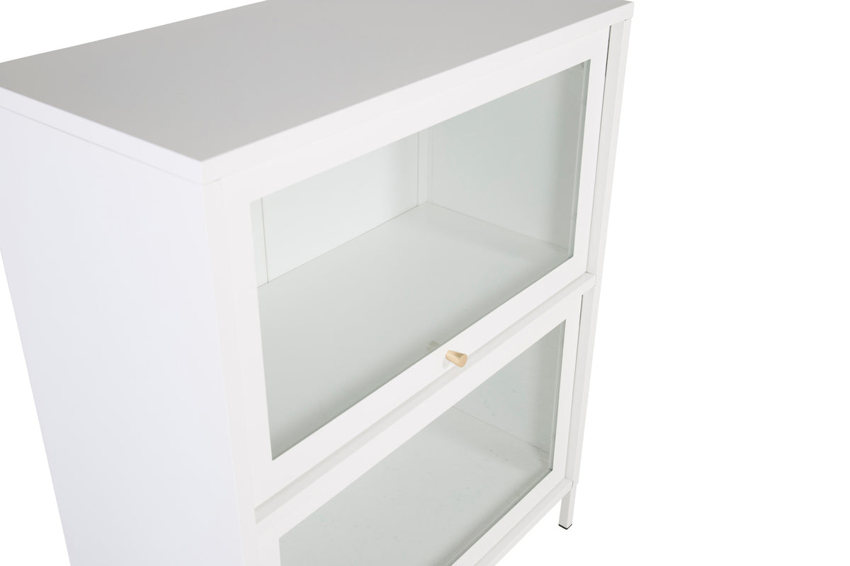 Bakal, i modern industriell design tillverkad i pulverlackerad vitt stål med två glasdörrar. En ram av pulverlackerad vitt stål samt mässingfärgade knoppar. Glasdörrarna öppnas uppåt. Vitrinskåpet vilar på fyra ben i pulverlackerad vitt stål. Mått: Längd: 80 cm, Bredd: 40 cm, Höjd: 100 cm. Lättare montering krävs.