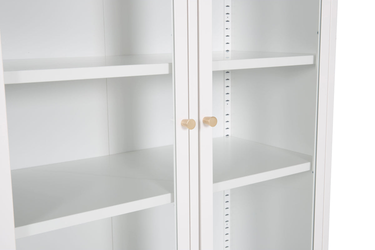 Vitrinskåpet är ett populärt tillskott till inredningen med eleganta förvaringsmöjligheter! Skåpet från serien Bakal har en modern design med raka strukturer, tillverkad i pulverlackerad vit stål. Ovandelen har två höga dörrar i glas som ger härligt ljusinsläpp i skåpet och fyra avlastningsytor för ditt finporslin eller vackra inredningsdetaljer. Nederdelen har två dörrar i pulverlackerad vit stål med två avlastningsytor för dold förvaring. Ett vitrinskåp som erbjuder det bästa av två världar helt enkelt - välj vad du vill visa upp och vad som behöver smart förvaring. Lättare montering krävs. Skötselråd: Aluminium och krom är två material som är avvisande mot smuts och vätskor. Däremot behöver man vara uppmärksam på att vatten ska orsaka fläckar och rost. Se därför till att torka av ytan med en en mjuk fuktad trasa och såpvatten. Om fläckarna eller rosten sitter för hårt rekommenderas en mjuk trasa fuktad i ren alkohol.