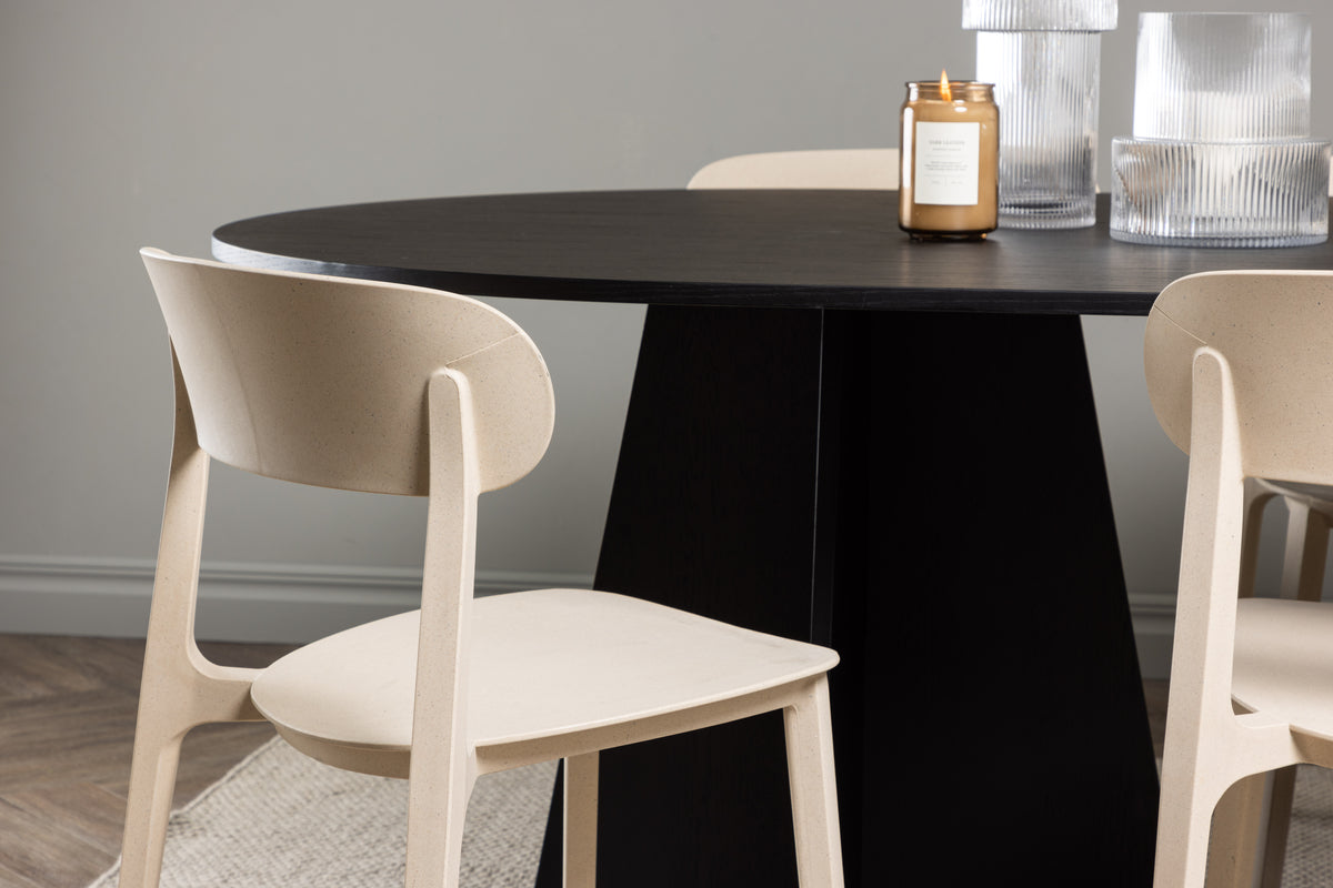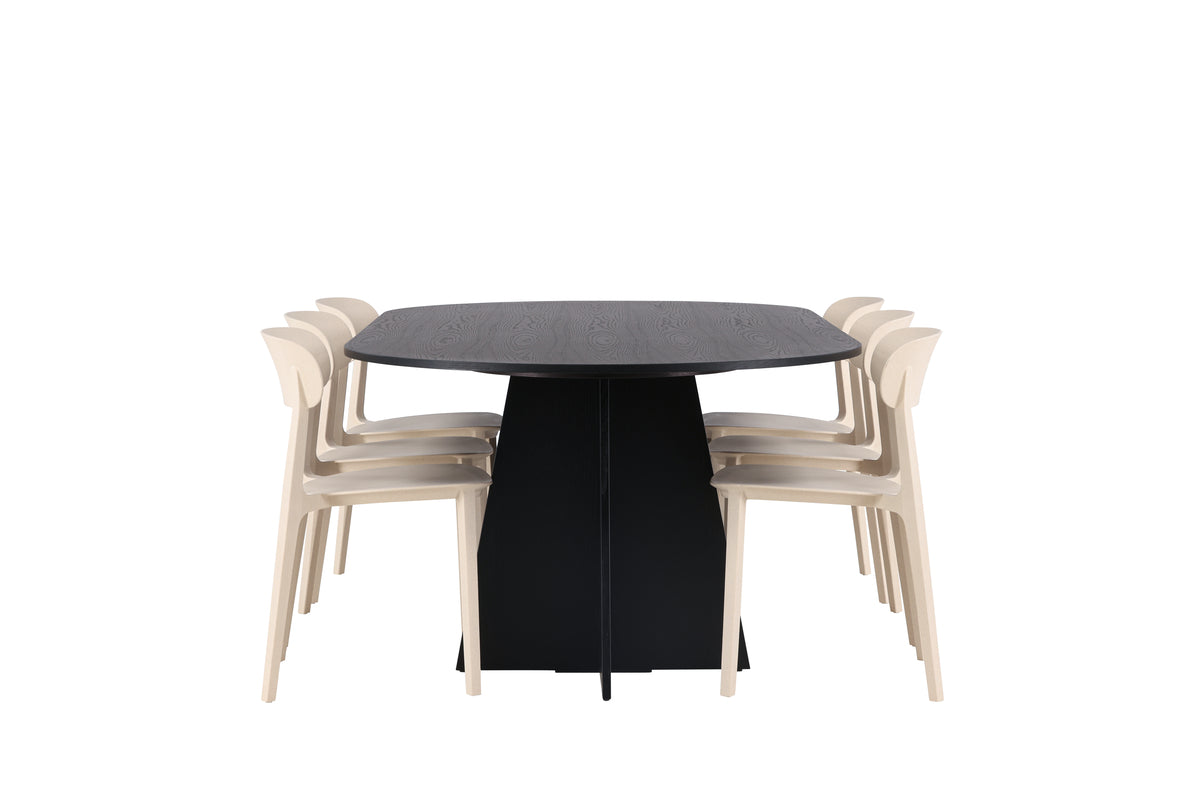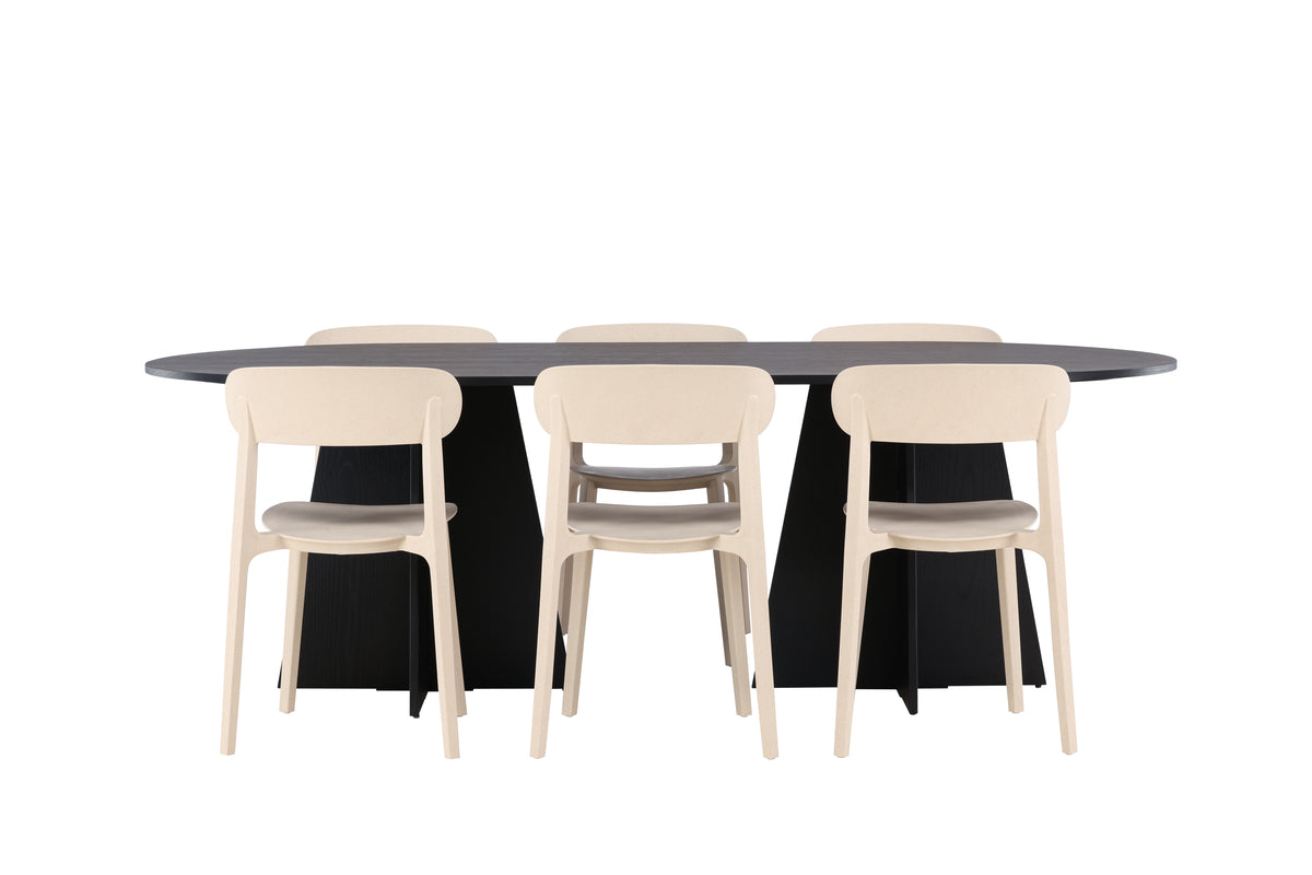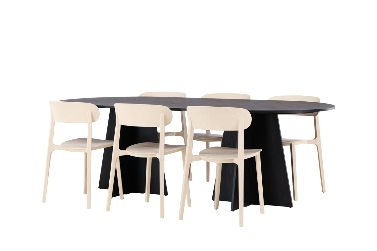 En härlig färgkombination i hållbart trä! Vårt ovala matbord Bootcut har en unik design med en oval bordsskiva i svart MDF med faner och en säregen stomme med två konformade ben i öppen design. Här i smäcker kombination med trästolar från serien Åstol. Stolen är genomgående tillverkad i en smakfull ljusputsad kulör i träkomposit med en luftig utformning och nordiskt raka former. Möblera vardagsrummet hemtrevligt! Bordets mått: 230x115cm.