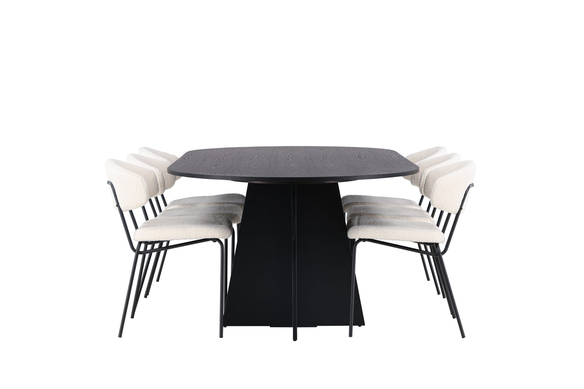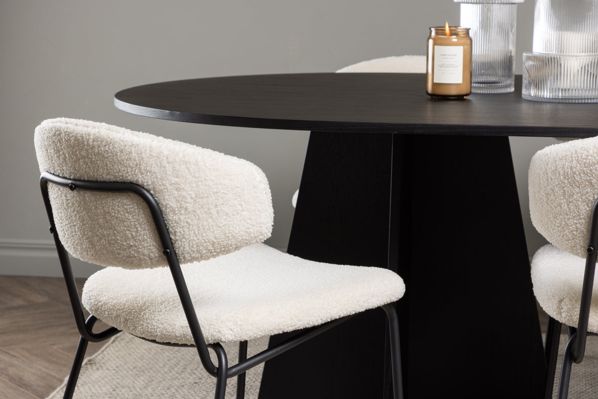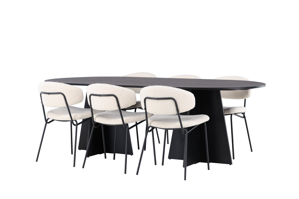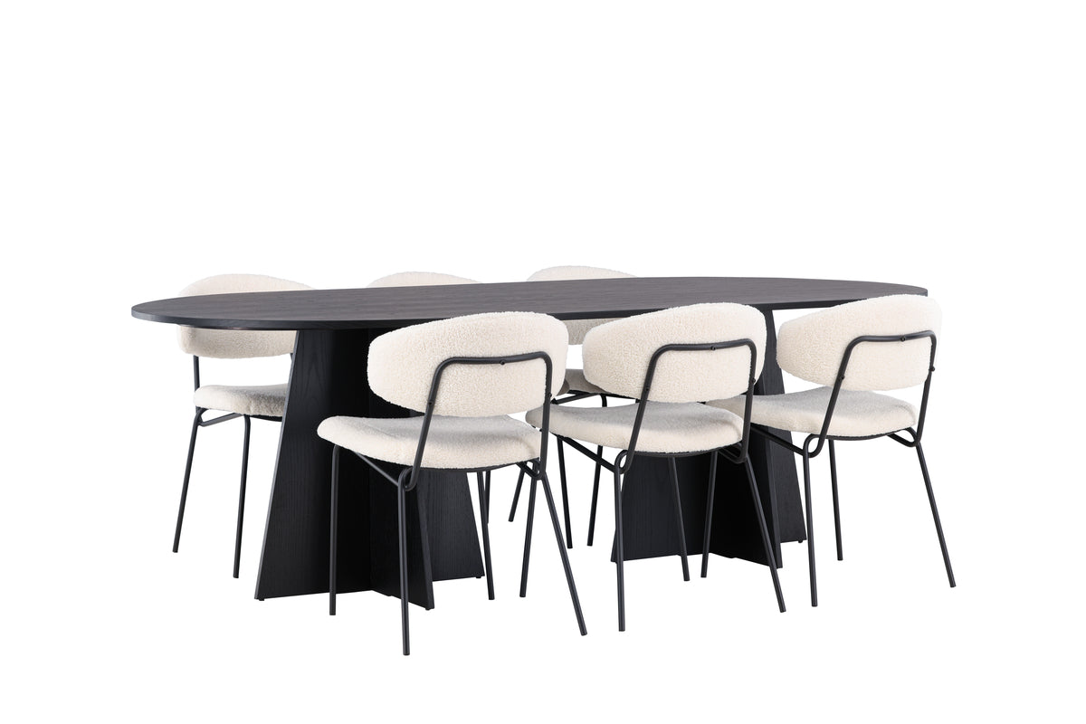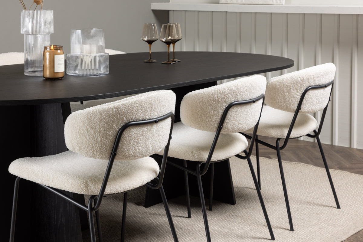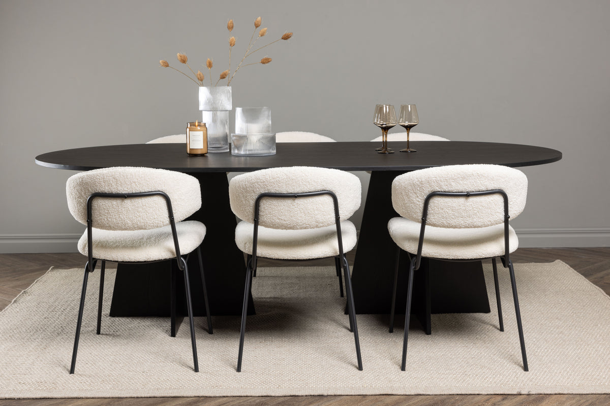 Låt det fluffiga och minimalistiska möta det robusta! Vårt ovala matbord Bootcut har en unik design med en oval bordsskiva i svart MDF med faner och en säregen stomme med två konformade ben i öppen design. Här i snygg kombination med våra vita matstolar från serien Chico. Stolen är i vitt boucletyg med en stoppad sits och ryggstöd för extra komfort. Benen är smala i svart stål som ger stolen en luftig känsla. En underbar kombination som är helt i linje med trenderna just nu! Bordets mått: 230x115cm.