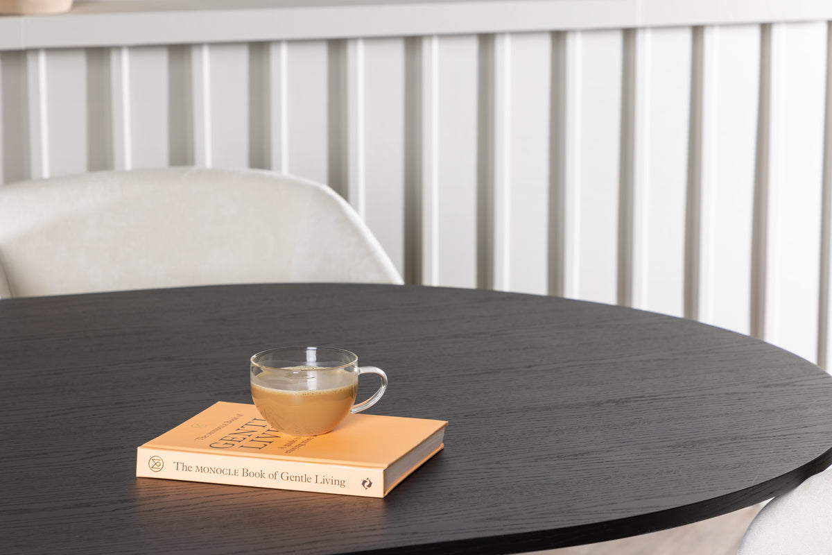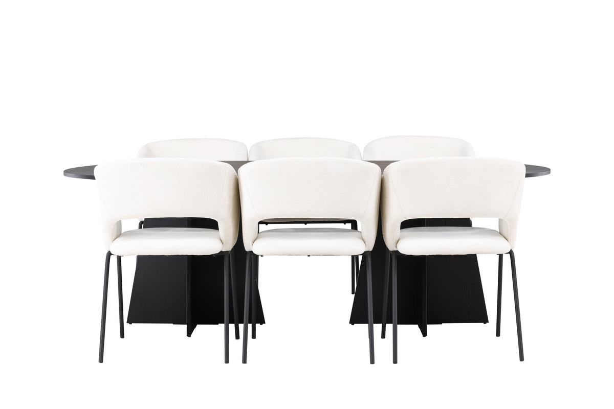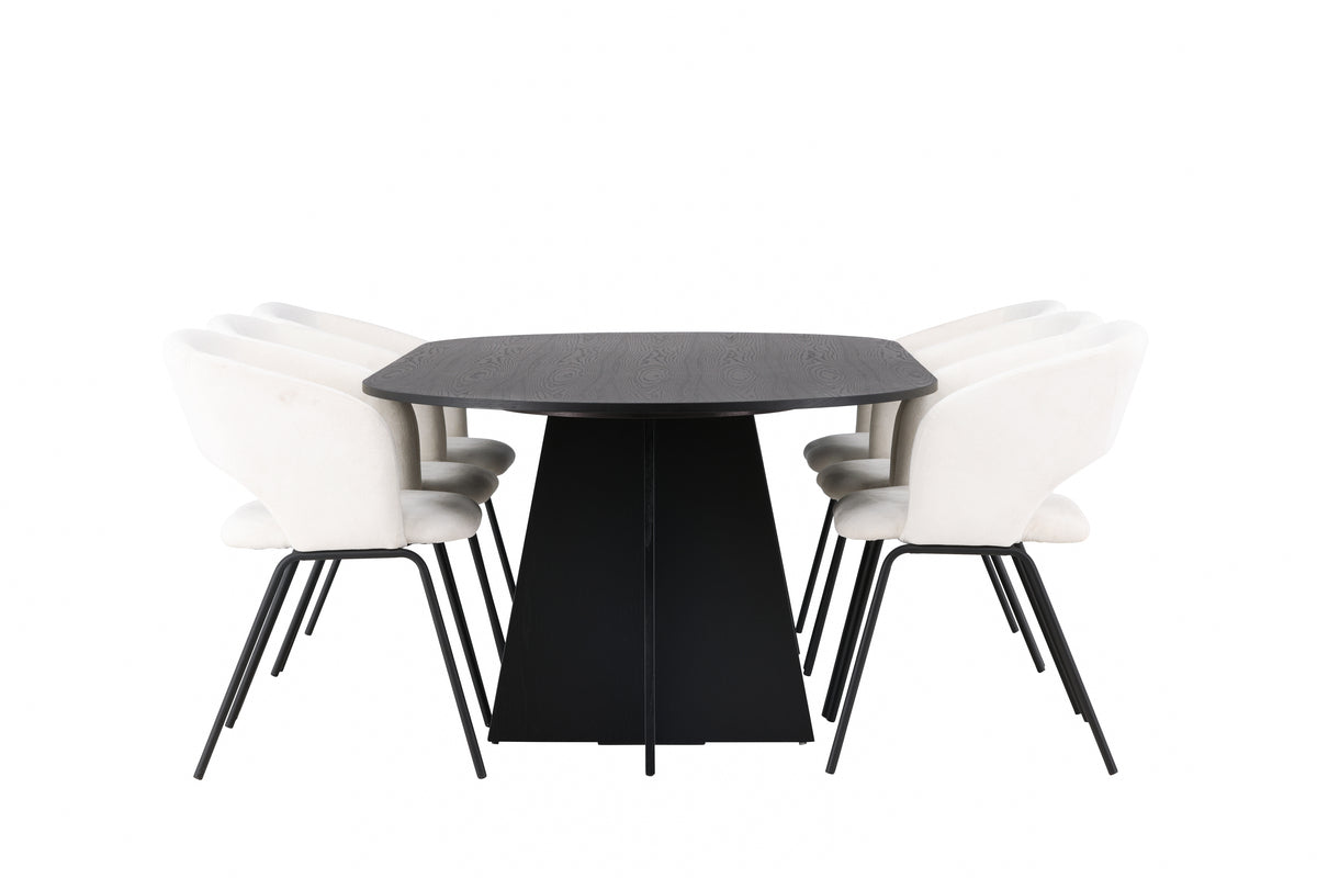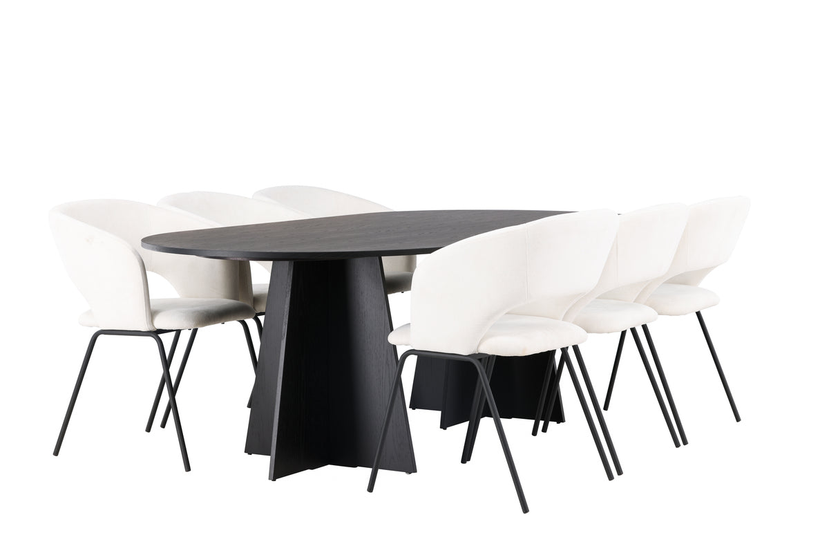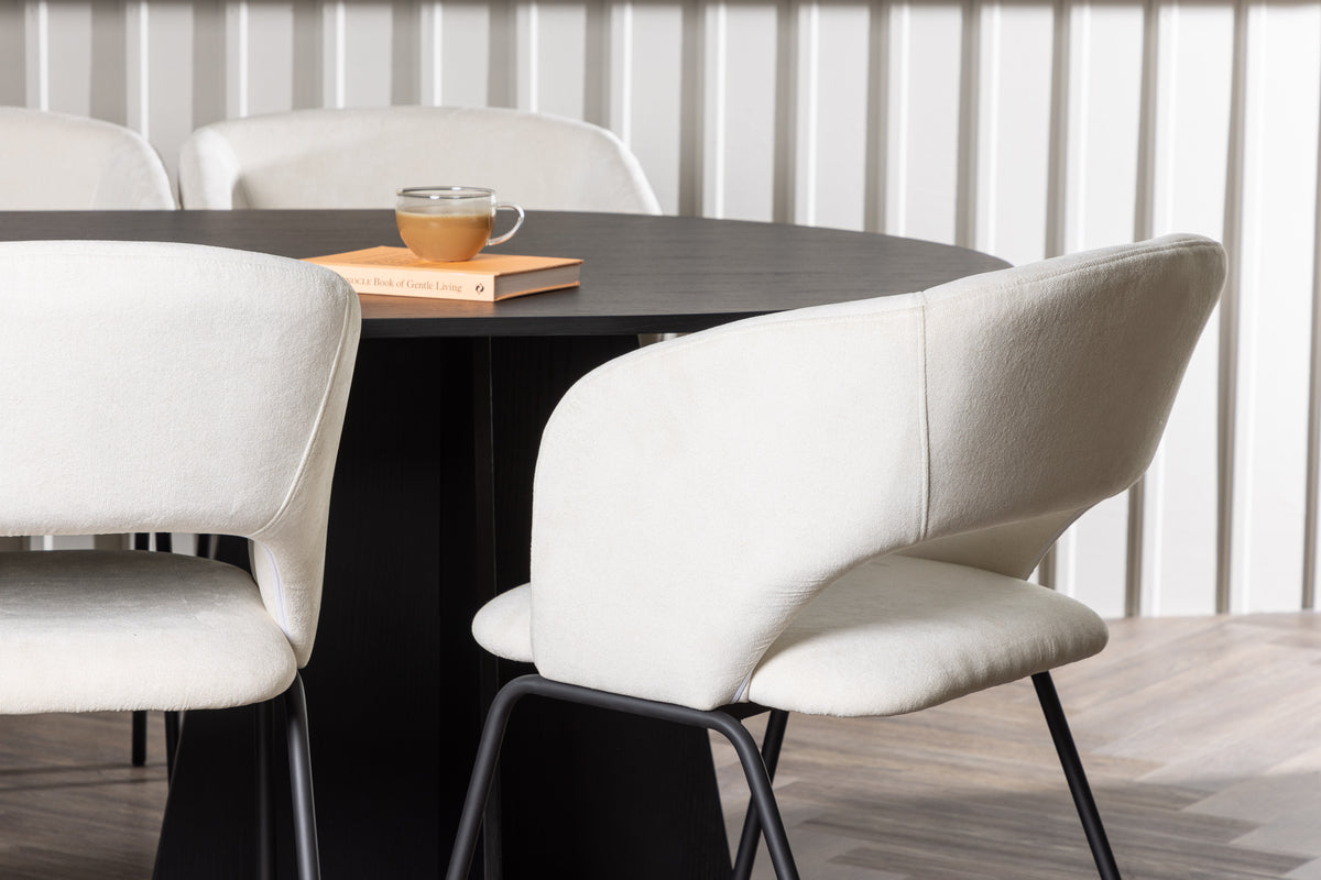 Upplev den perfekta balansen mellan stil och funktionalitet med vår inbjudande matgrupp som kombinerar bordet Bootcut och de stilrena matstolarna Day! Vårt ovala matbord Bootcut har en svart MDF-bordsskiva med faner som ger en modern touch till din inredning. Den skapar en perfekt kontrast mot den robusta och iögonfallande stommens två konformade ben. Det perfekta matbordet både till vardags och festliga tillfällen. Bordets mått: 115x230cm. Tillsammans med det svarta matbordet Bootcut kommer våra otroliga matstolar från serien Day. Med sin genomtänkta design, mjuka former och minimalistiska struktur utstrålar stolarna en tidlös elegans. Stolarnas helklädda sits i vitt linnetyg och det öppna ryggslutet ger inte bara en komfortabel sittupplevelse, utan också en känsla av lyx och modernitet. Stolsbenen, tillverkade av svart stål, adderar en subtil touch minimalism till helhetsintrycket. Skapa en atmosfär av stil och inbjudande elegans i ditt vardagsrum med den här läckra matgruppen. Här kan du sitta bekvämt och bjuda in till många sociala stunder framöver!