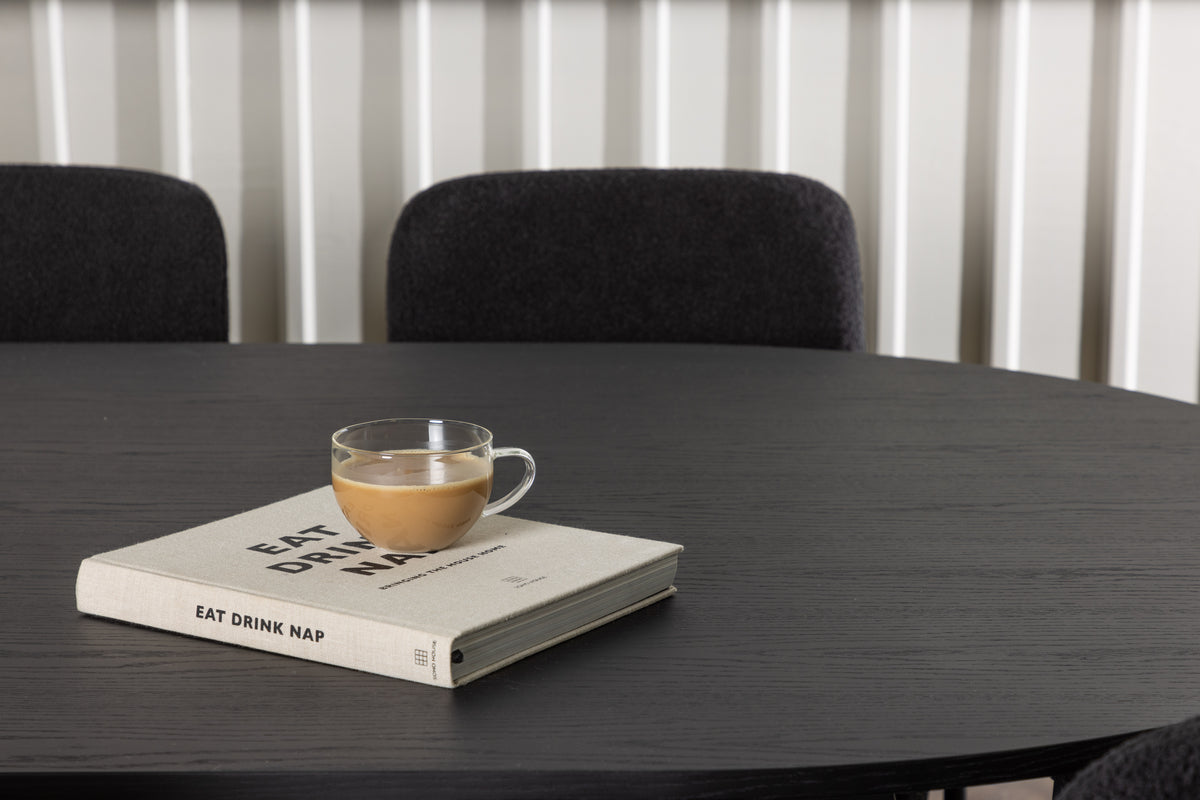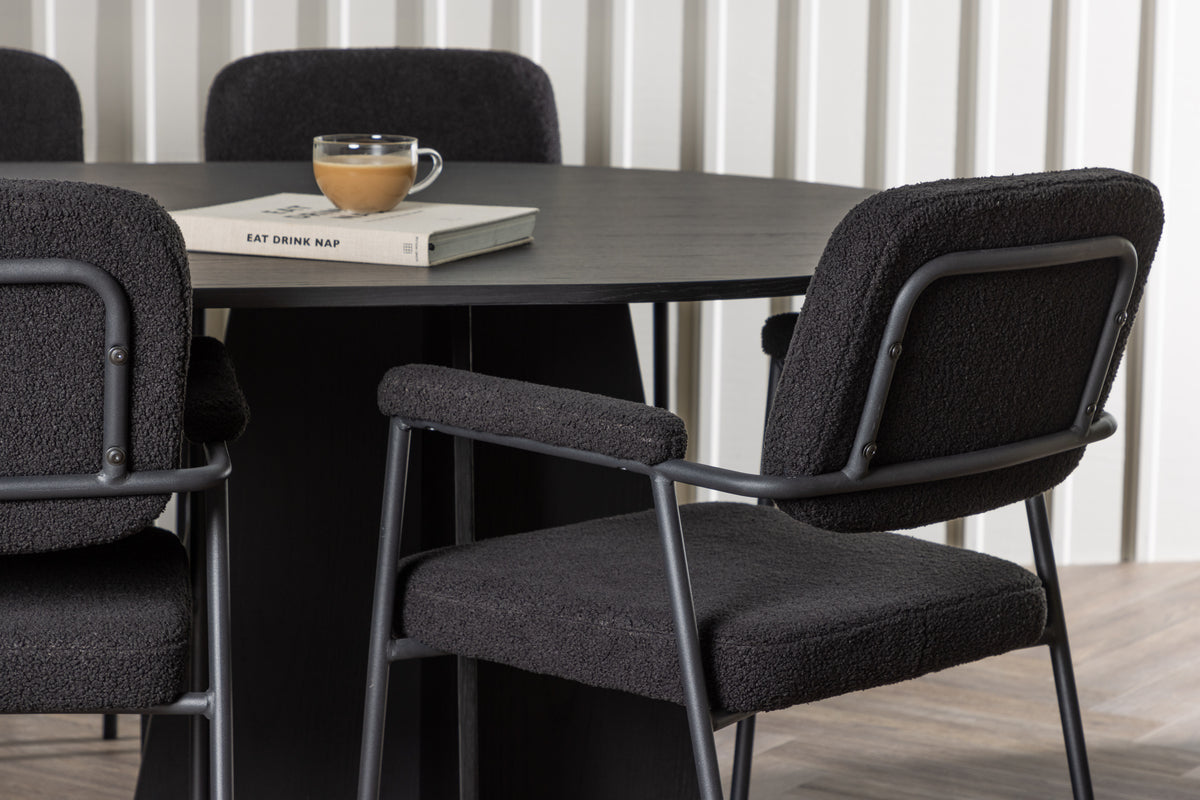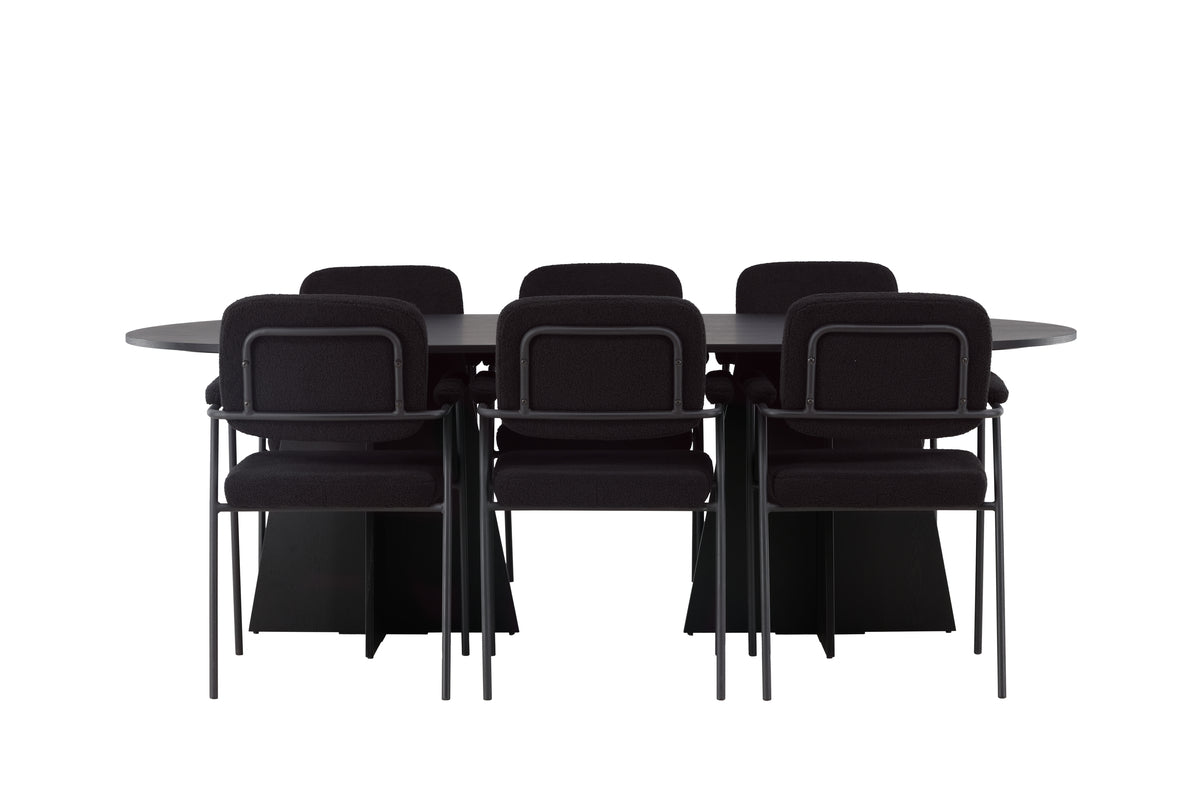 Det ska kännas lyxigt att komma hem till en god måltid. Här kombinerar vi den skandinaviska stilen med robusta former och stilrena kontraster! Det ovala matbordet Bootcut kommer att bli den perfekta mittpunkten i ditt vardagsrum. Den tunna och minimalistiska bordsskivan i svart MDF med faner skapar en smakfull kontrast till den robusta och säregna stommen med sina två konformade ben i en öppen design. Bordets mått: 115x230cm. För att göra matgruppen komplett har vi här matchat med våra moderna matstolar från serien Yesterday. Stolarnas skandinaviska design och charmiga utseende kommer att imponera på både dig och dina gäster. Stolarna har en helklädd sits i svart bouclétyg som ger en touch av lyx och elegans till varje måltid. De smala stolsbenen med integrerade armstöd i svart metall ger en modern och snygg känsla. Den här matgruppen kompromissar inte med komforten. Stolarnas sits är stoppad för extra bekvämlighet och ser till att varje måltid blir en njutning när du slår dig ner i dessa mjuka och sköna stolar!