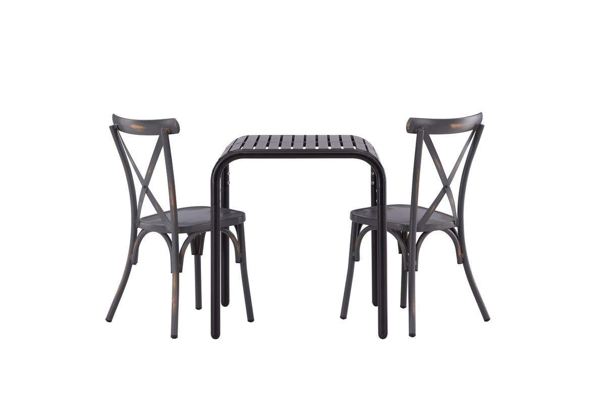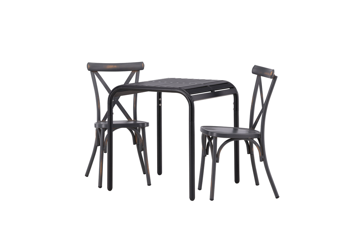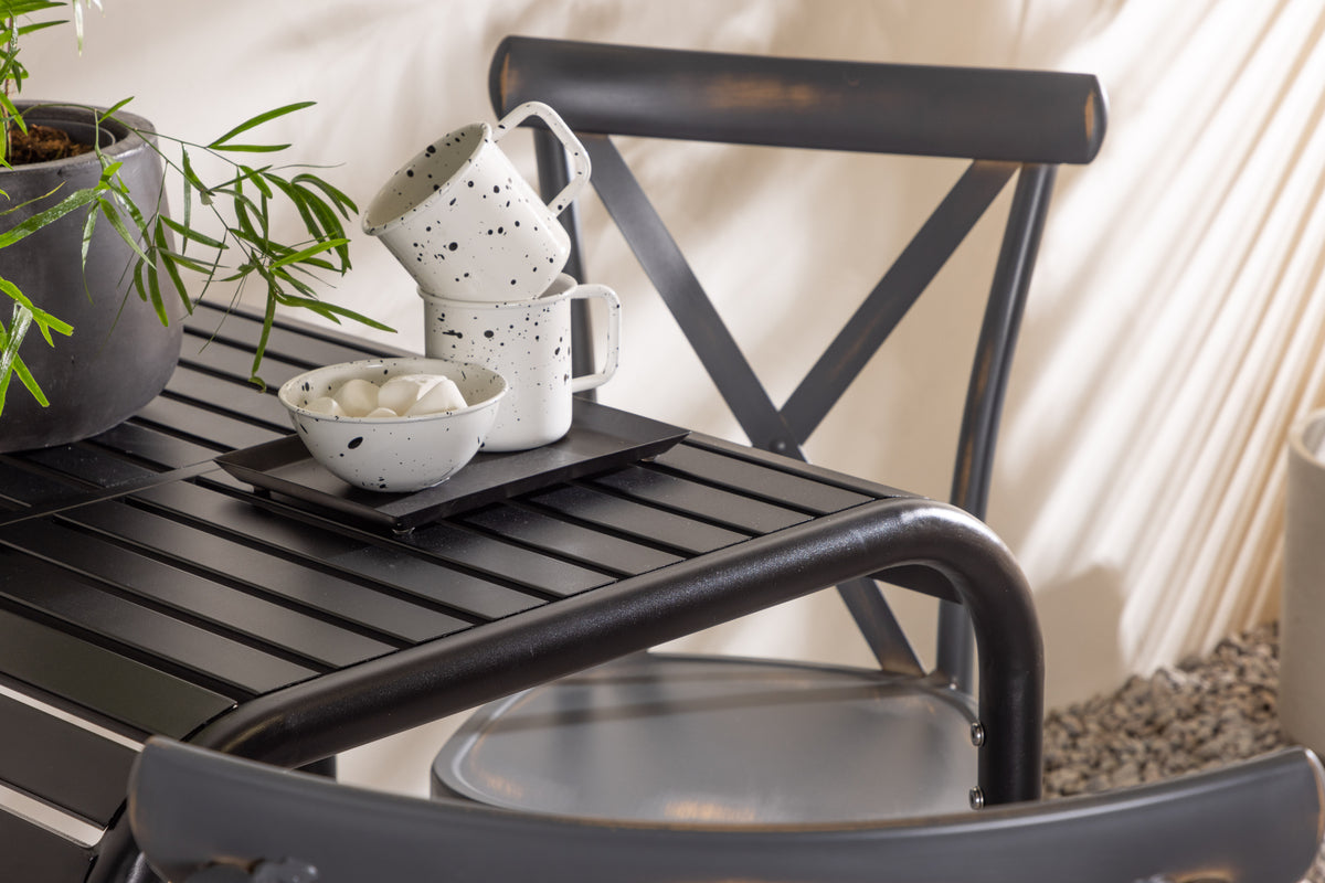 Den här cafégruppen är lika matchande som tidlös! Bordet från serien Borneo har följsamma former och en tidlös Skandinavisk design. Bordsskivan är ribbad och böljar ner längs kanterna vid benen. Genomgående tillverkat i svart aluminium vilket ger dig ett slitstarkt bord som är enkelt att flytta omkring på. Här i läcker kombination med 2st matstolar från serien Tablas. Stolen har ett kryssat ryggstöd och lätt utsvängda ben för ett stadigt intryck. Genomgående tillverkad i aluminium i en sotig mörkgrå kulör. Skapa ett modernt blickfång på din altan!