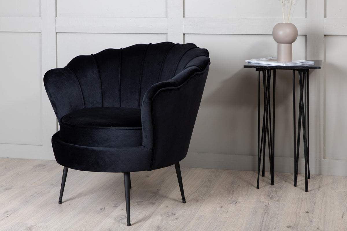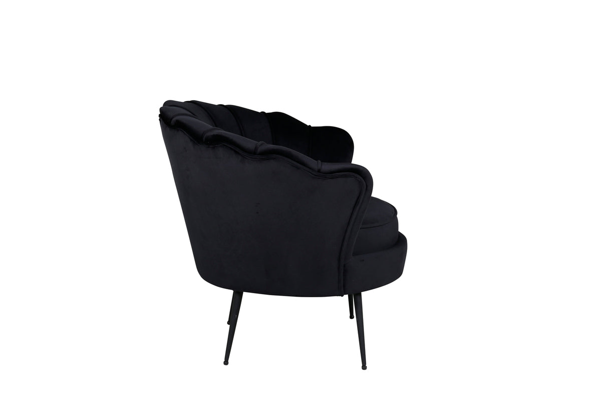 En kaxig stilikon kan enkelt lyfta inredningen till nästa nivå! Calais fåtölj är en modern favorit som skapar ett inbjudande blickfång och modemedveten atmosfär. Den har en stilfull design med dekorativ snäckformad rygg med dekorsömmar och en rund sits, genomgående i svart sammetstyg som skapar ett elegant lyster till rummet. Benen är lätt utsvängda i svart pulverlackerad metall. Placera solitär eller matcha med soffgruppen i samma serie! Tips för Sammetsklädsel: Sammet har en tendens till att få tryckmärken när luggen lägger sig ner. Avtrycken kan göra att tyget ser slitet ut, vilket här helt normalt för den här typen av material. Beroende på hur ljuset faller kan tyget skifta i flertalet olika nyanser.