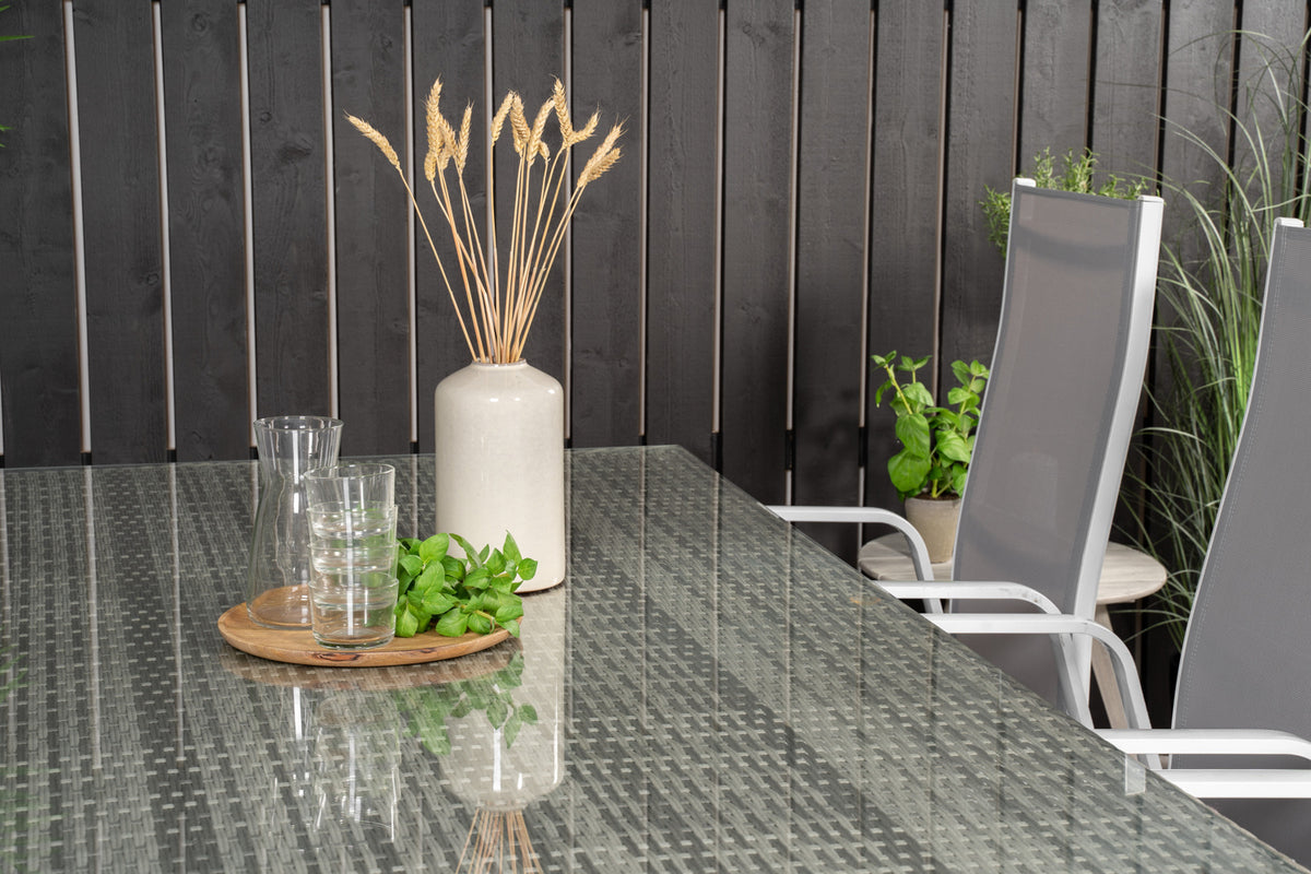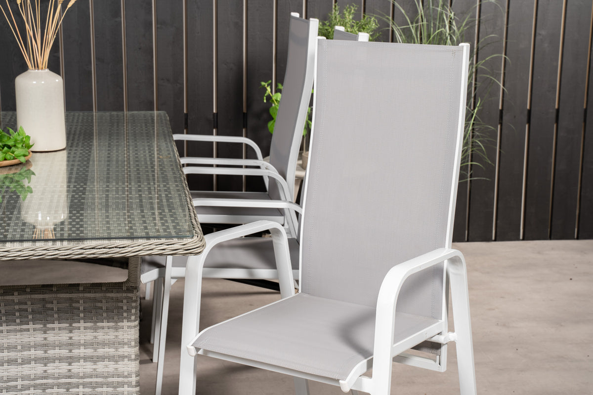 Vitgrå stapelbar karmstol från serien Copacabana som gör sig bra vid matbordet på altanen. Stolens ryggstöd går att fälla vilket gör att den är väldigt bekväm och praktisk. Njut av sommaren på allra bästa sätt! Skötselråd: Textilene är ett syntetiskt tyg som är tillverkat av PVC-behandlad polyester. Materialet är vattenresistent och UV-behandlat för att motverka solens blekning. Rengöring bör göras ungefär en gång i månaden, använd en fuktig trasa och torka av.