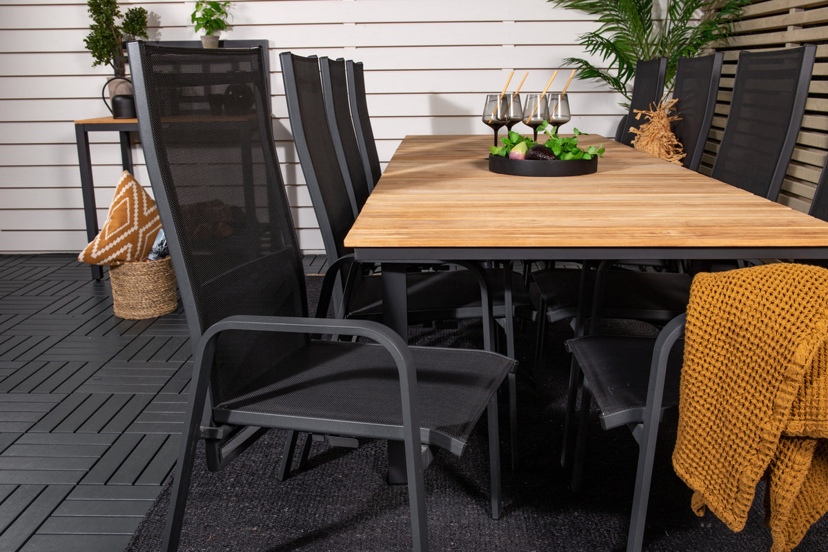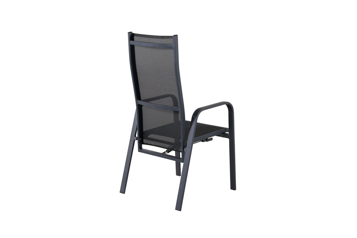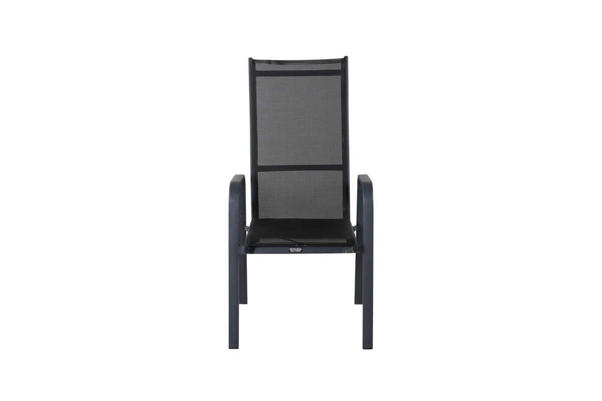 Copacabana, en modern stapelbar karmstol i svart kulör som gör sig utmärkt vid matbordet på altanen. Stolens ryggstöd går att fälla vilket gör att den är väldigt bekväm och praktisk. Njut av sommaren på allra bästa sätt! Skötselråd: Textilene är ett syntetiskt tyg som är tillverkat av PVC-behandlad polyester. Materialet är vattenresistent och UV-behandlat för att motverka solens blekning. Rengöring bör göras ungefär en gång i månaden, använd en fuktig trasa och torka av.