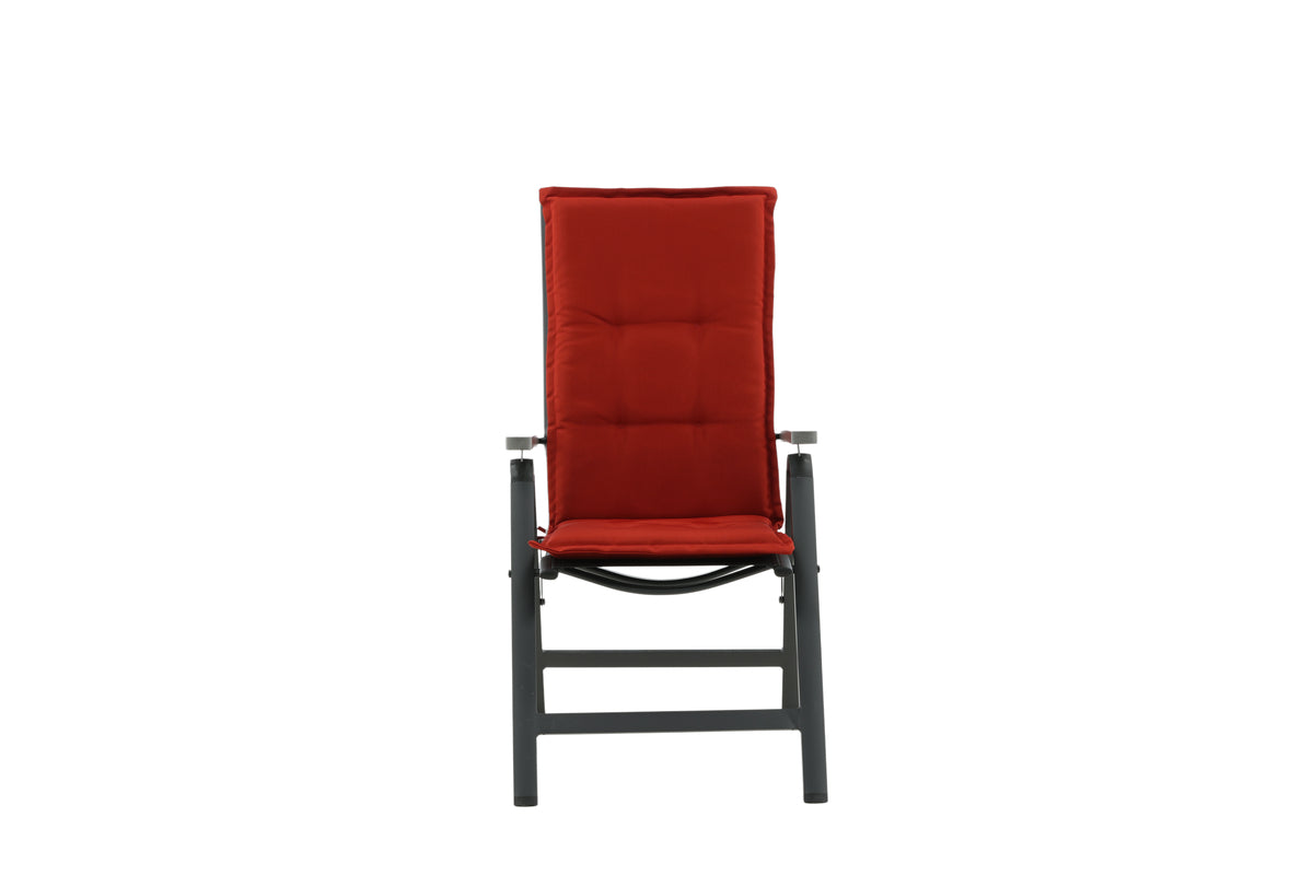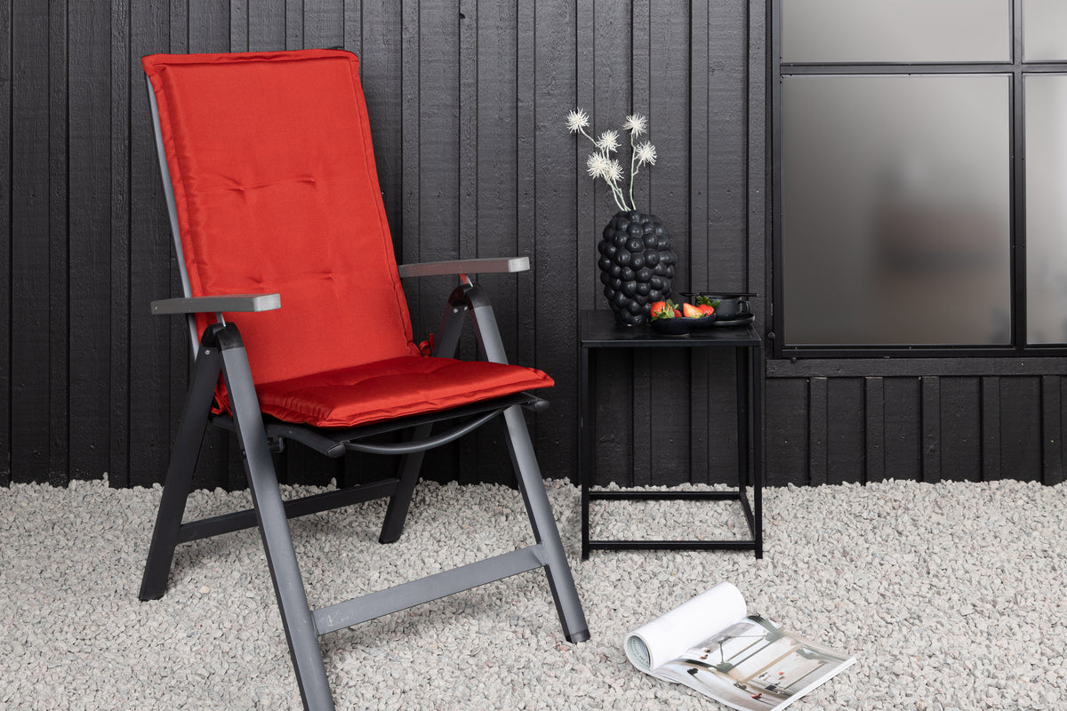 Sitt lite extra bekvämt i din utegrupp! Den här röda stolsdynan är anpassad för våra fällbara stolar och den smakfulla kulören piggar upp stämningen på uteplatsen. På baksidan finns det två hängen som hjälper dynan att hålla sig på plats ordentligt. Förläng härliga måltider när du får möjligheten att sitta skönt länge!