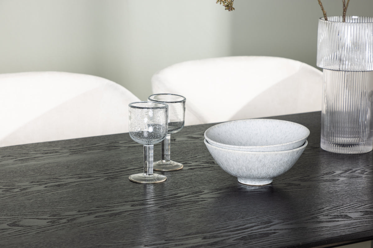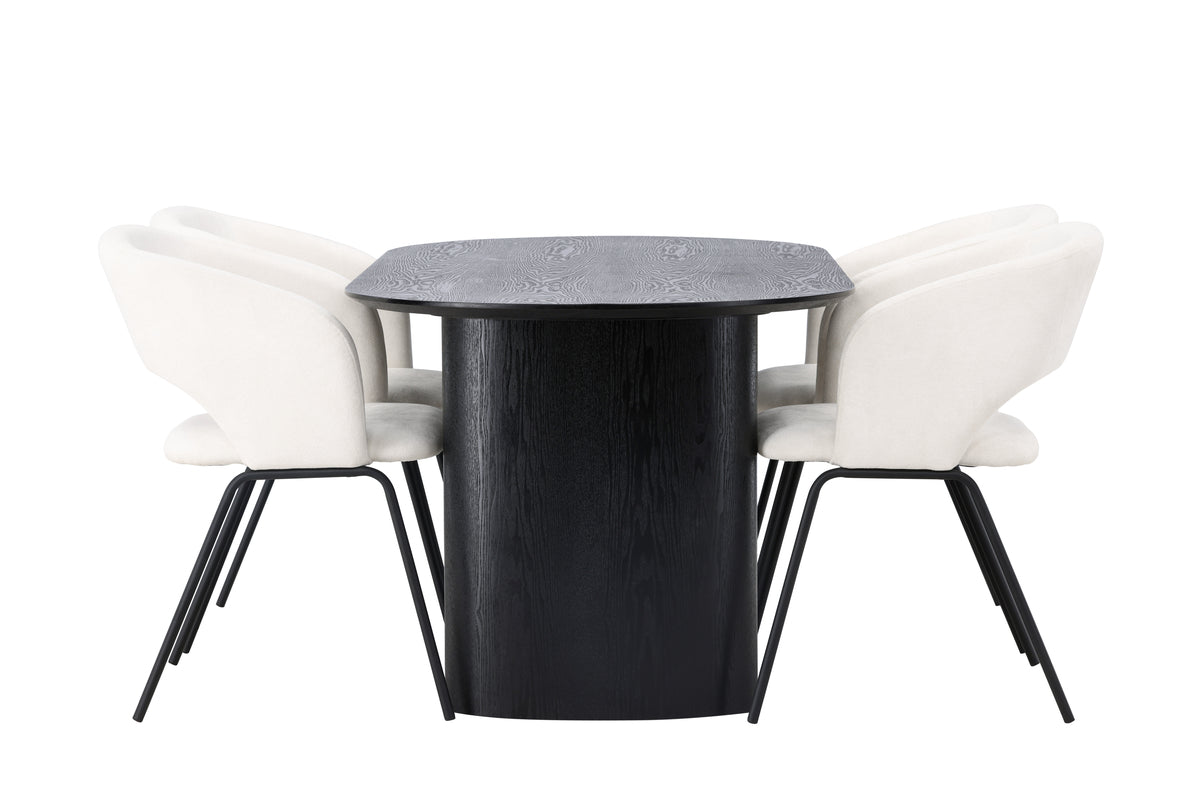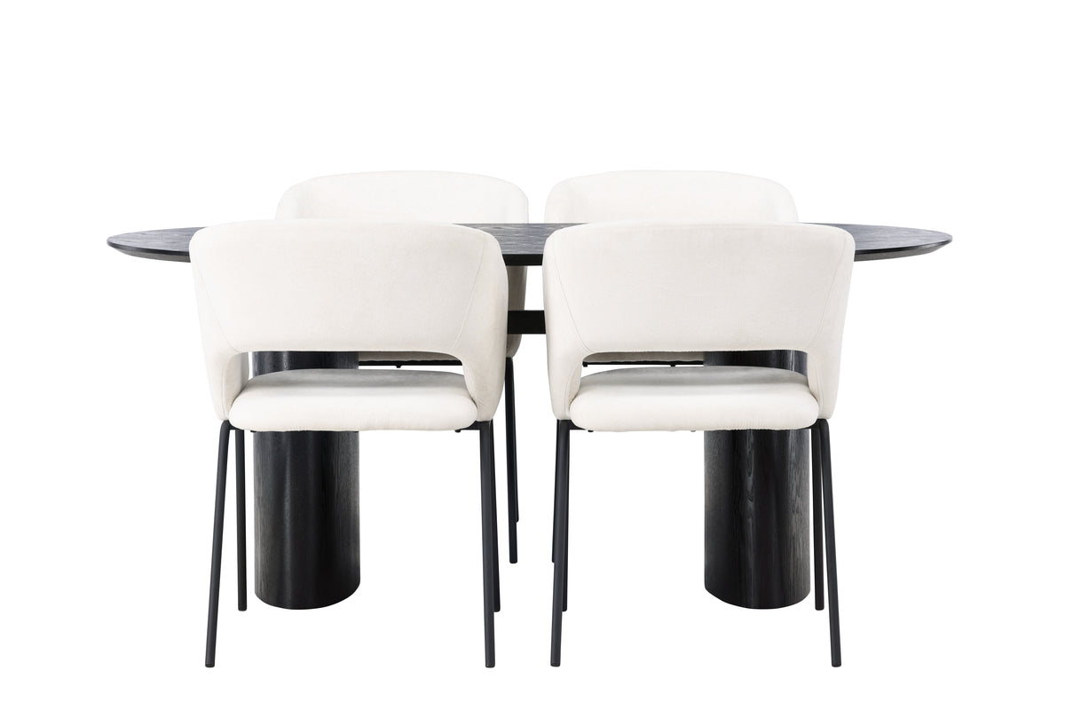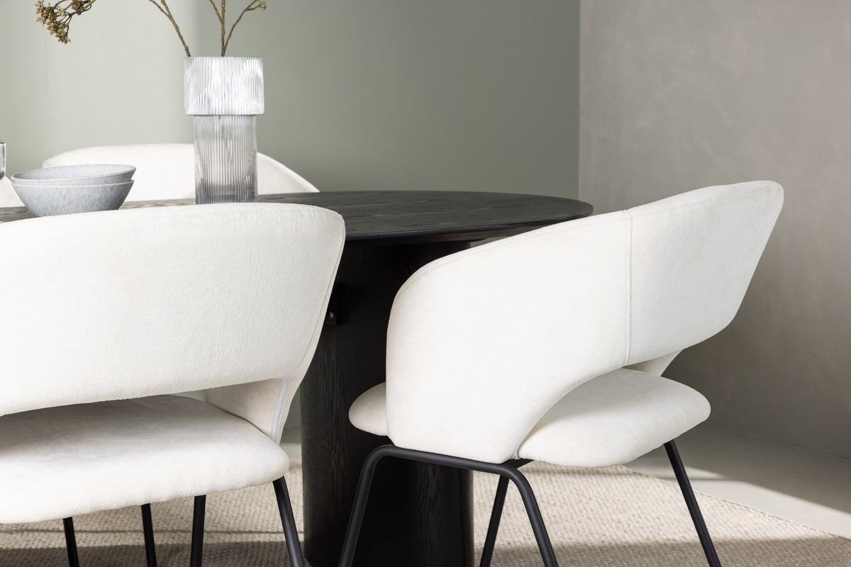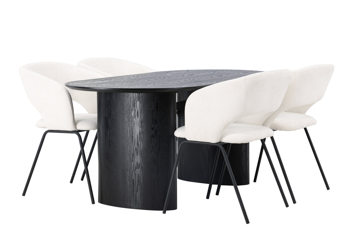 Den här matgruppen utstrålar lyx och komfort! Det ovala matbordet Isolde i svart kulör har en modern utformning med en oval bordskiva i MDF och robust stomme som ger ett stadigt intryck. Det levande materialet ger smakfull rörelse till blickfånget. Här tillsammans med fantastiska matstolar från serien Day. Den helklädda sitsen med öppet ryggslut är i vitt linnetyg och stolsbenen är smala i svart stål. Få ett blickfång som imponerar Bordets mått: 180x75cm.