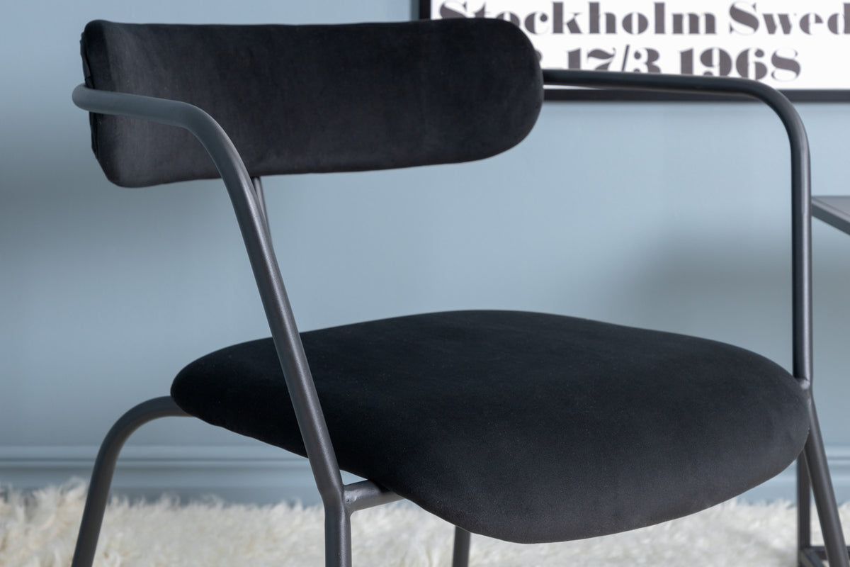 Skapa en modemedveten atmosfär med en fåtölj från serien Duffy! Lika stilren som praktisk fungerar den utmärkt som extra sittplats eller ensam som stilikon. Duffy har en minimalistisk design med stomme, ben samt integrerade armstöd i svart pulverlackerad metall. Ryggen är lätt rundad i samma material som sitsen, svart sammetstyg som är stoppad för extra komfort. Inred ditt hem med en fåtölj designad helt efter trenderna! Tips för Sammetsklädsel: Sammet har en tendens till att få tryckmärken när luggen lägger sig ner. Avtrycken kan göra att tyget ser slitet ut, vilket här helt normalt för den här typen av material. Beroende på hur ljuset faller kan tyget skifta i flertalet olika nyanser.
